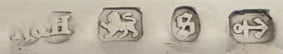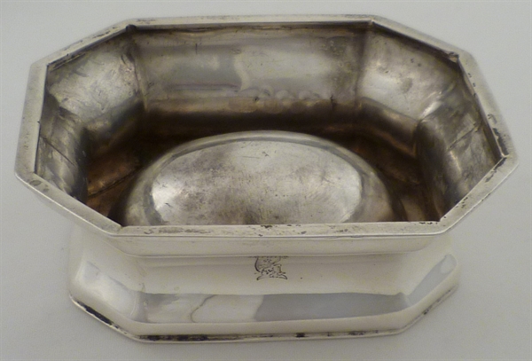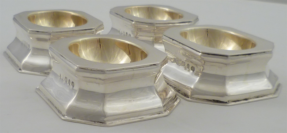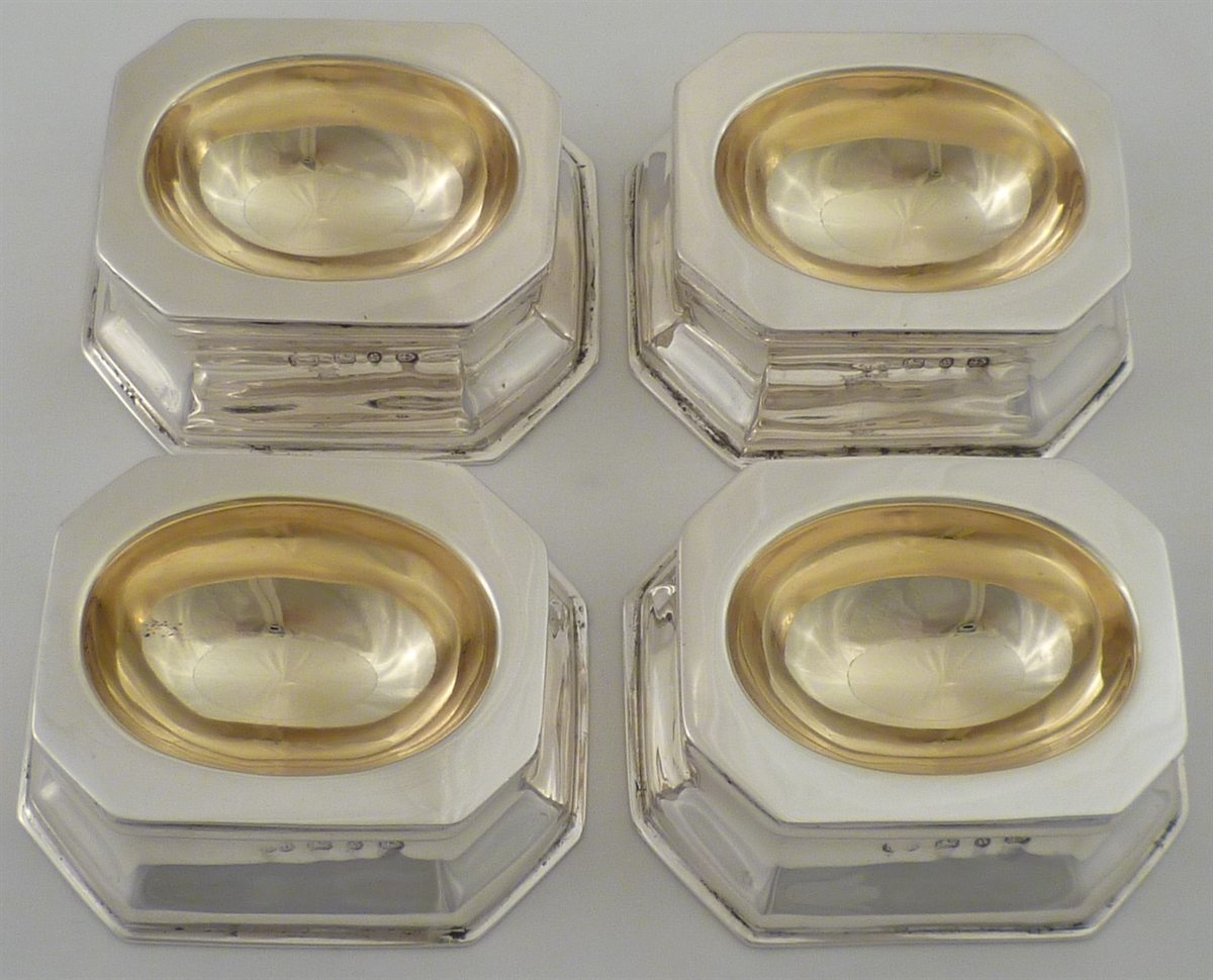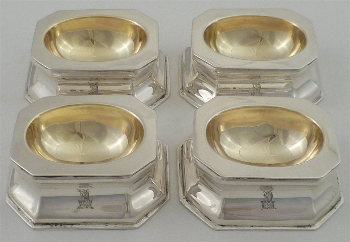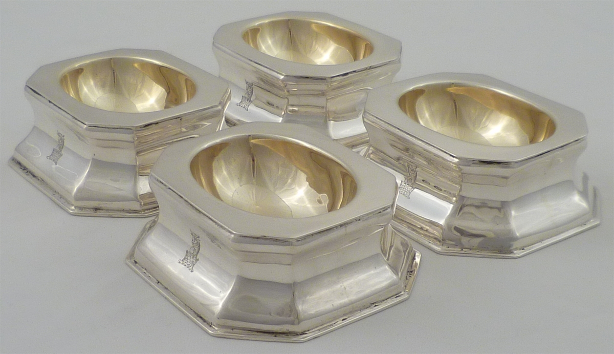 DESCRIPTION | Set of four 1720s style Victorian silver octagonal trencher salts with plain incurved sides and gilded oval central depression. Good crest engraving to one side. |