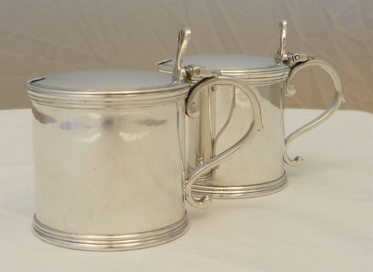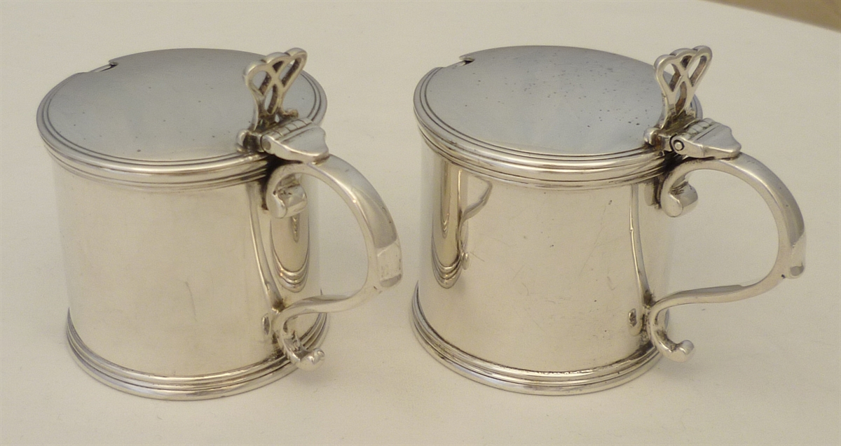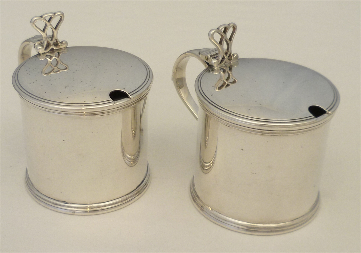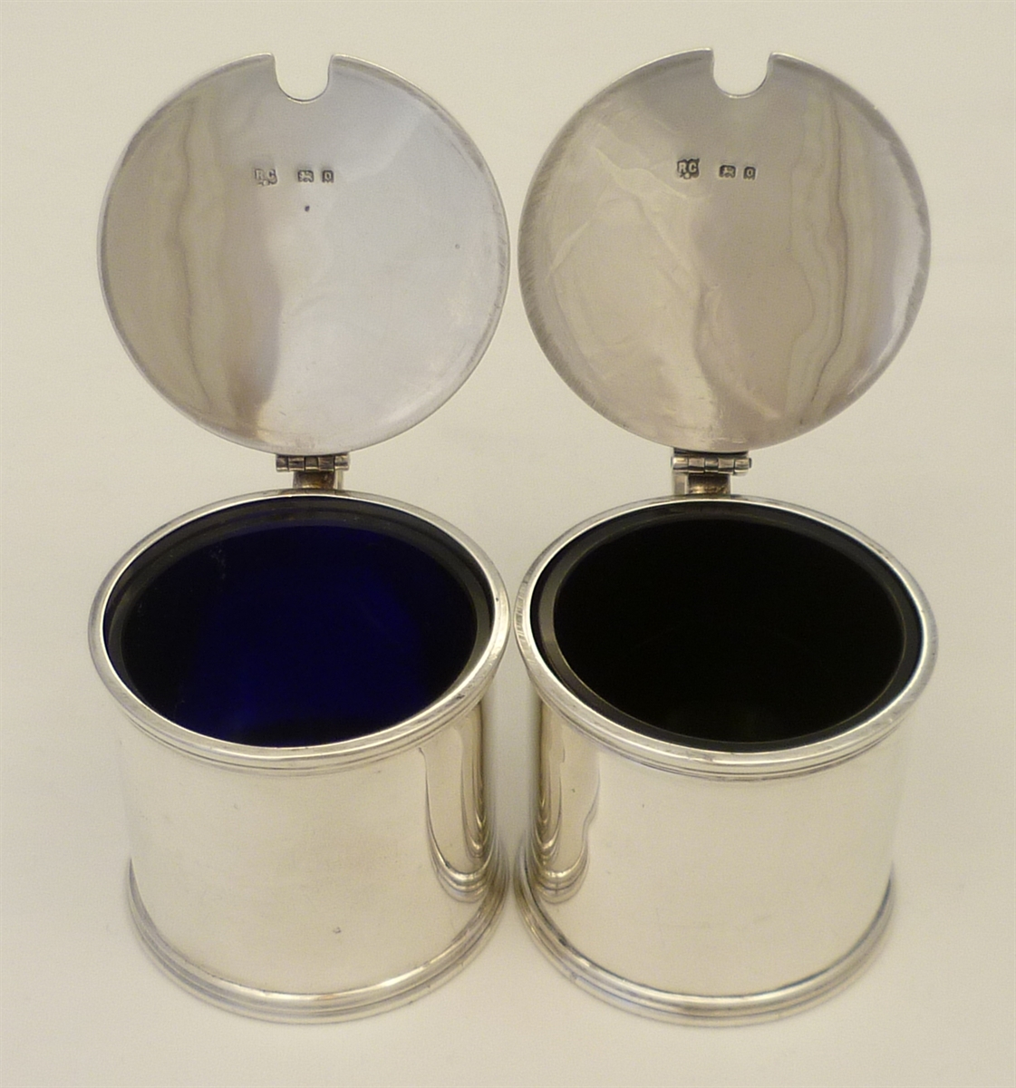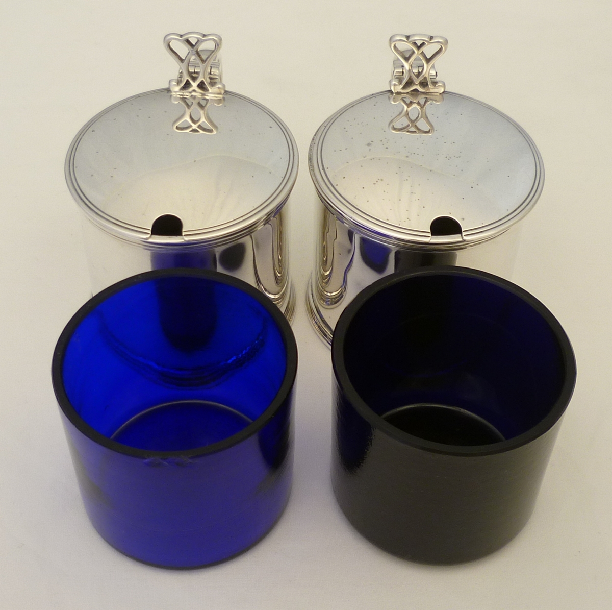 DESCRIPTION | Pair of good quality solid sterling silver mustard pots with blue glass liners. |