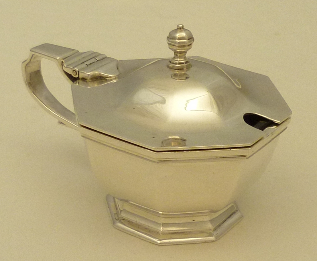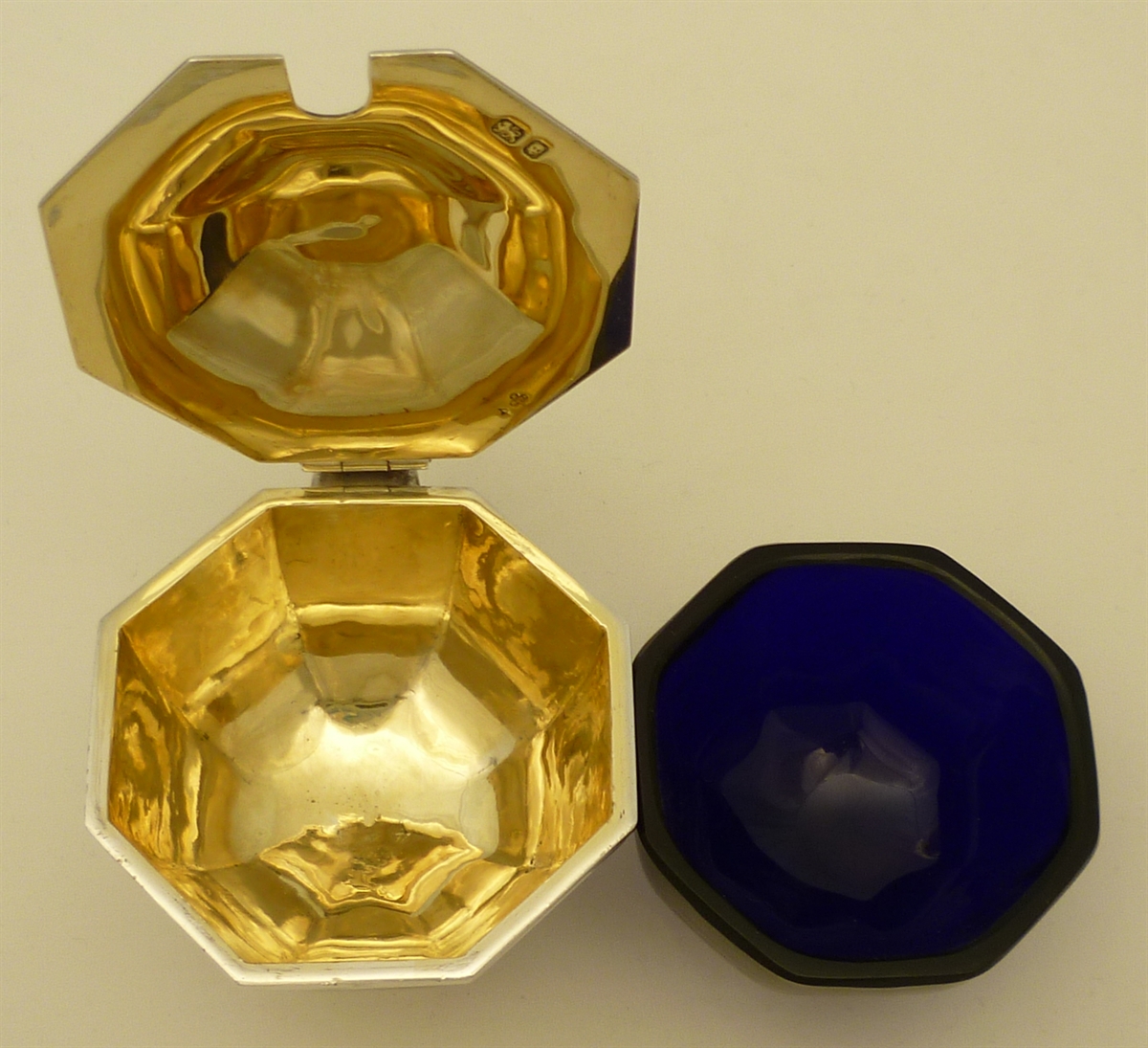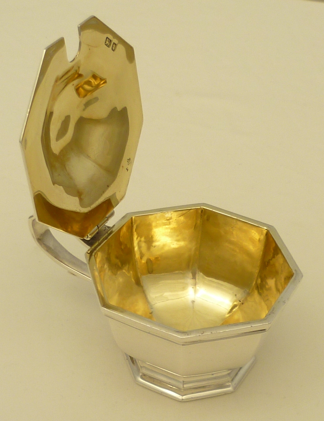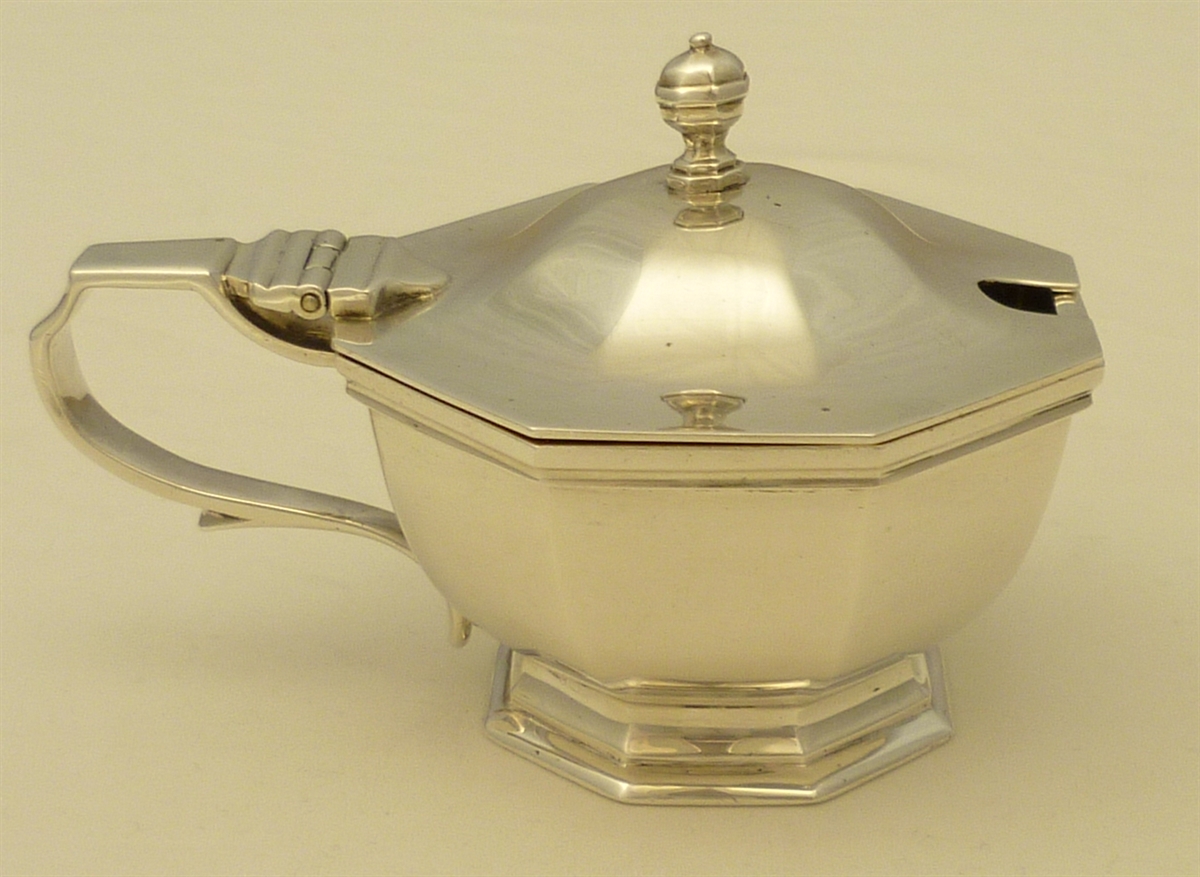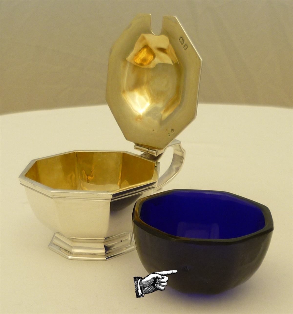 DESCRIPTION | High quality and heavy solid sterling silver mustard pot with expensive custom made blue glass liner and richly gilded interior. There is a natural flaw to the glass liner (follow the finger) and for the best fit this should be placed away from the handle and under the spoon slot. It would be best for the gilded silver surface, in my opinion, if you choose to use without the glass liner that the pot be rinsed with very mild soap and clean water within a few hours following use. |