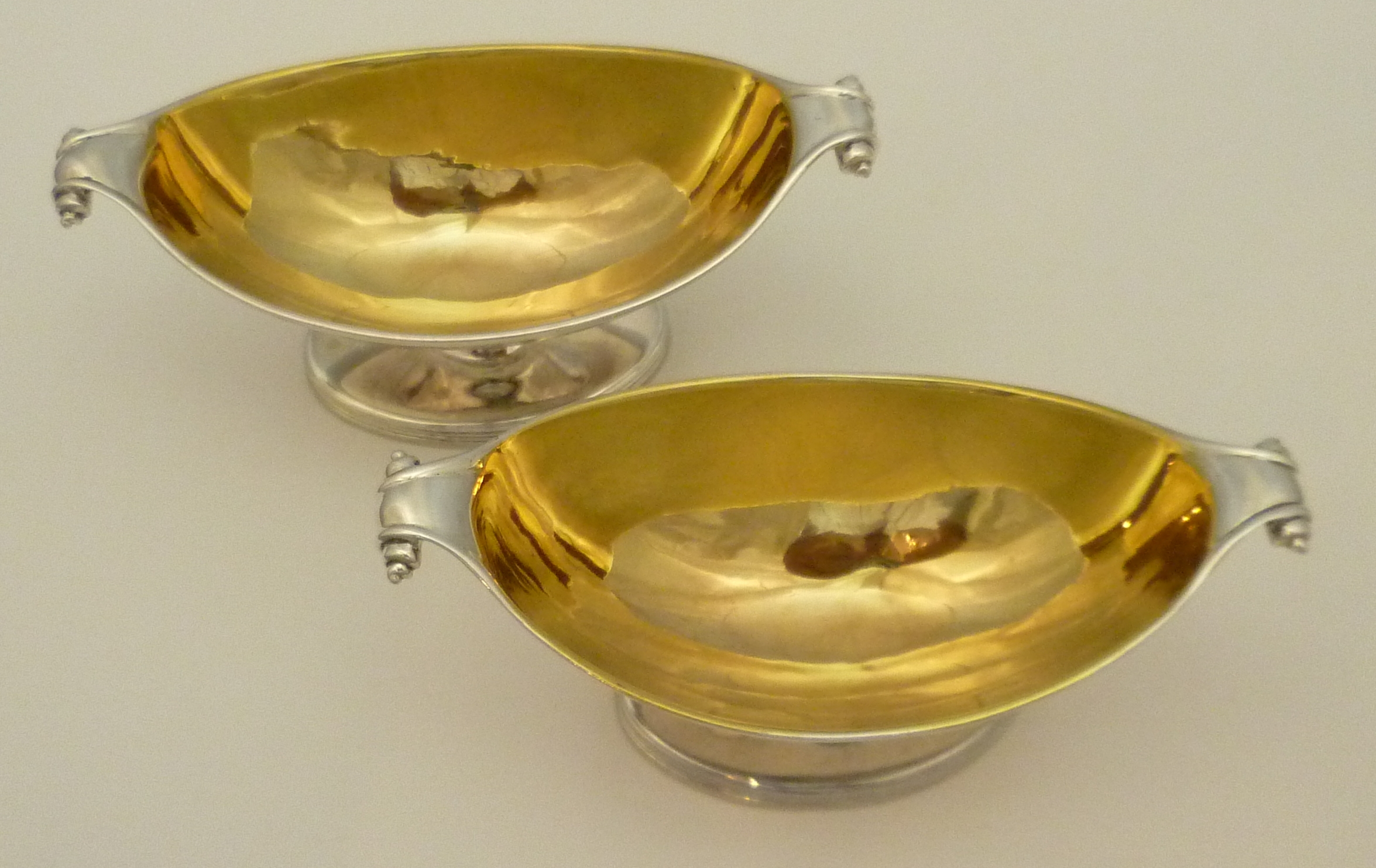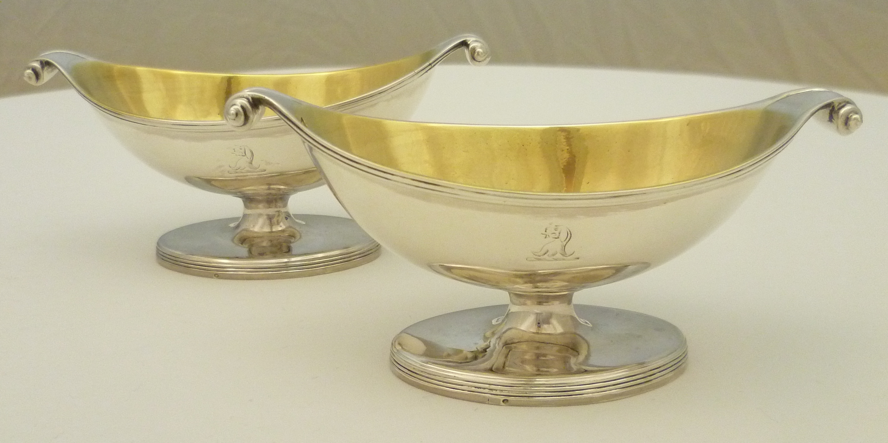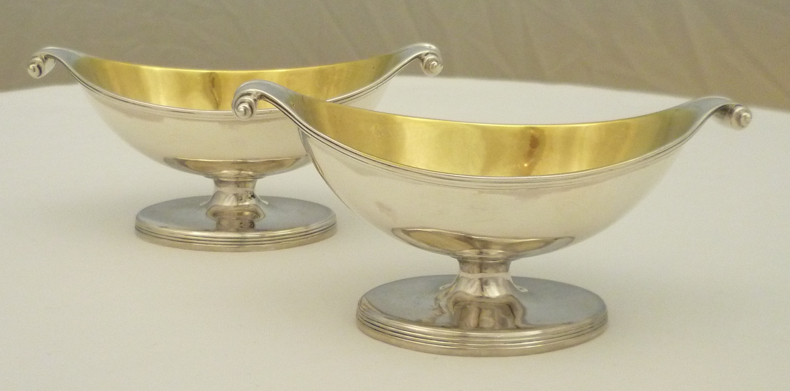 DESCRIPTION | Excellent pair of Georgian solid sterling silver navette pedestal salts with fully gilded interiors, crest to one side and thread decoration. Hallmarks struck within the base so still beautifully clear and additional tiny swan French import mark to each base. |