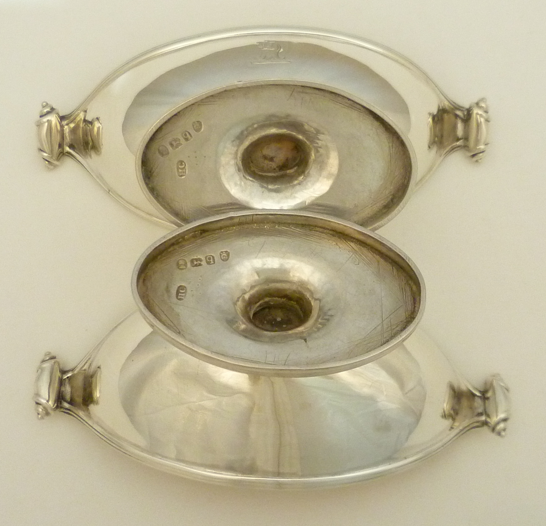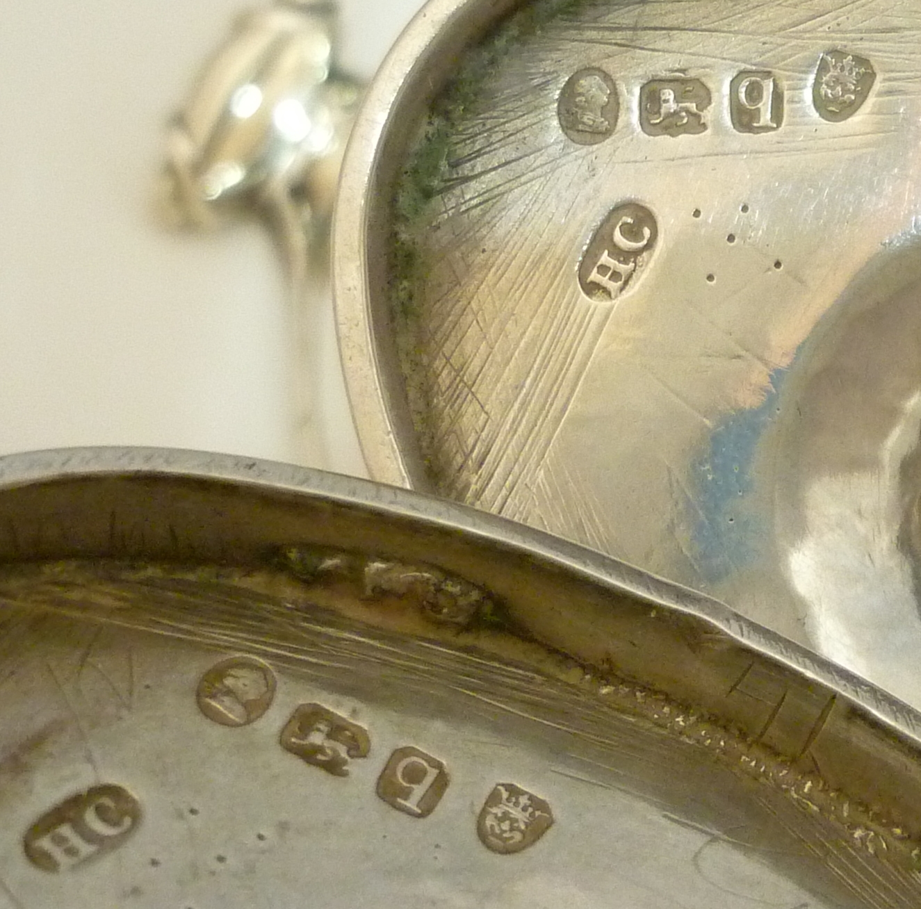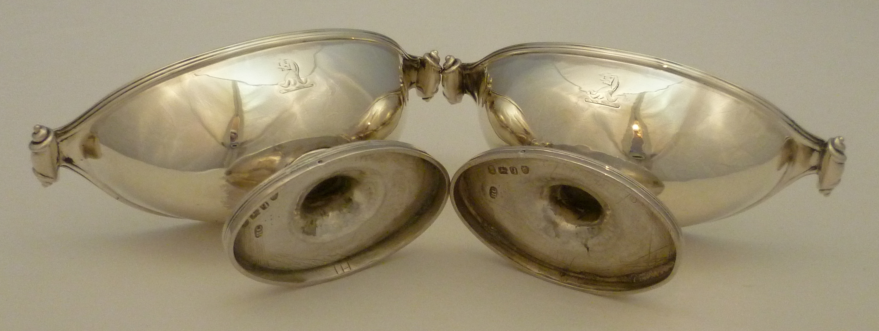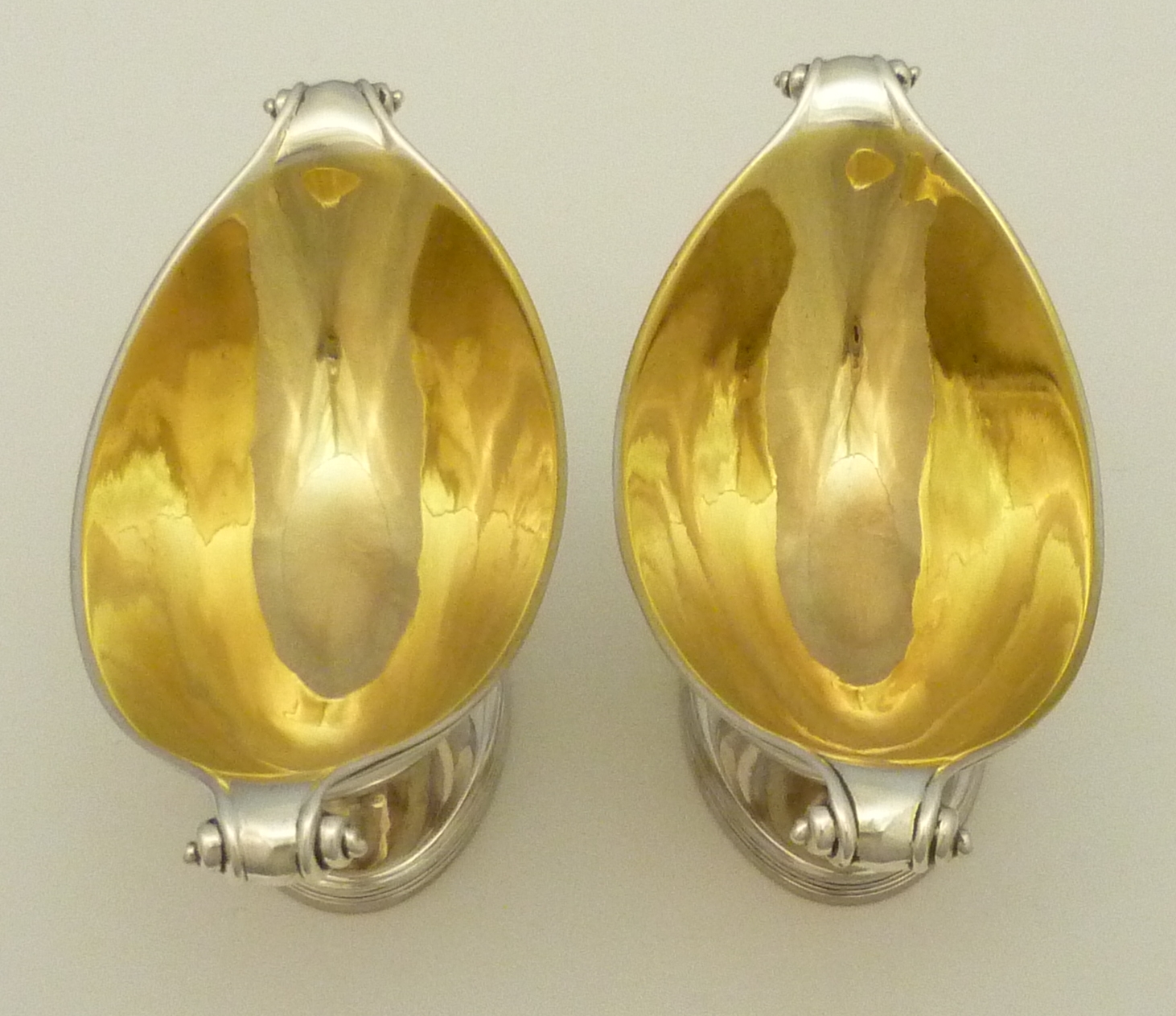 DESCRIPTION | Excellent pair of Georgian solid sterling silver navette pedestal salts with fully gilded interiors, crest to one side and thread decoration. Hallmarks struck within the base so still beautifully clear and additional tiny swan French import mark to each base. |