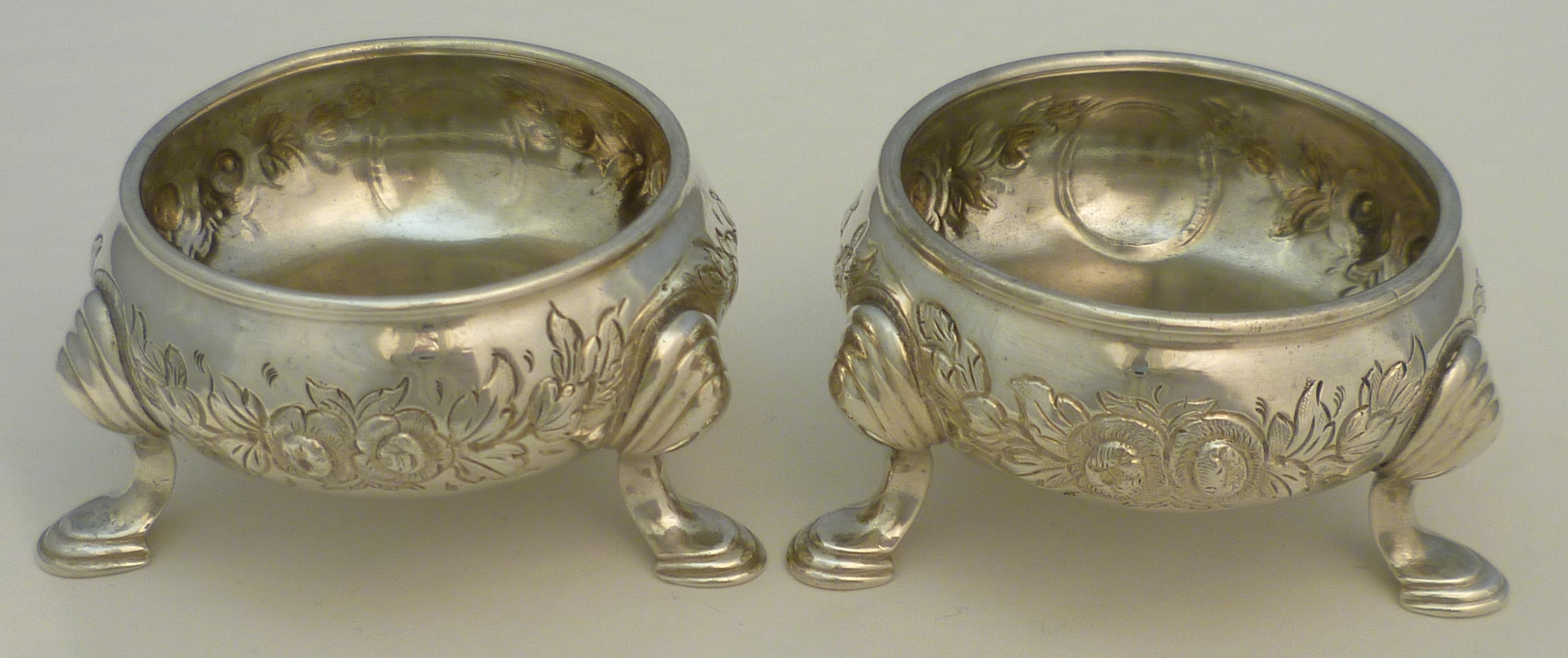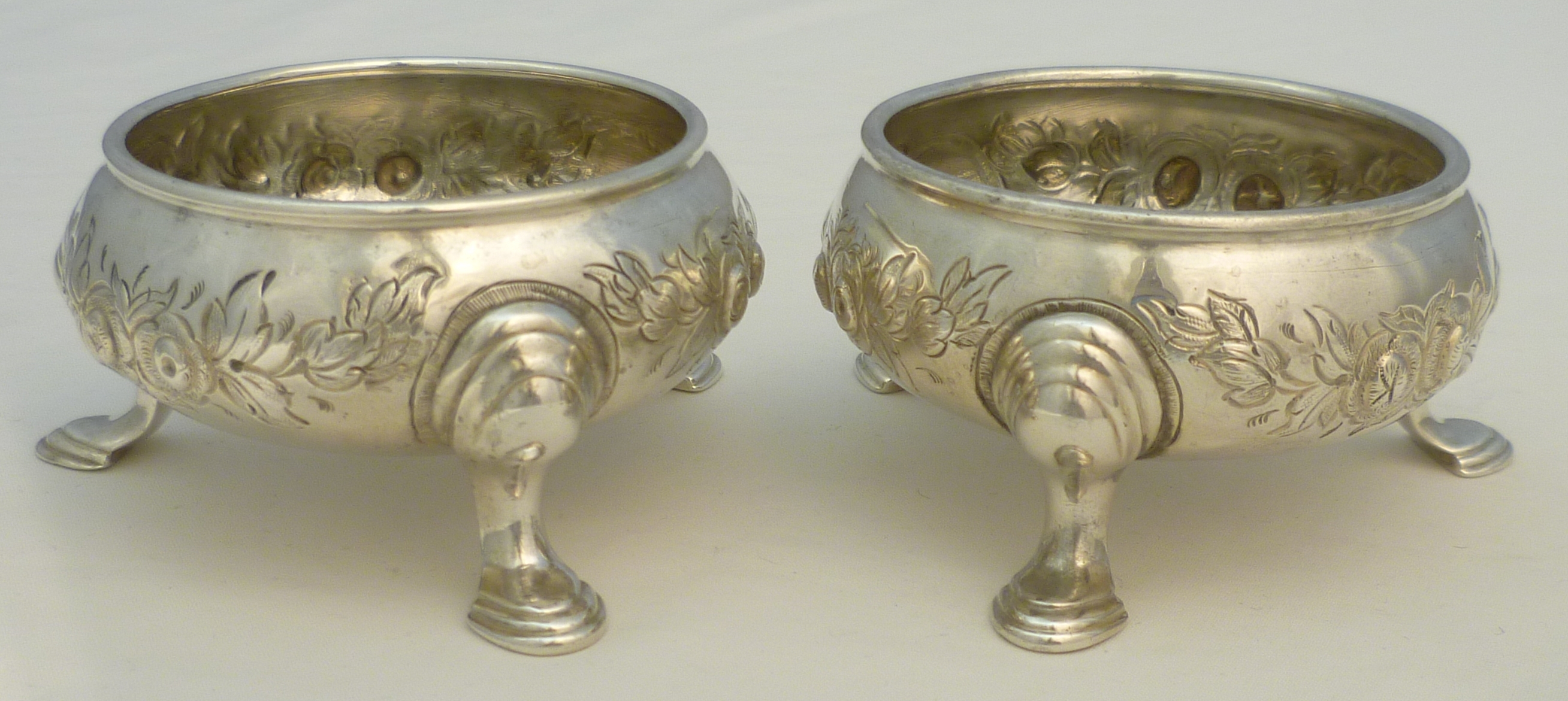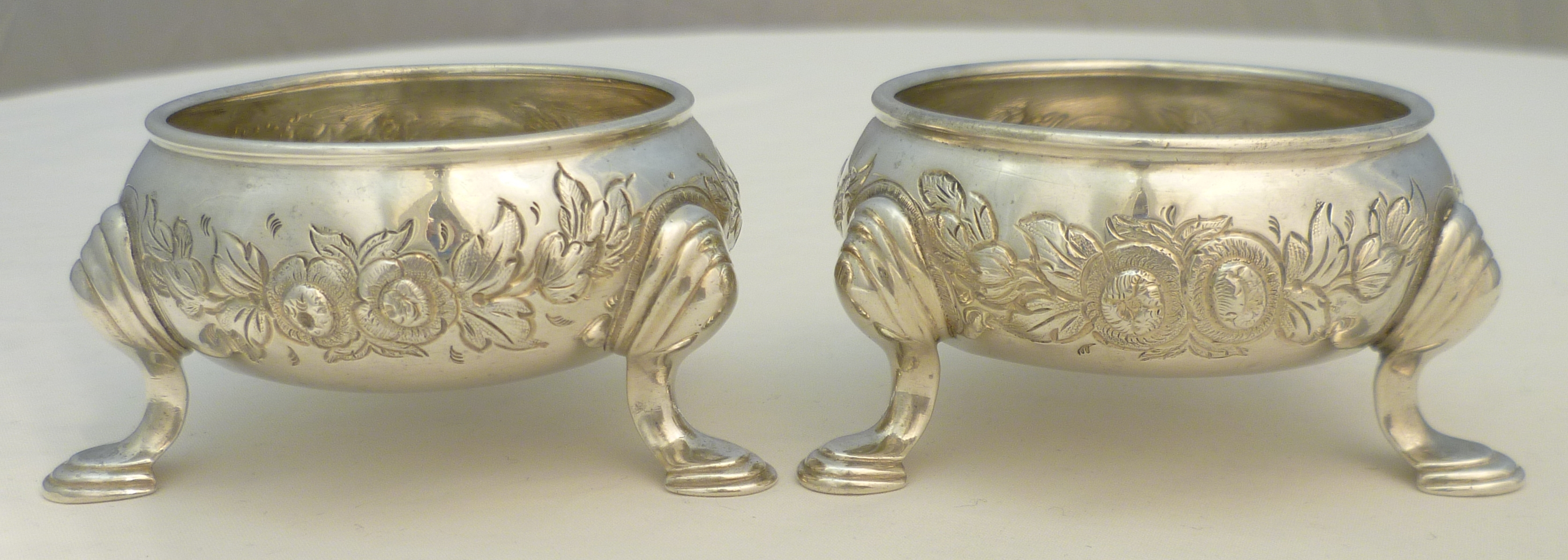 DESCRIPTION | Heavy and robust pair of George II solid sterling silver cauldron salts with embossed and engraved decoration, hoof feet. Very similar to salts m7639. |