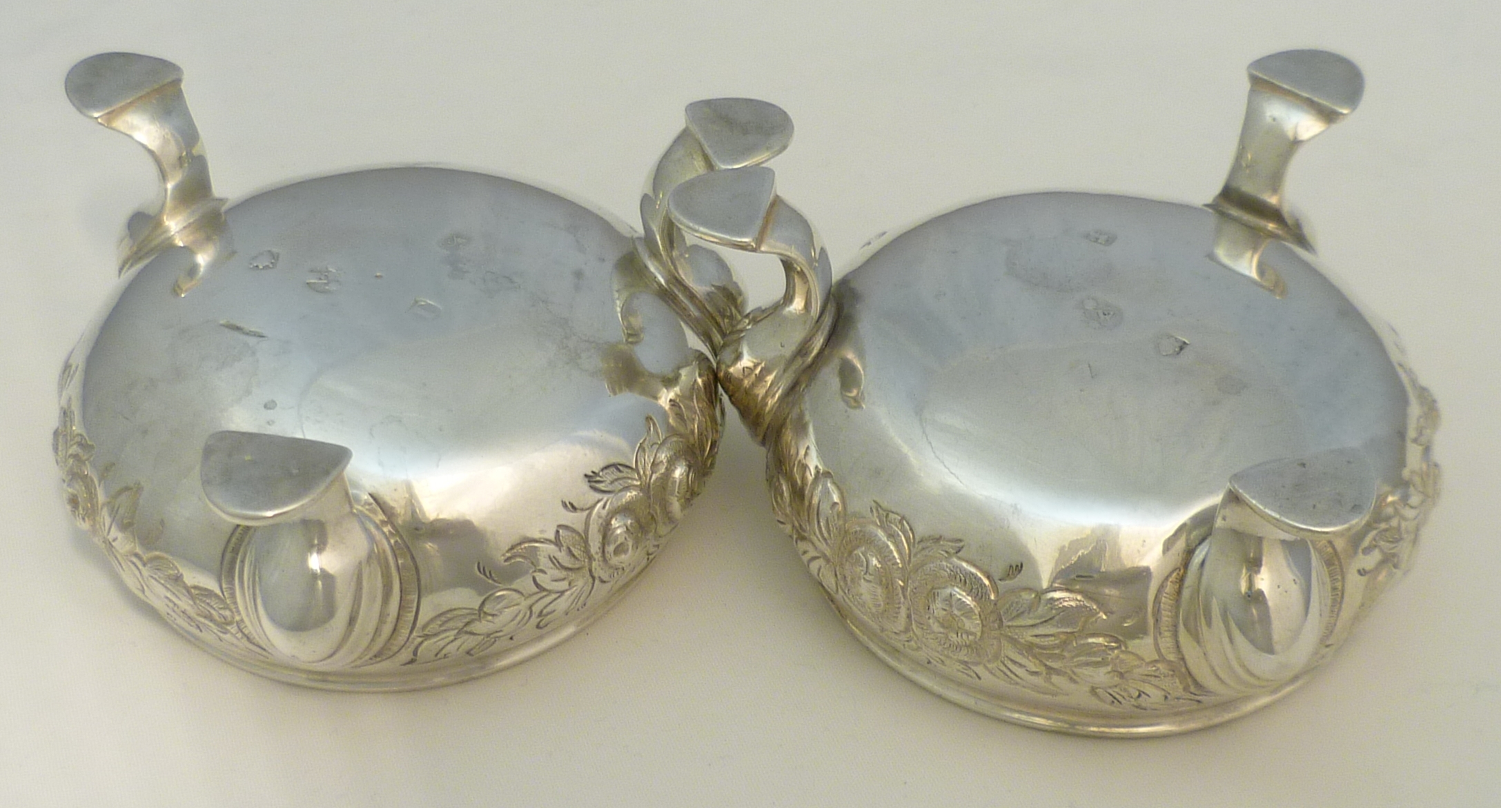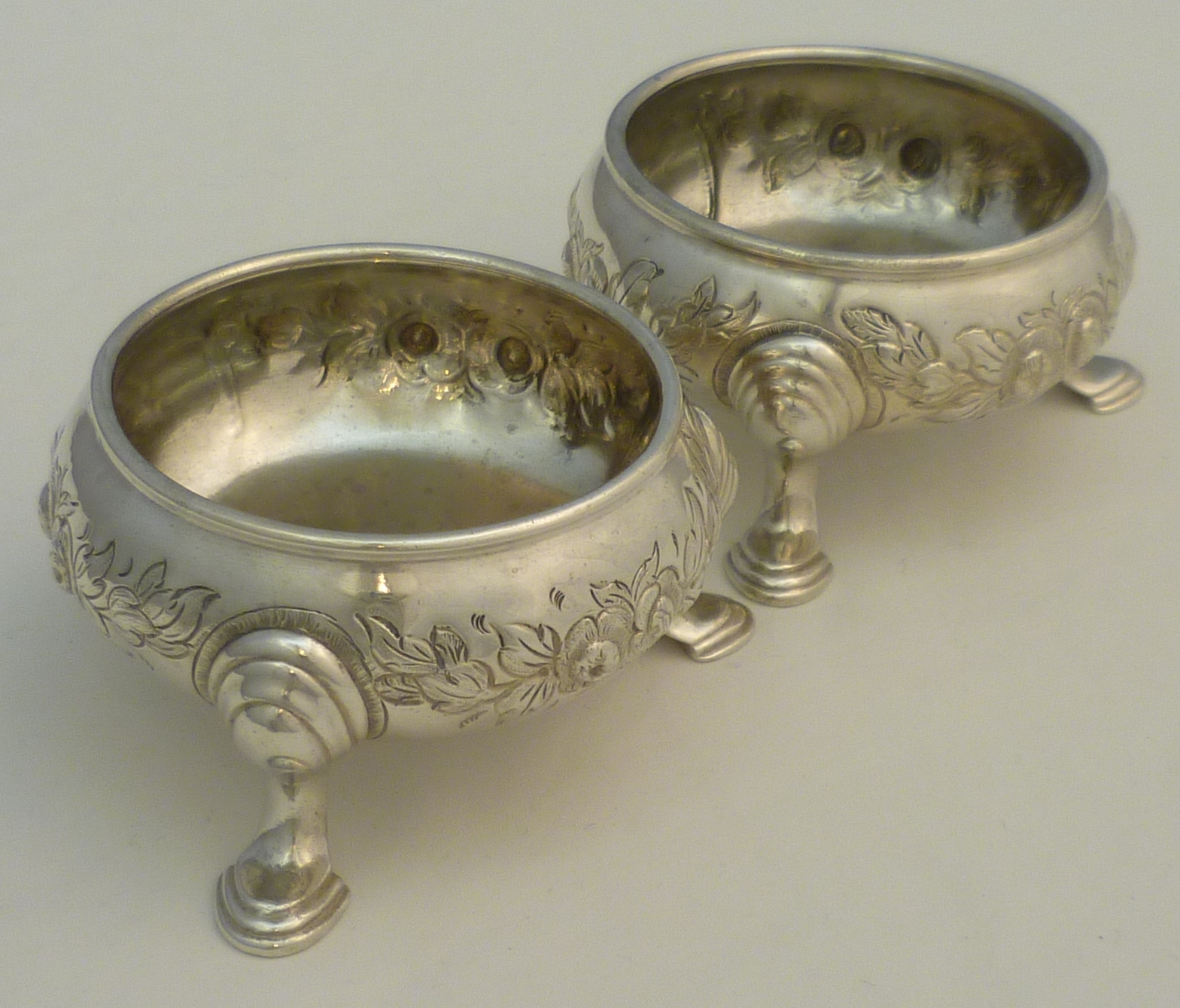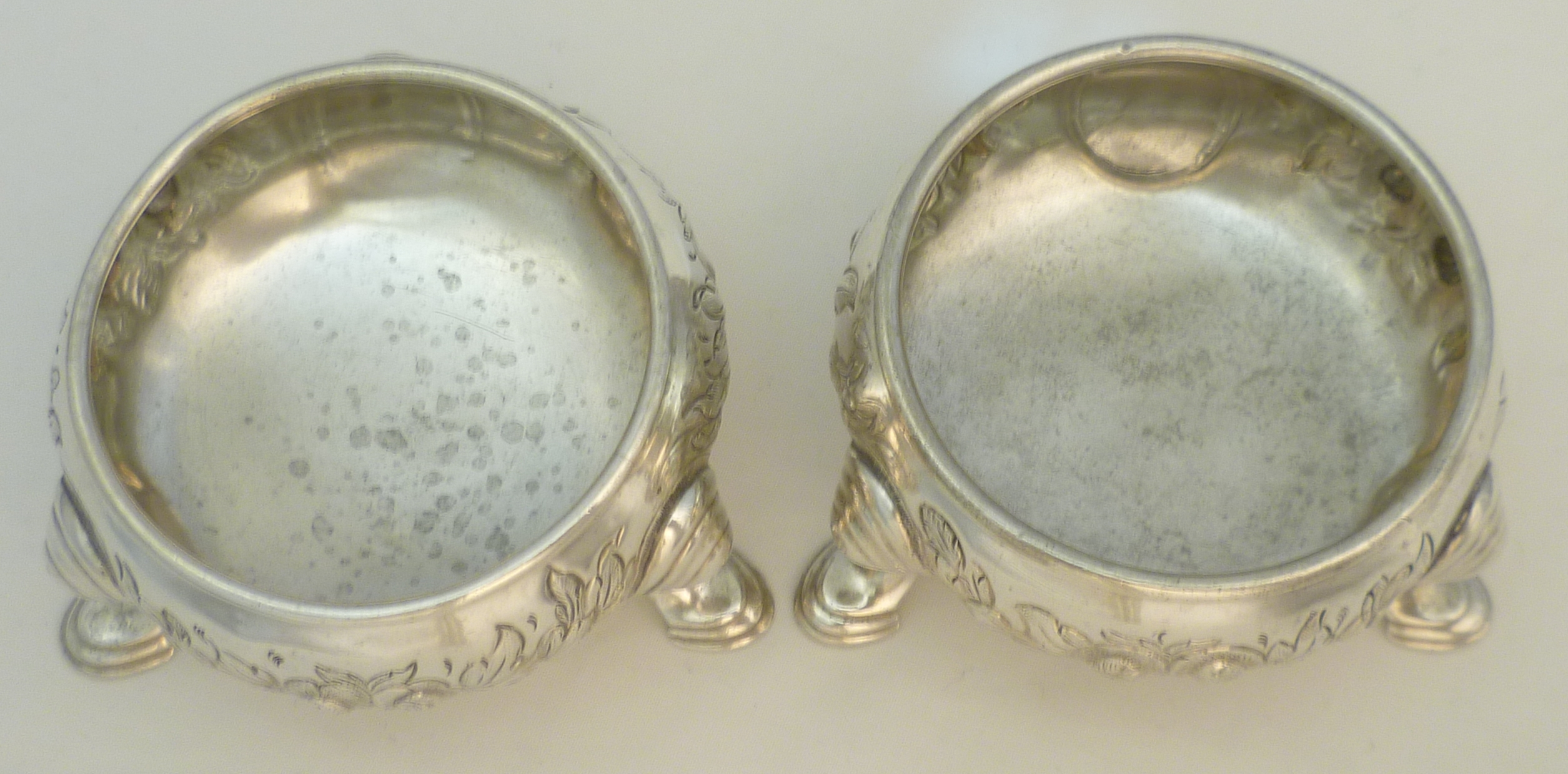 DESCRIPTION | Heavy and robust pair of George II solid sterling silver cauldron salts with embossed and engraved decoration, hoof feet. Very similar to salts m7639. |