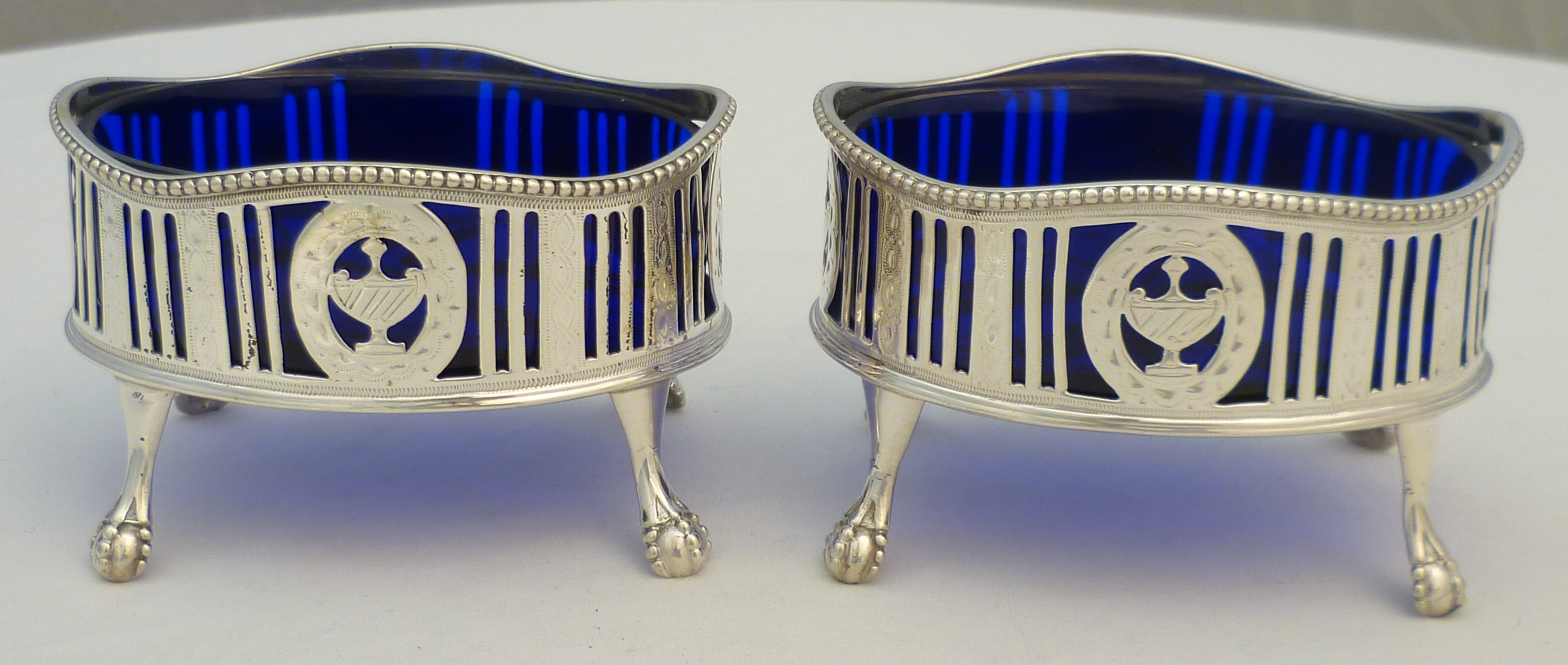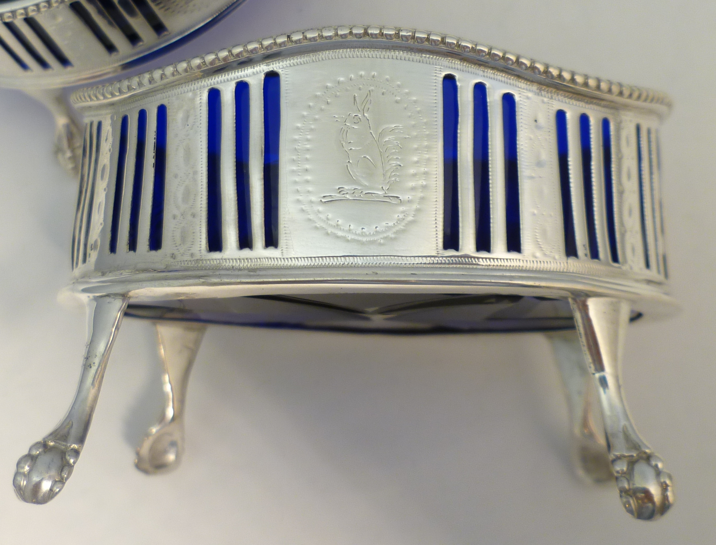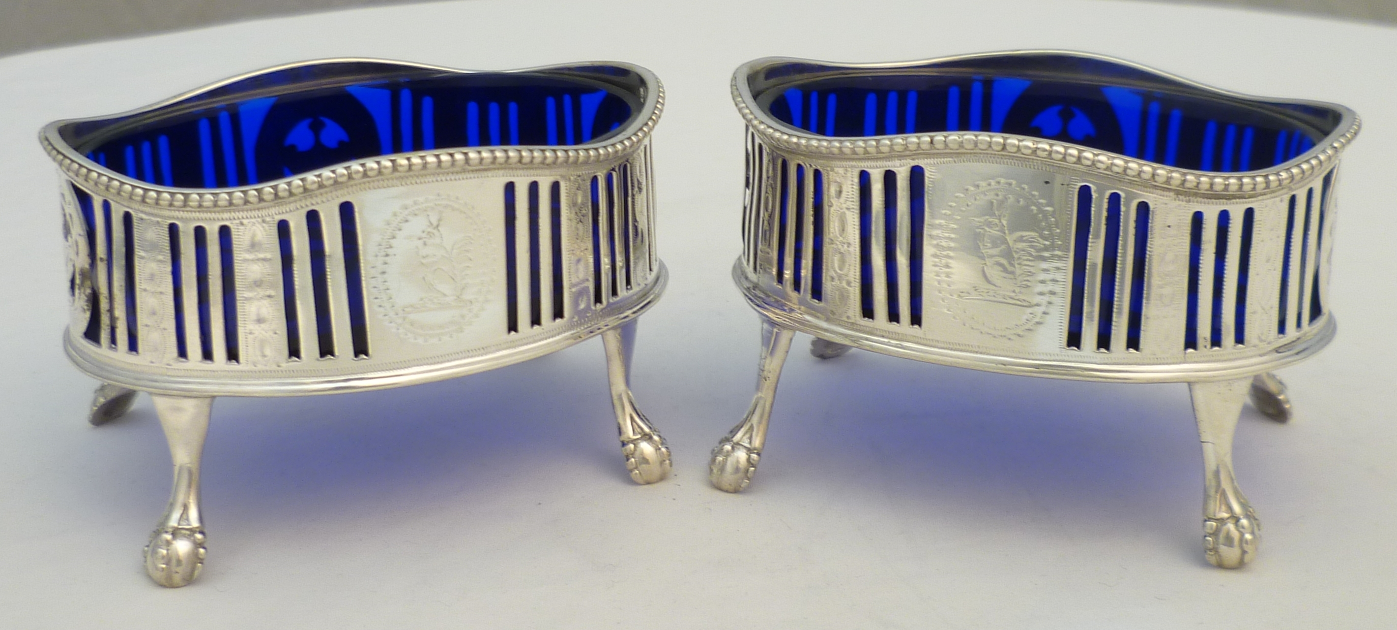 DESCRIPTION | Very good pair of Georgian neo-classical pierced solid sterling silver salts with bright cut engraved decoration, ball and claw feet, star cut blue glass liners and red squirrel crest engraving. |