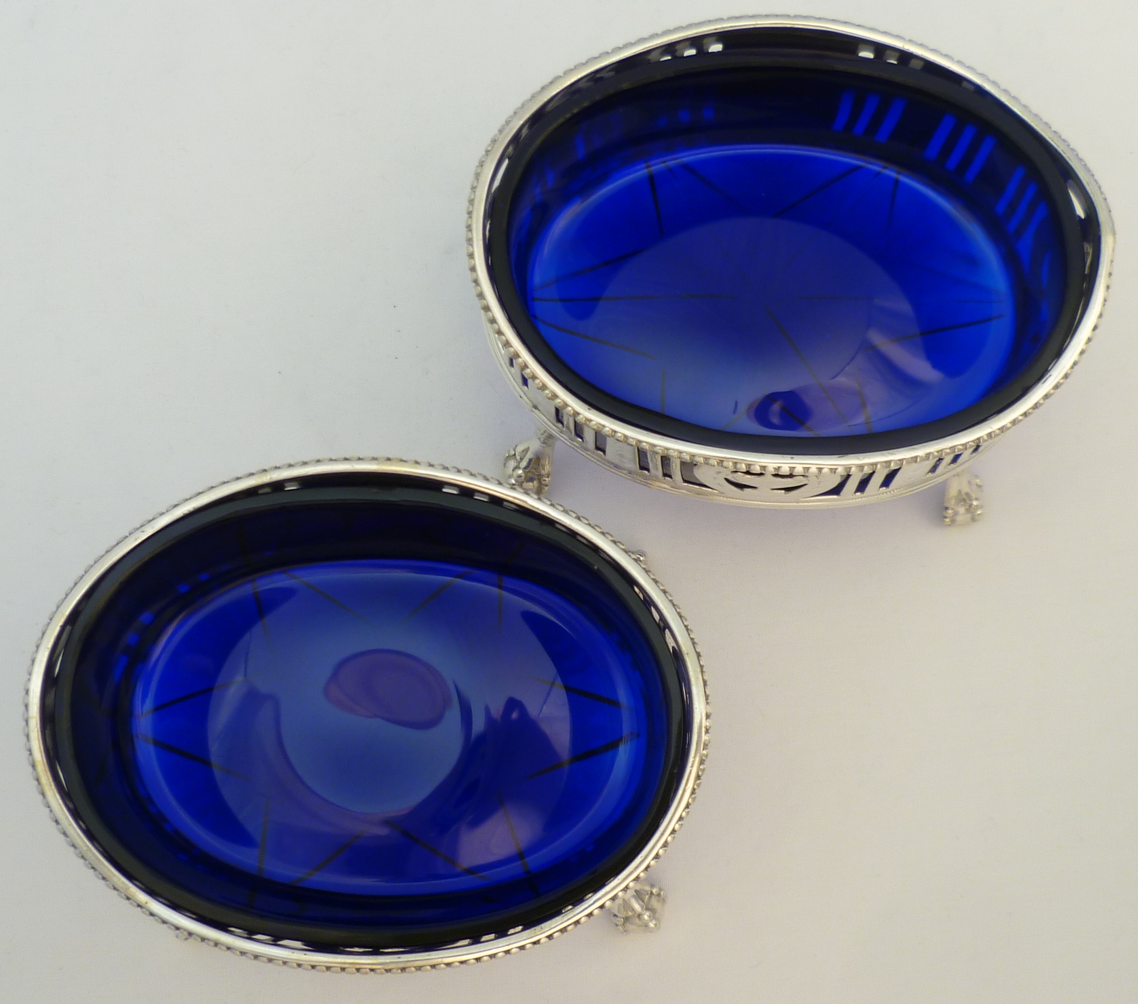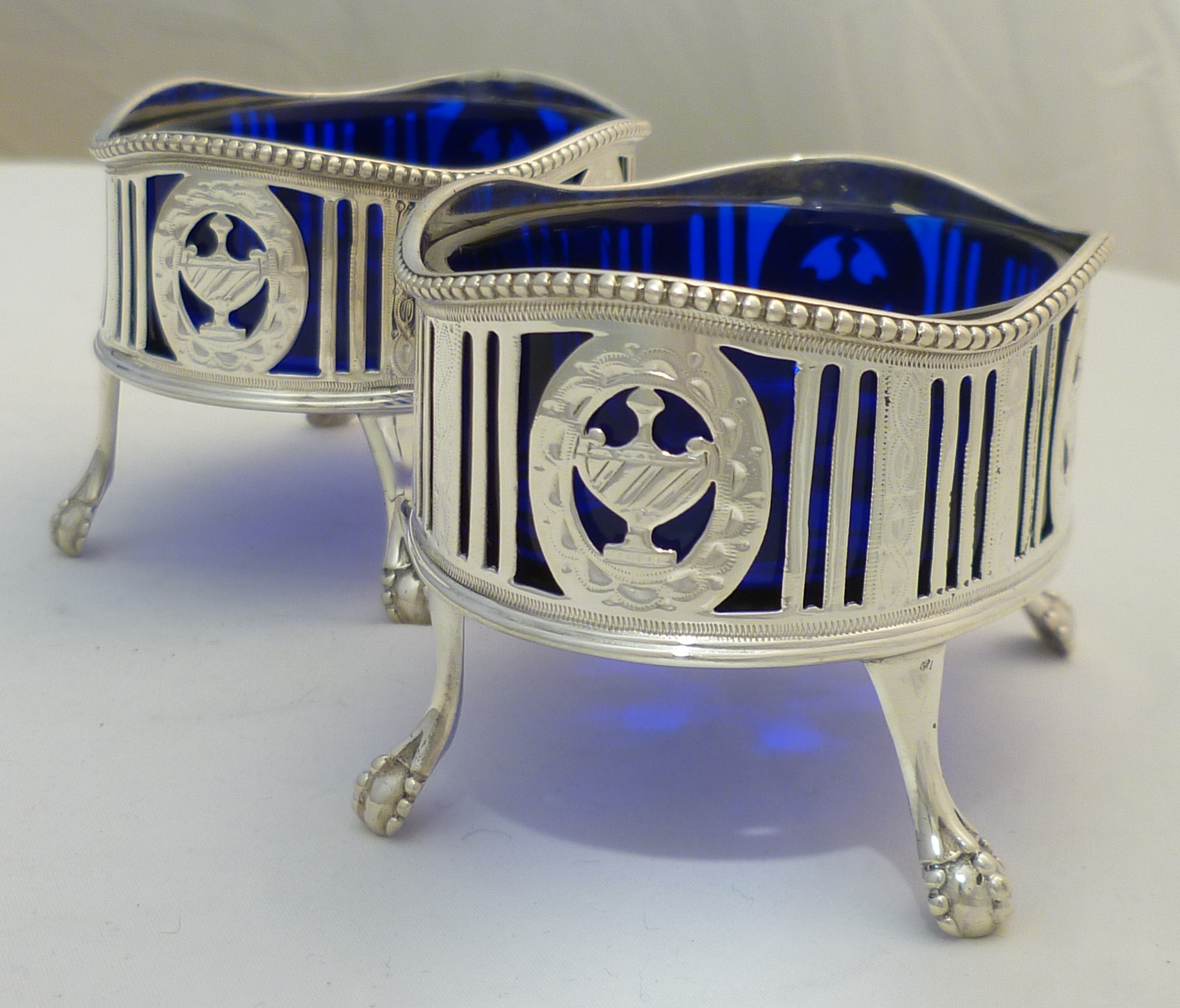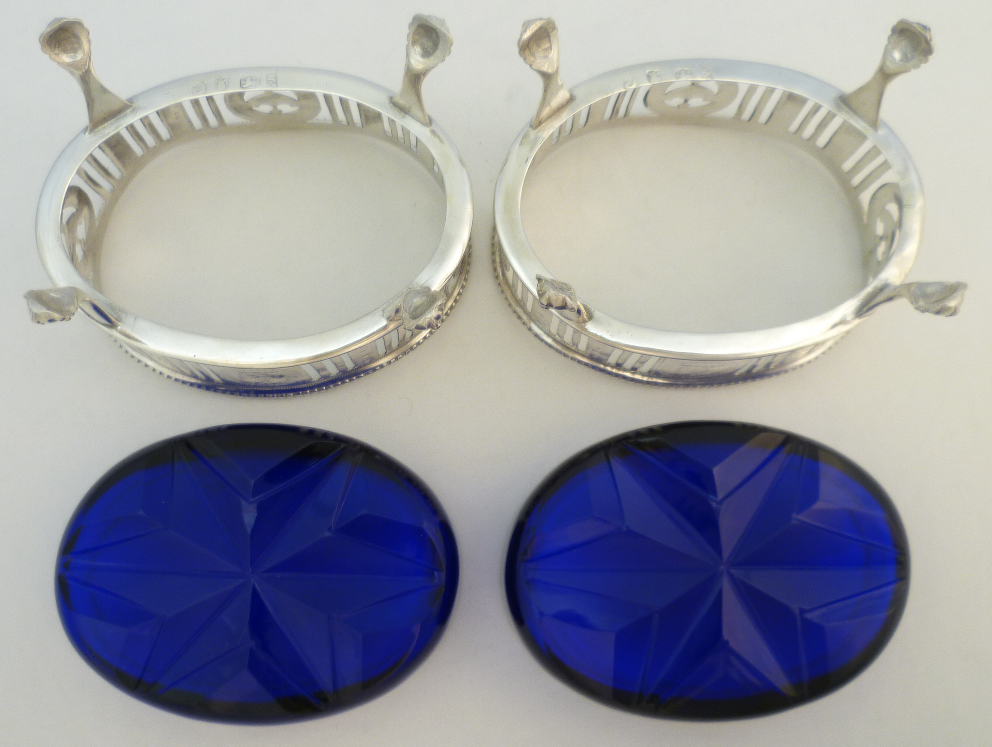 DESCRIPTION | Very good pair of Georgian neo-classical pierced solid sterling silver salts with bright cut engraved decoration, ball and claw feet, star cut blue glass liners and red squirrel crest engraving. |