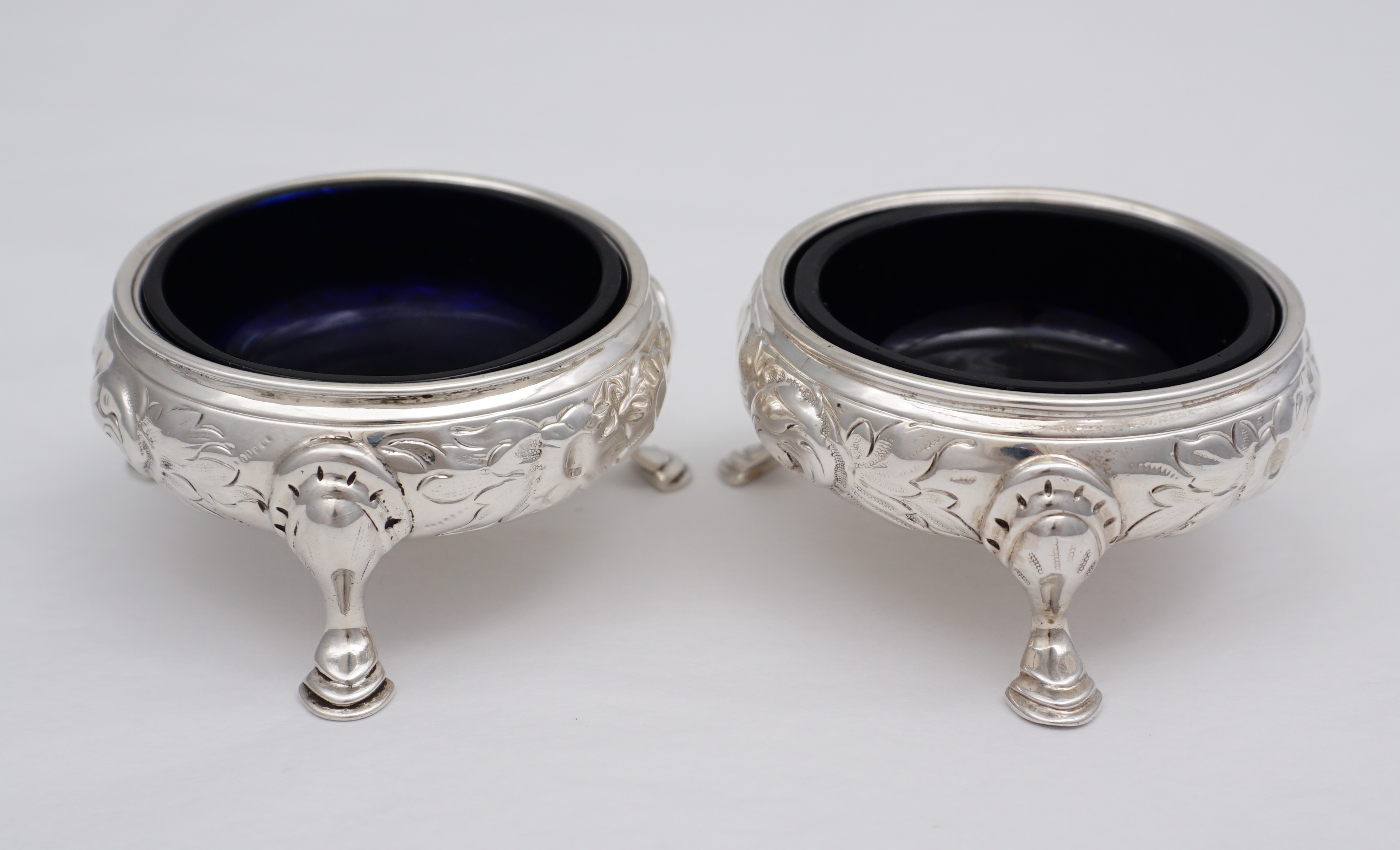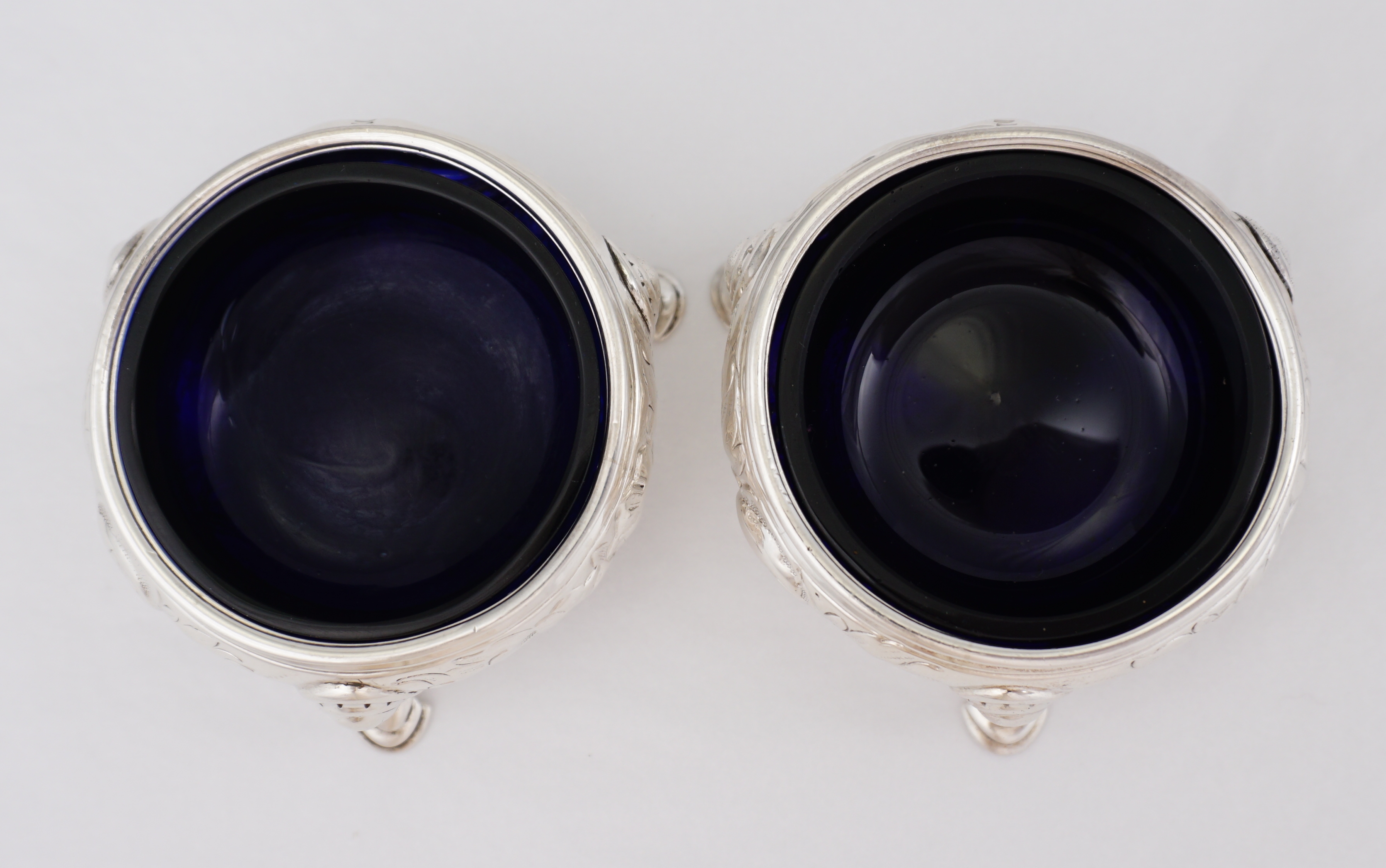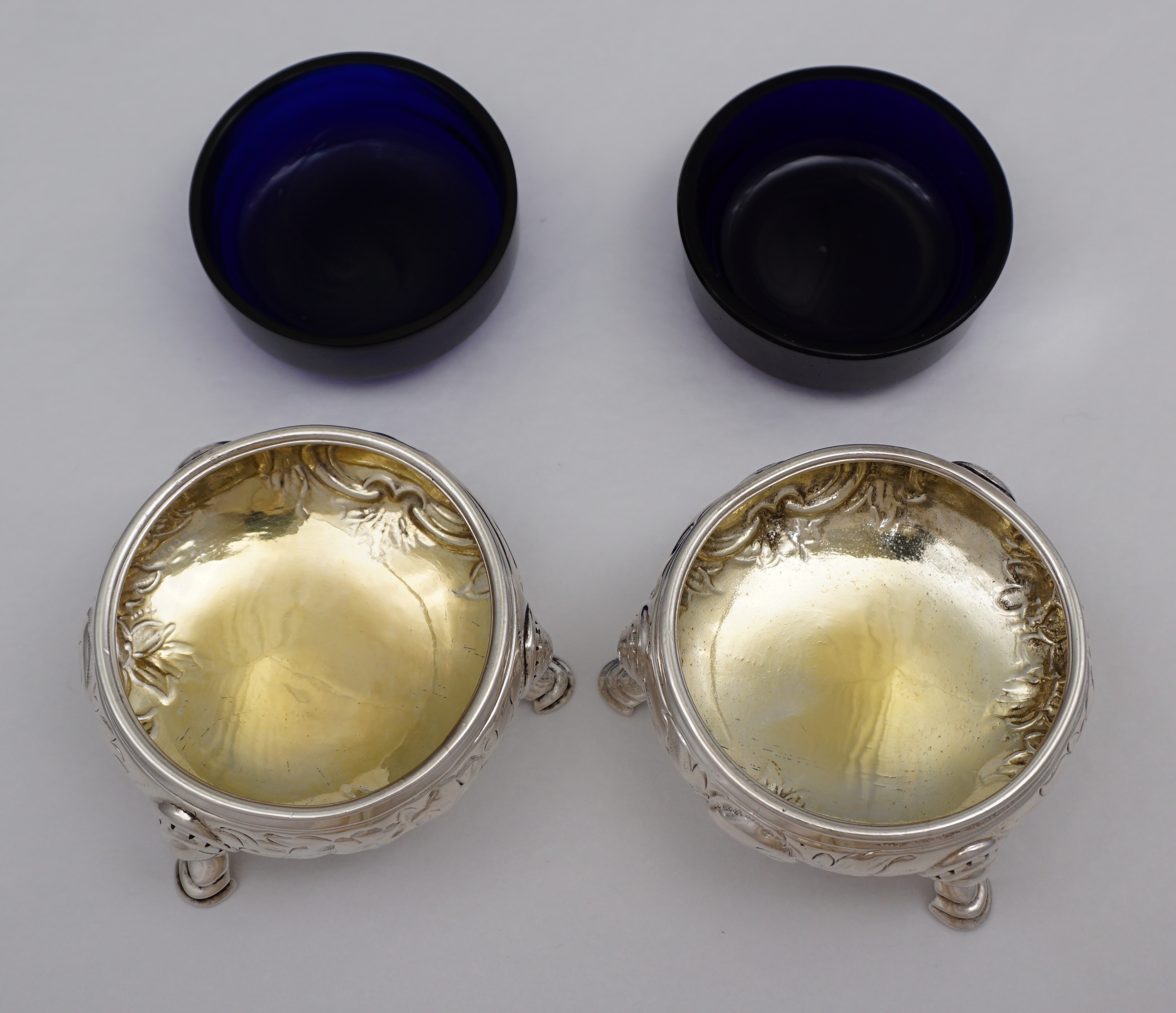 DESCRIPTION | Pair of antique English Georgian solid sterling silver cauldron salts with blue glass liners, gilded interiors,