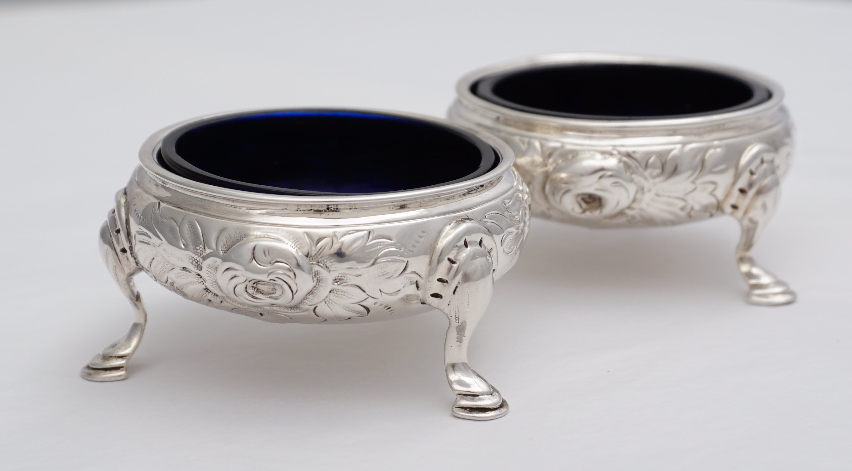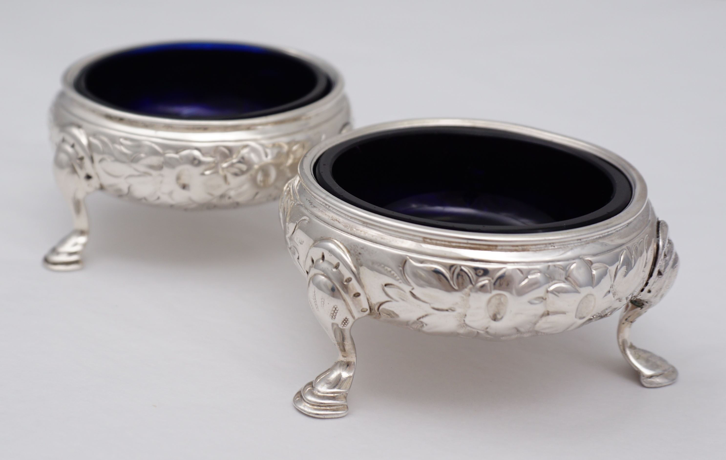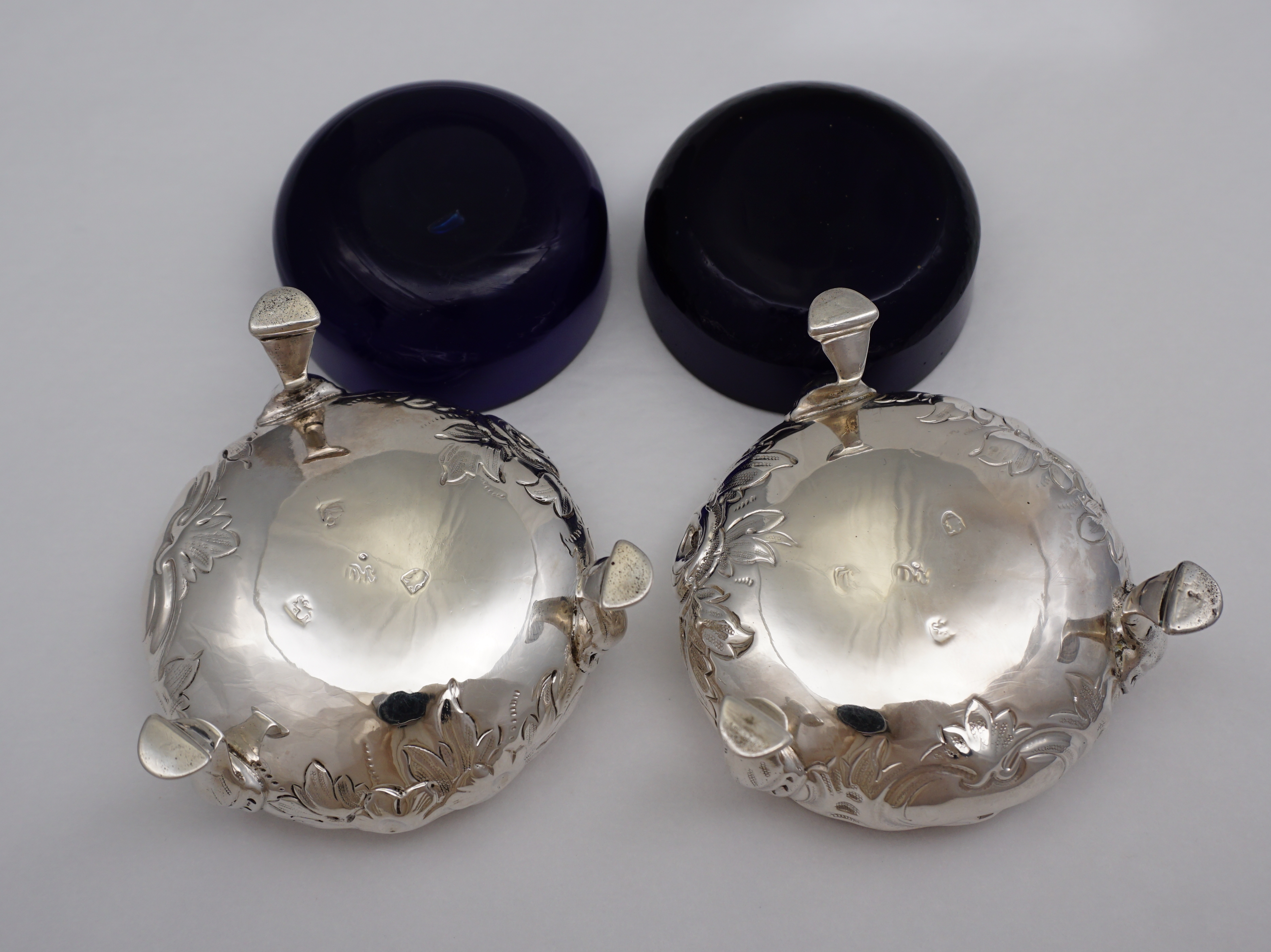 DESCRIPTION | Pair of antique English Georgian solid sterling silver cauldron salts with blue glass liners, gilded interiors,