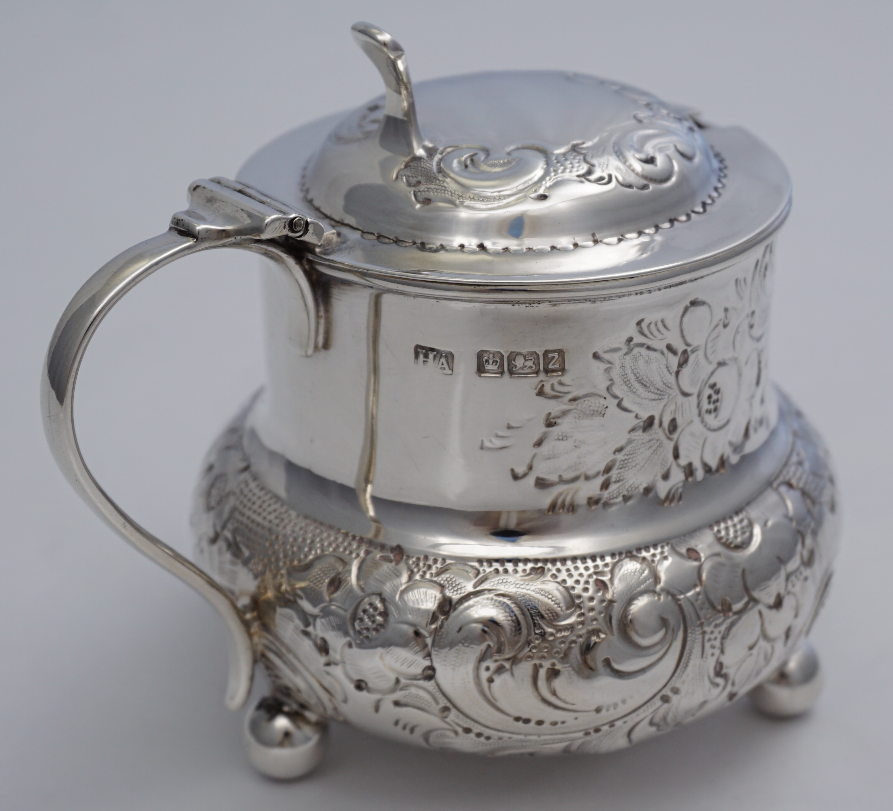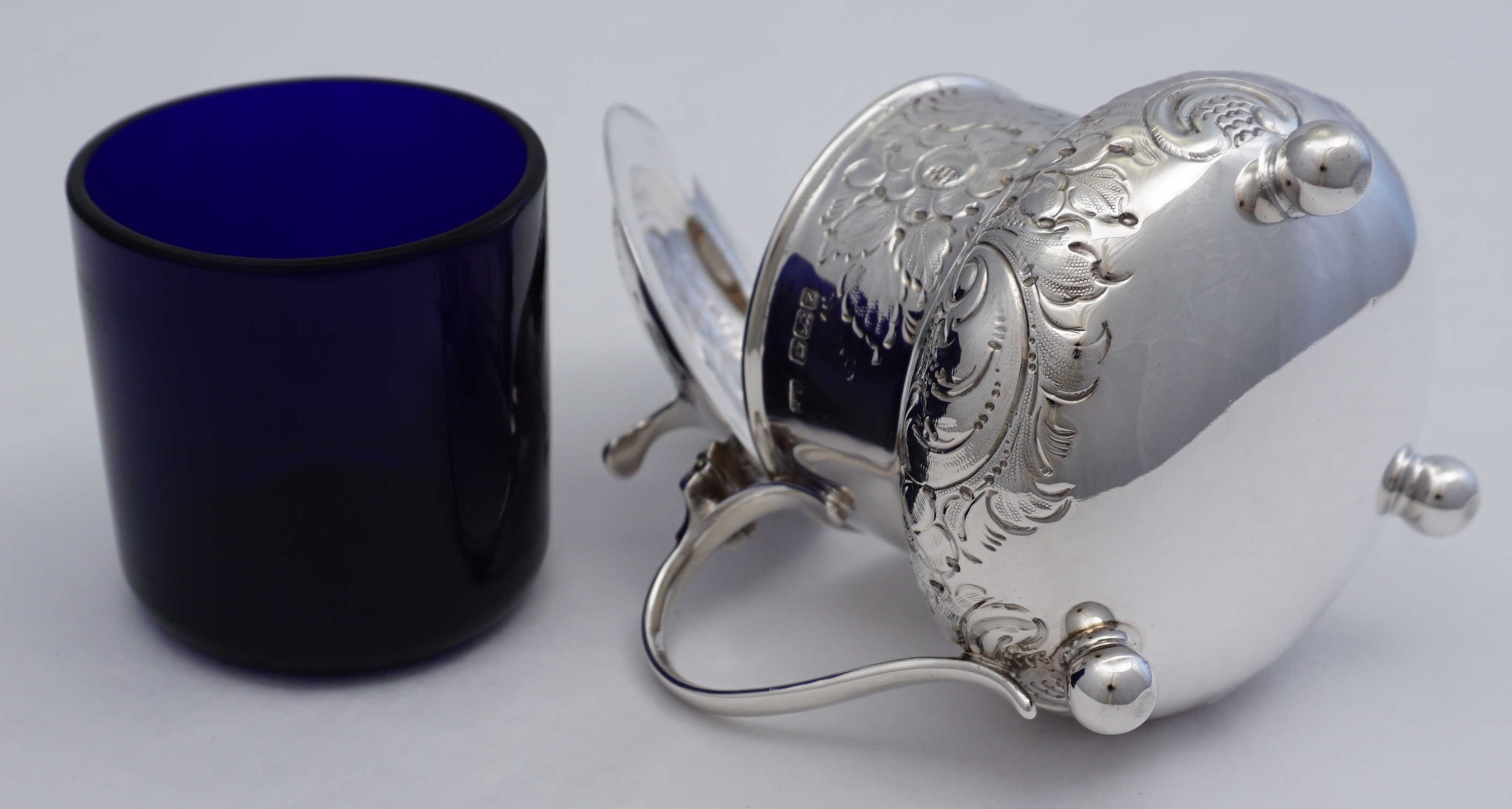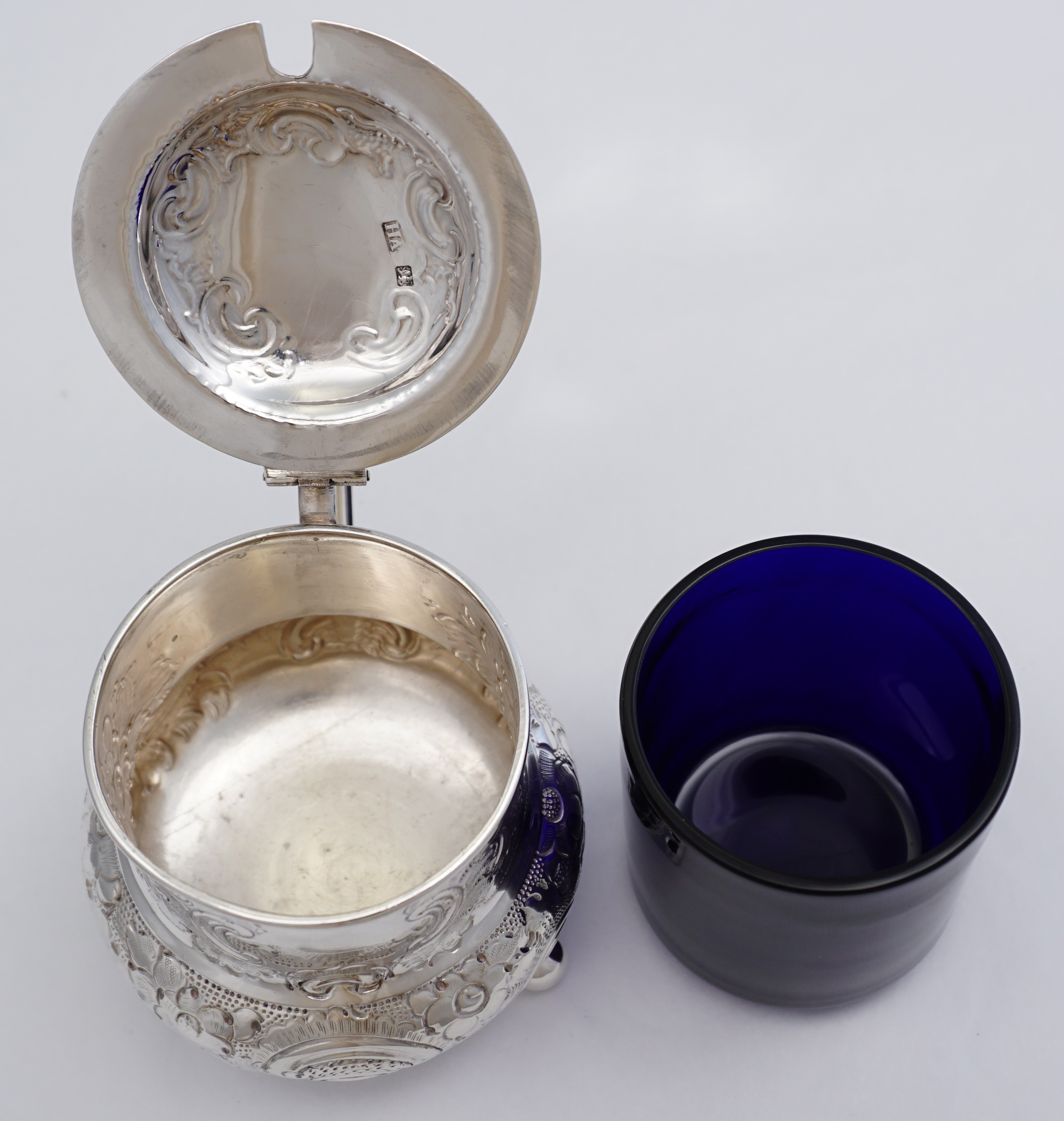 DESCRIPTION | Very good antique English Victorian solid sterling silver mustard pot with rococo and floral decoration and hand-made custom blue glass liner. Blank frontal cartouche that does not appear to have ever been engraved. |