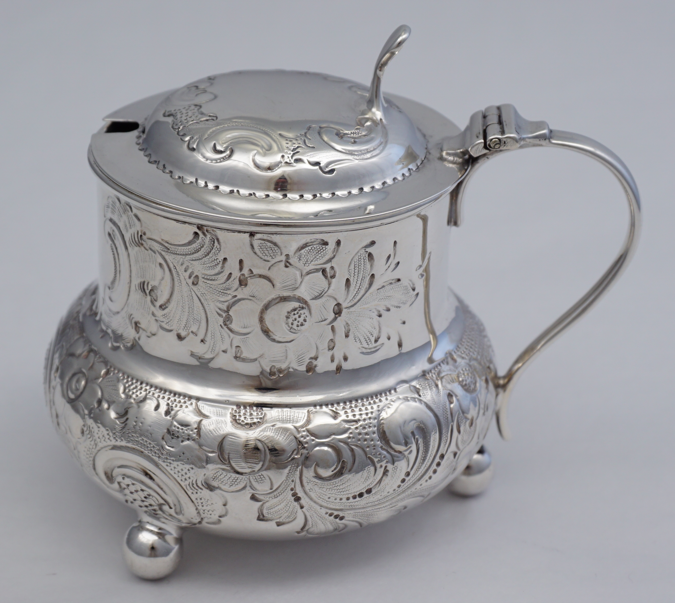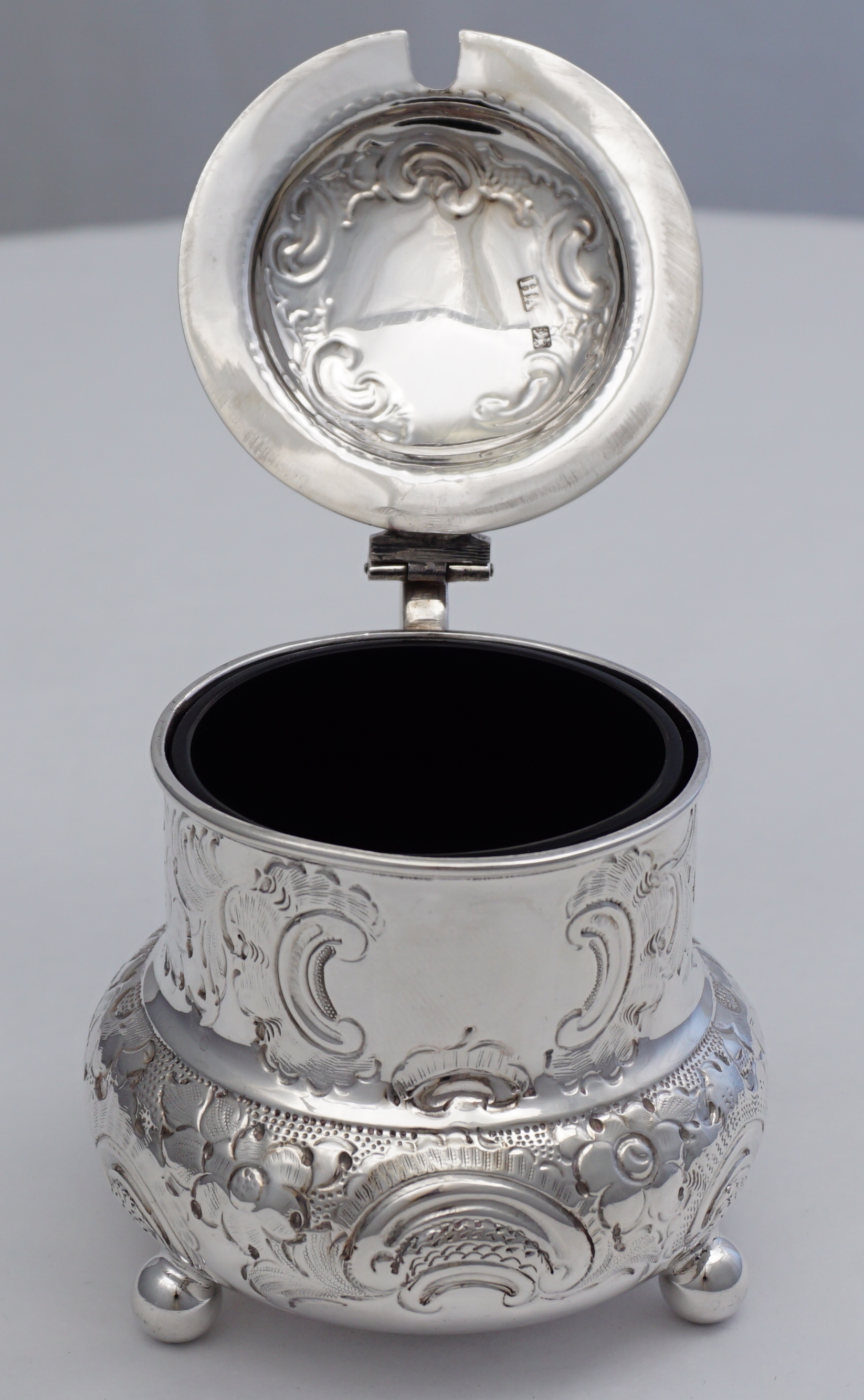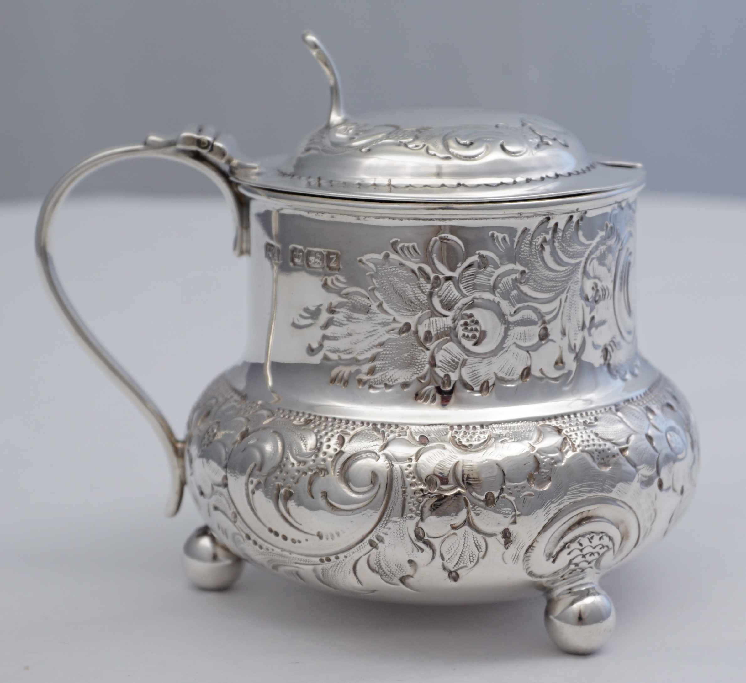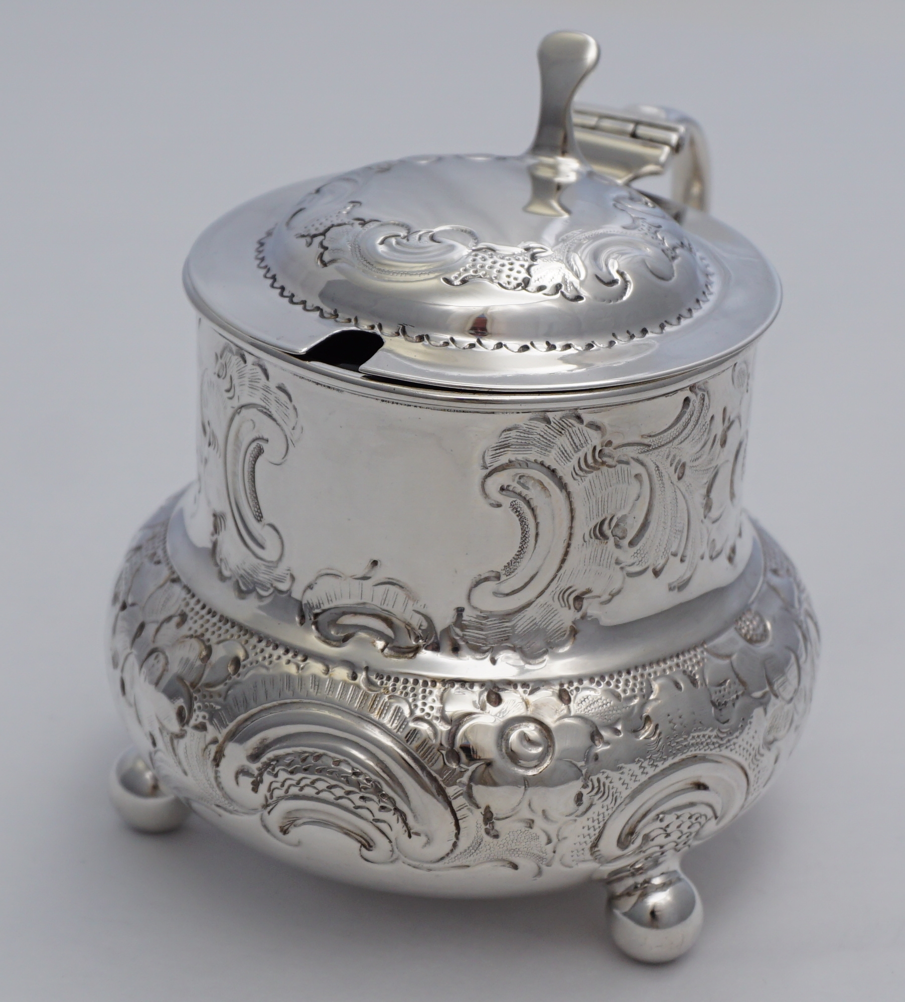DESCRIPTION | Very good antique English Victorian solid sterling silver mustard pot with rococo and floral decoration and hand-made custom blue glass liner. Blank frontal cartouche that does not appear to have ever been engraved. |