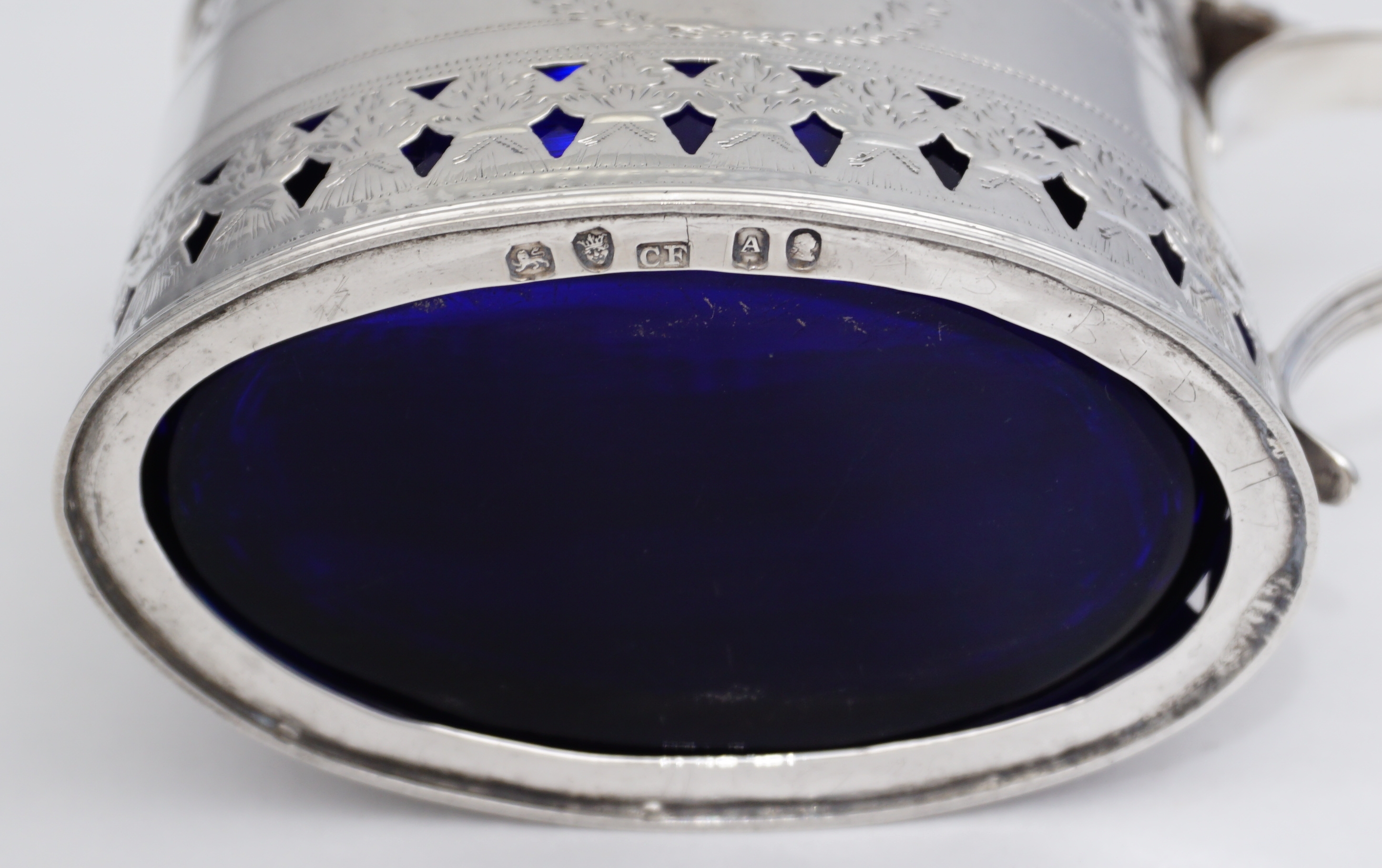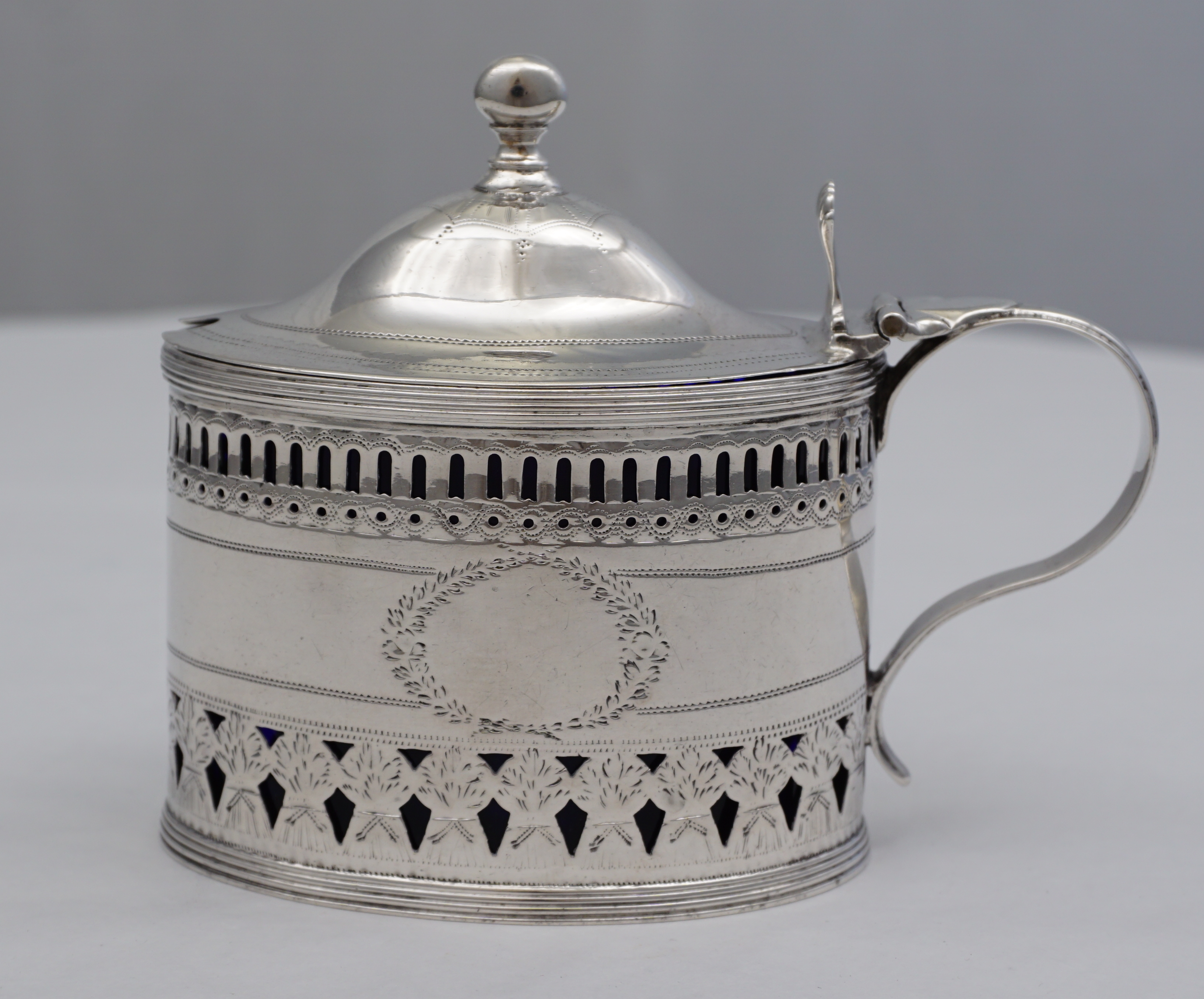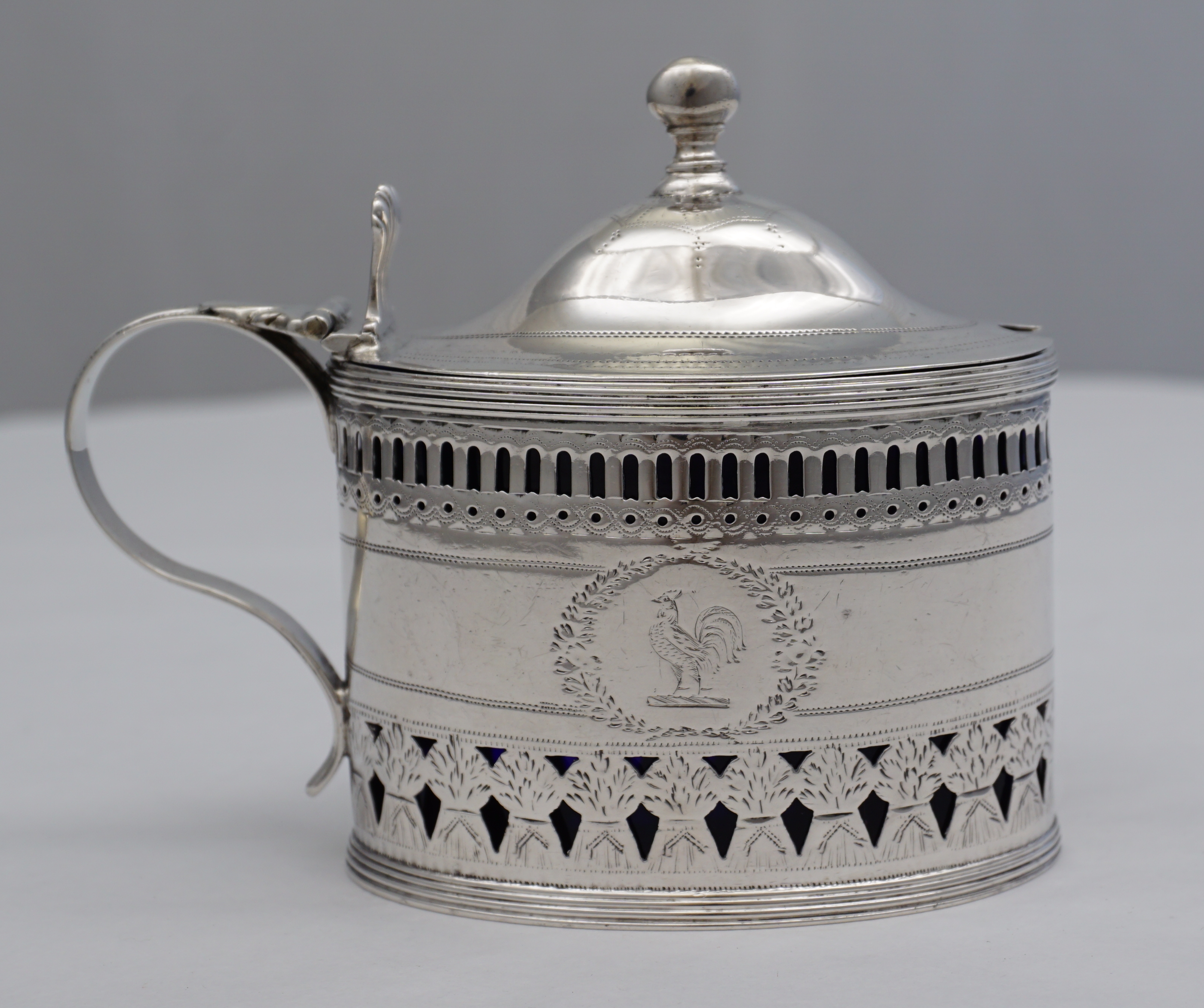 DESCRIPTION | Good antique English Georgian solid sterling silver mustard pot with pierced and engraved decoration including wheat sheaf motifs and a blue glass liner. To one foliate cartouche is engraved a cockerel crest, the other is blank. |
