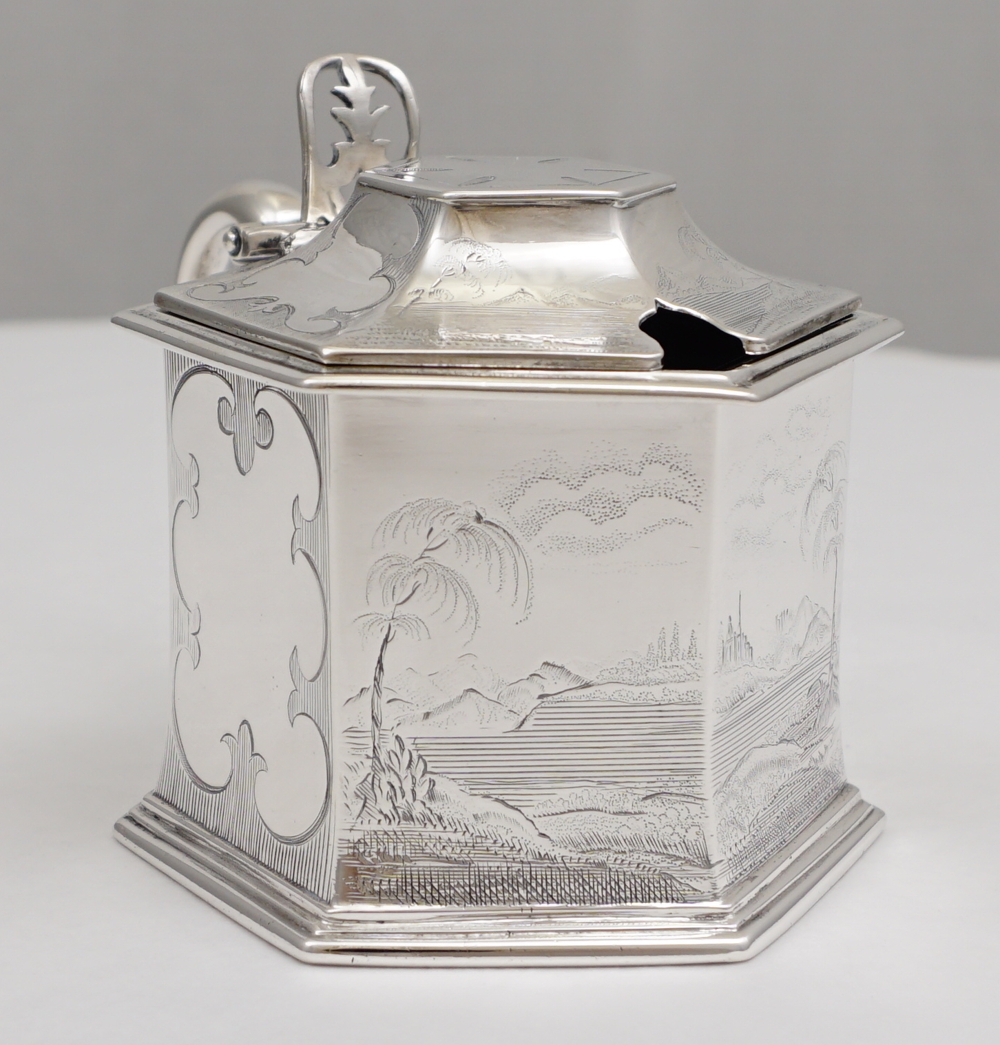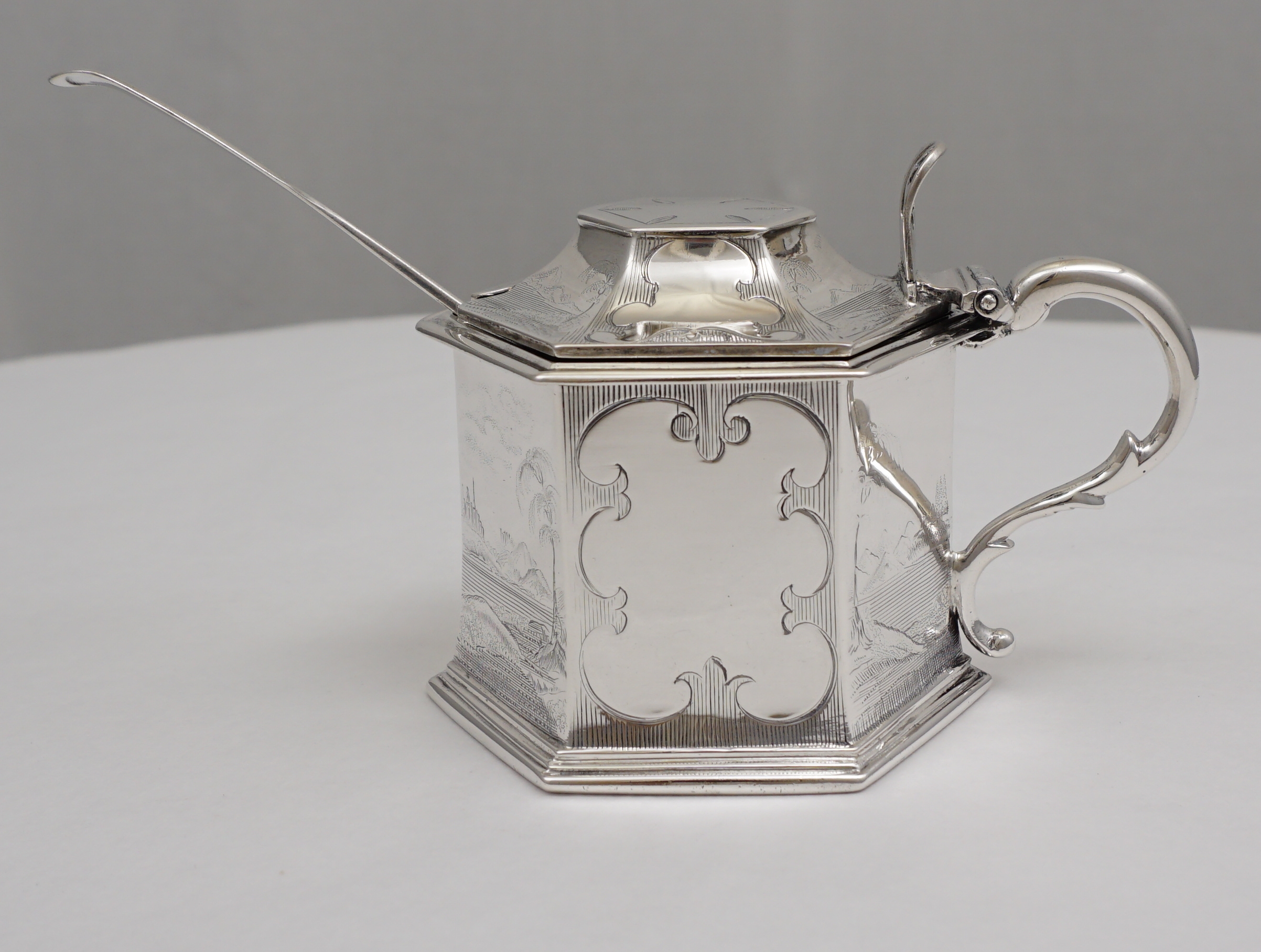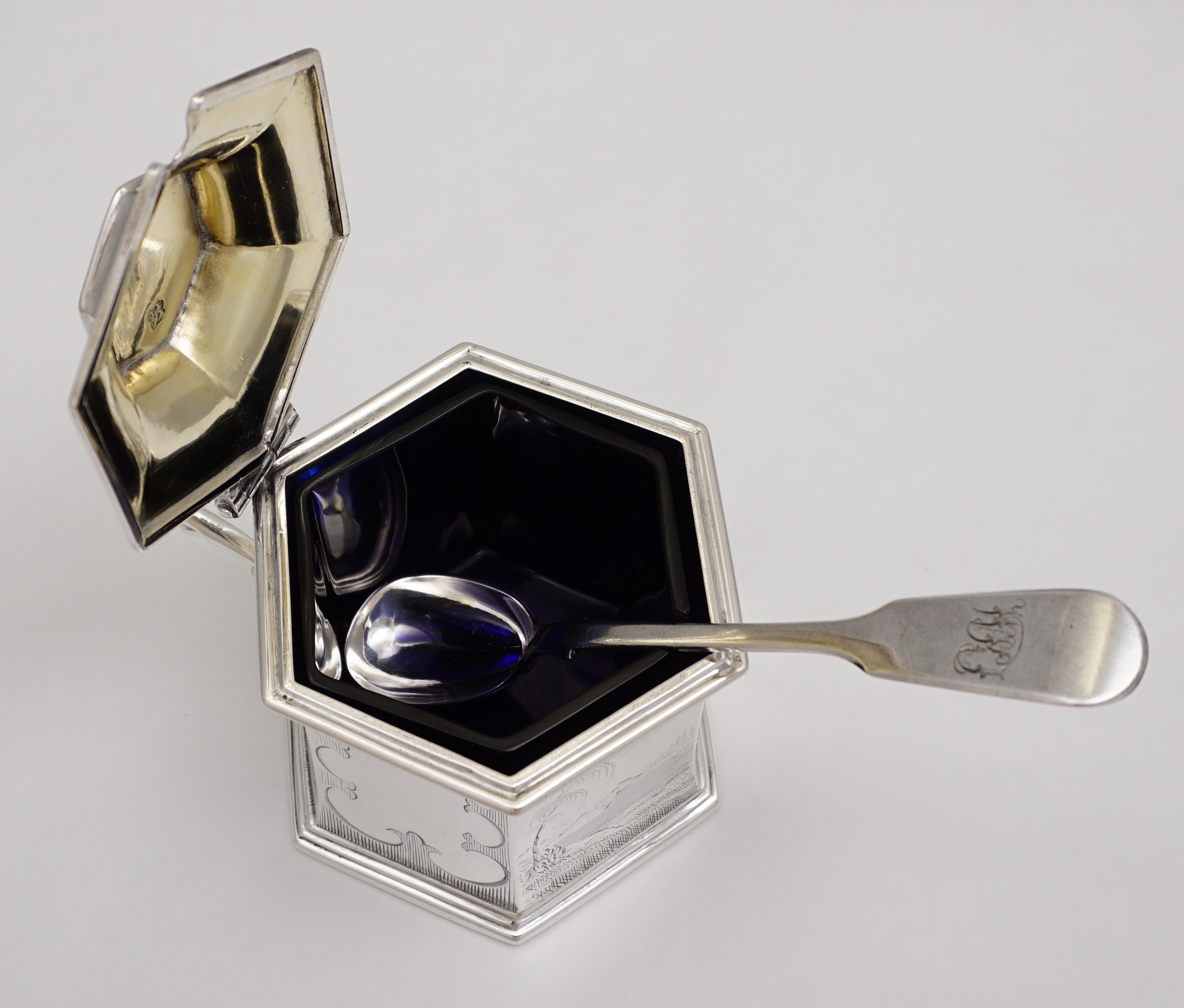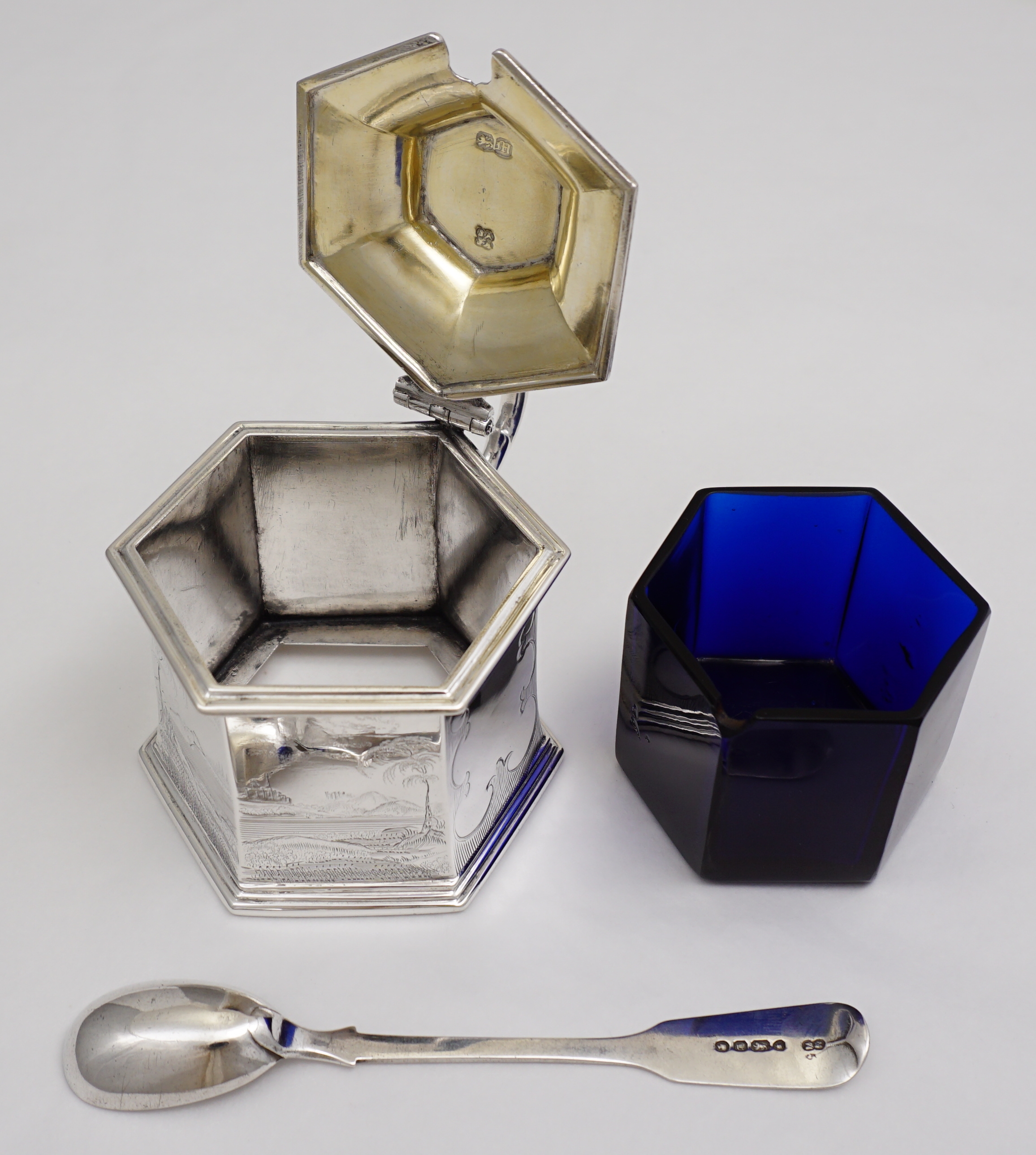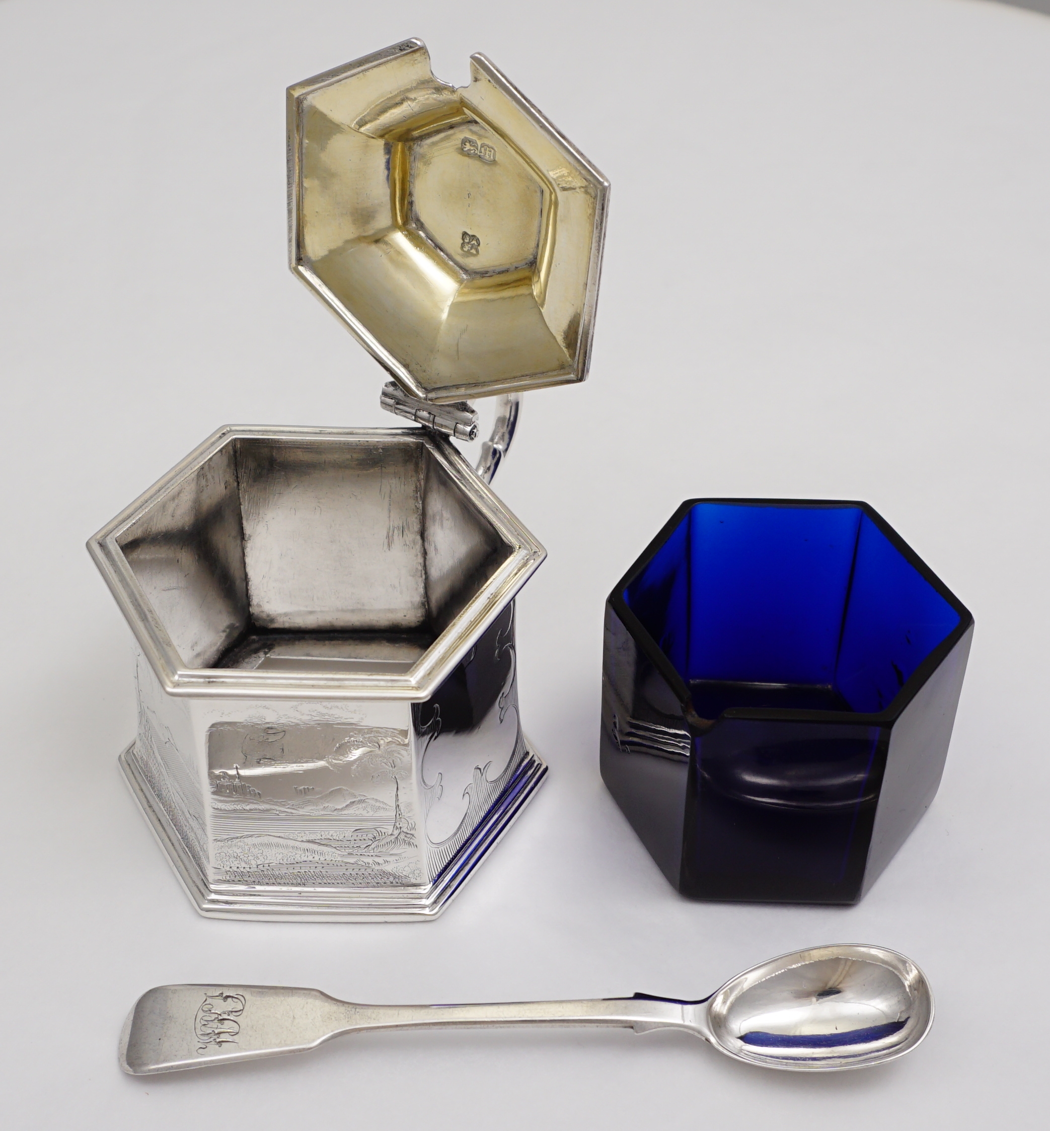 DESCRIPTION | Magnificent antique English early Victorian solid sterling silver mustard pot with a gilded lid, pierced thumb piece, mustard ladle and original blue glass liner. The body is decorated with extraordinary engraved landscapes featuring castles, lakes and trees. The blue glass liner has the flat, highly polished surface of very old glass and a top rim cut-out to accept the ladle. The silver ladle is associated and has a monogram engraving. |