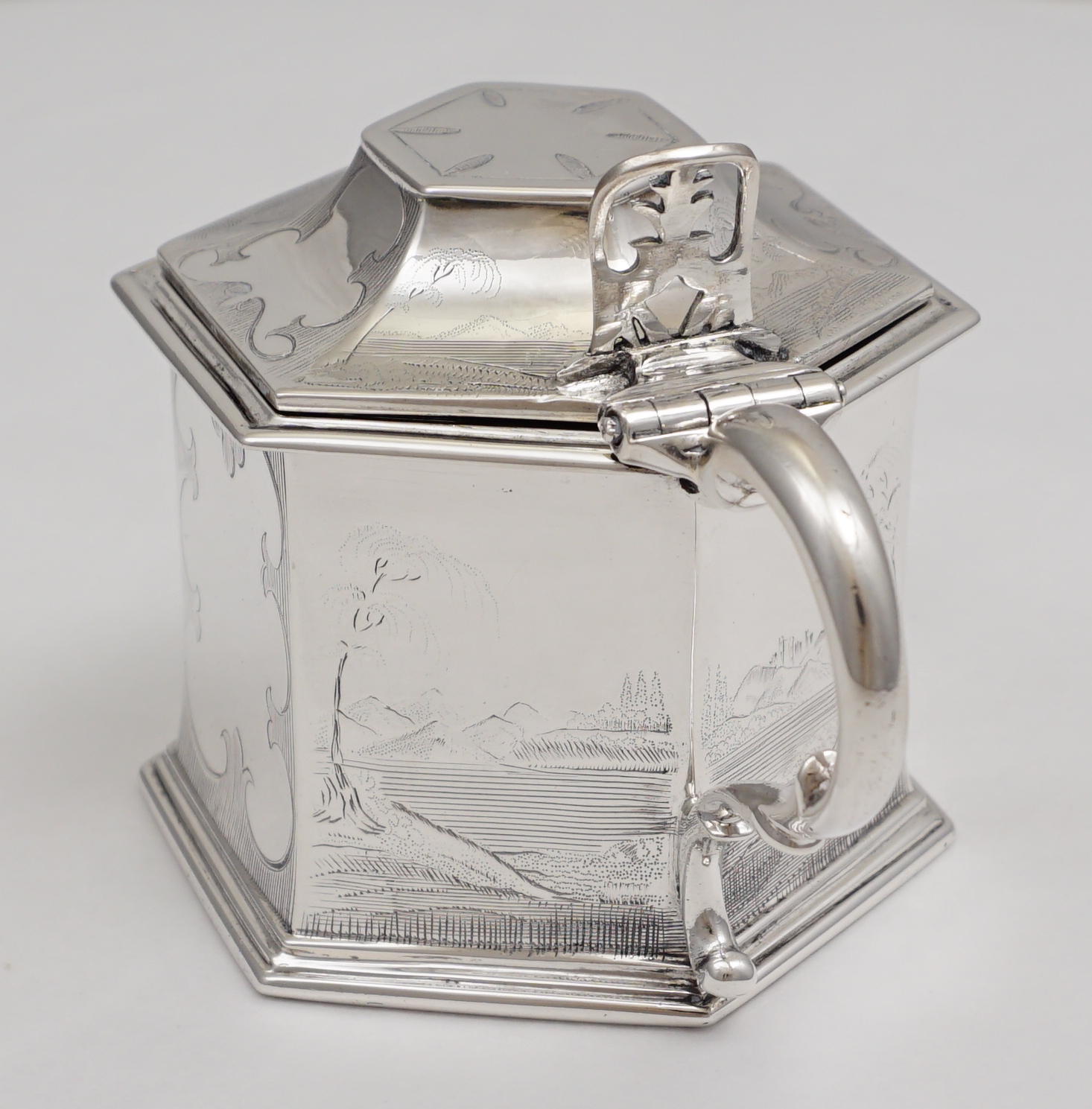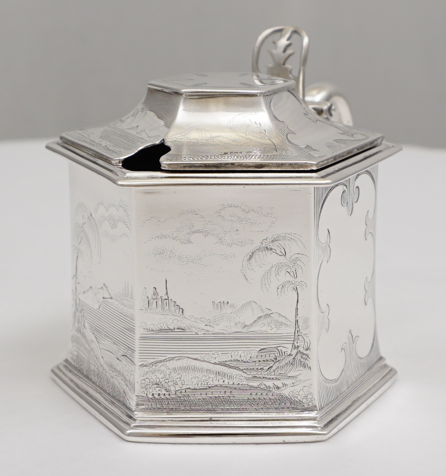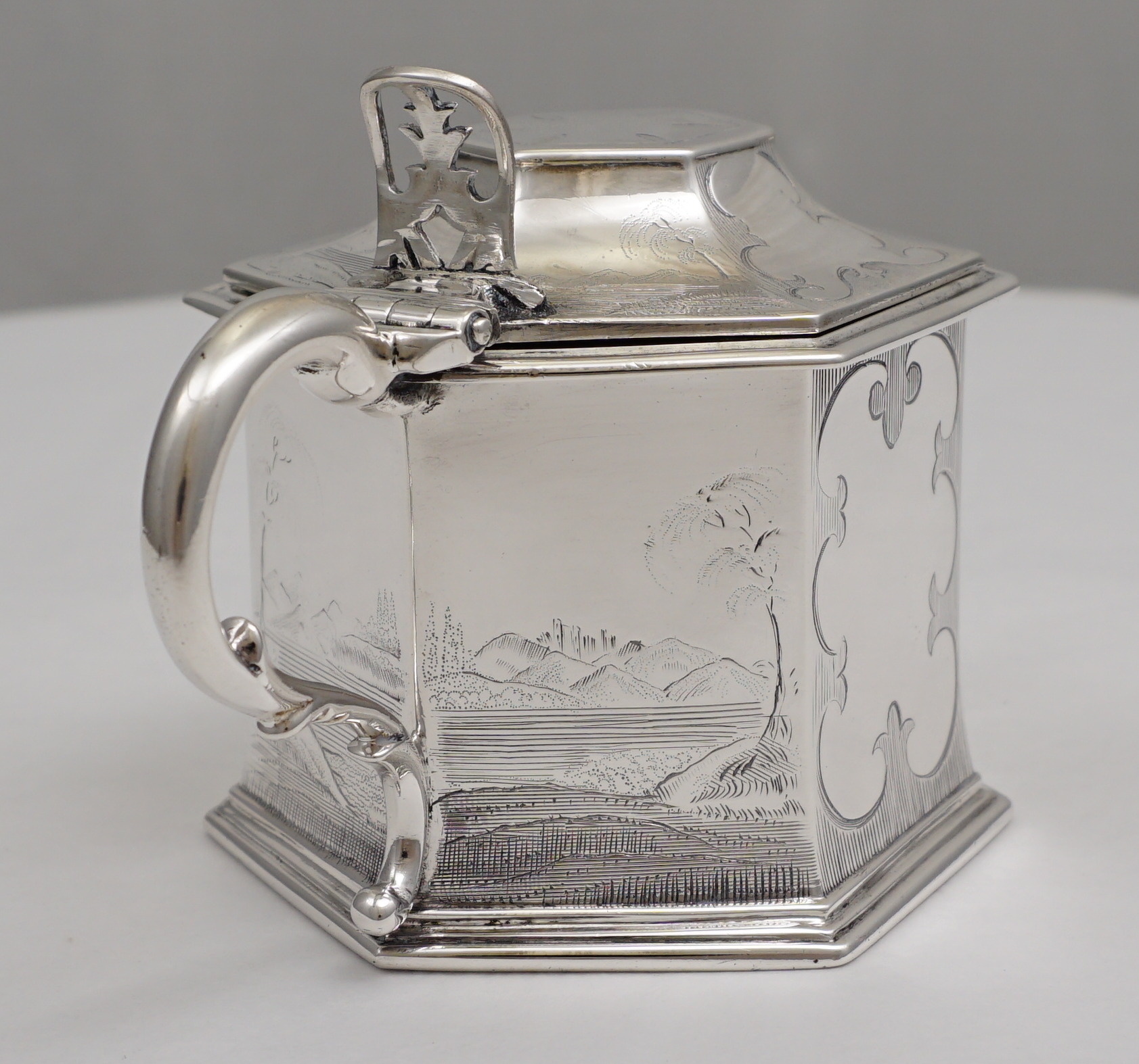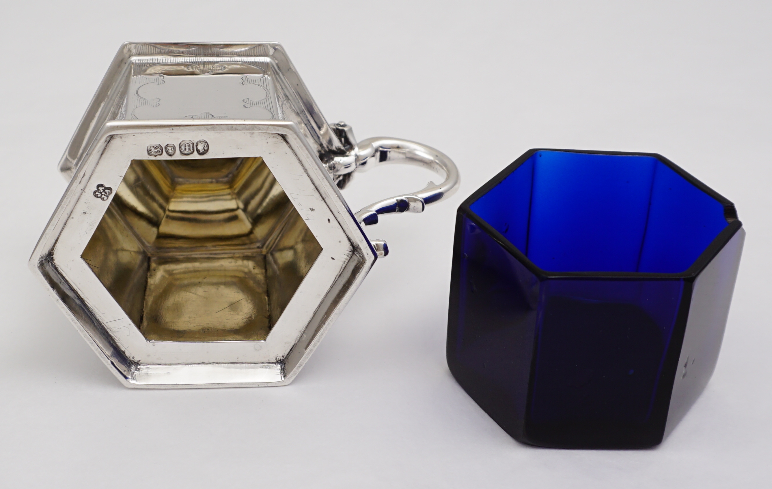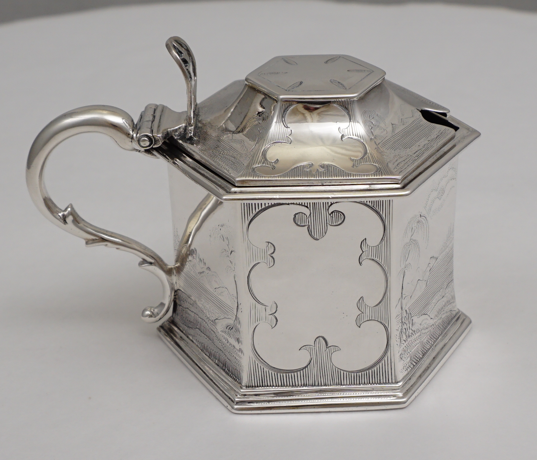 DESCRIPTION | Magnificent antique English early Victorian solid sterling silver mustard pot with a gilded lid, pierced thumb piece, mustard ladle and original blue glass liner. The body is decorated with extraordinary engraved landscapes featuring castles, lakes and trees. The blue glass liner has the flat, highly polished surface of very old glass and a top rim cut-out to accept the ladle. The silver ladle is associated and has a monogram engraving. |