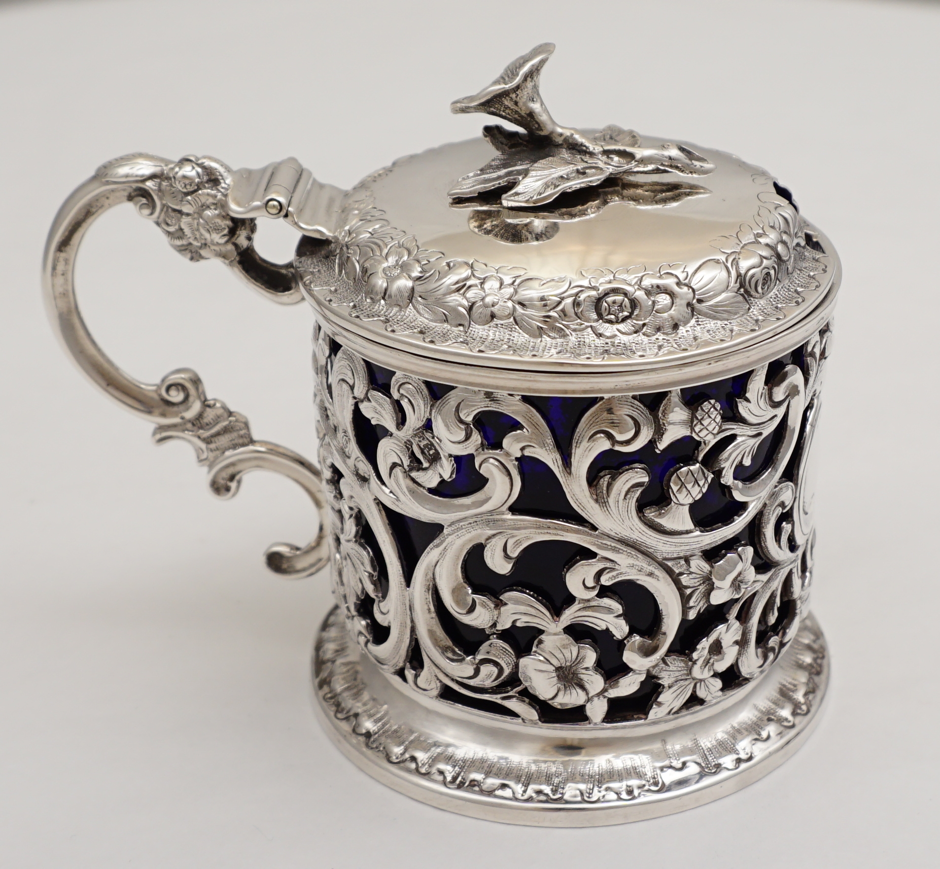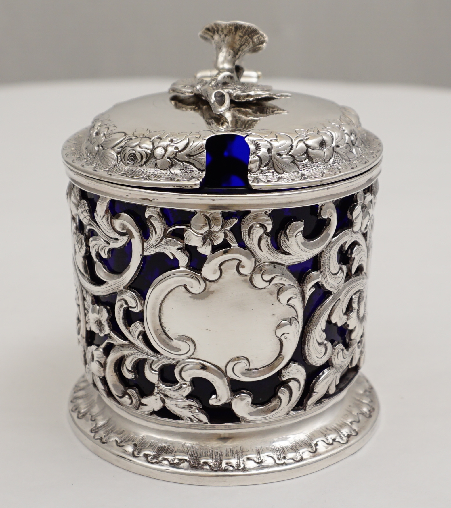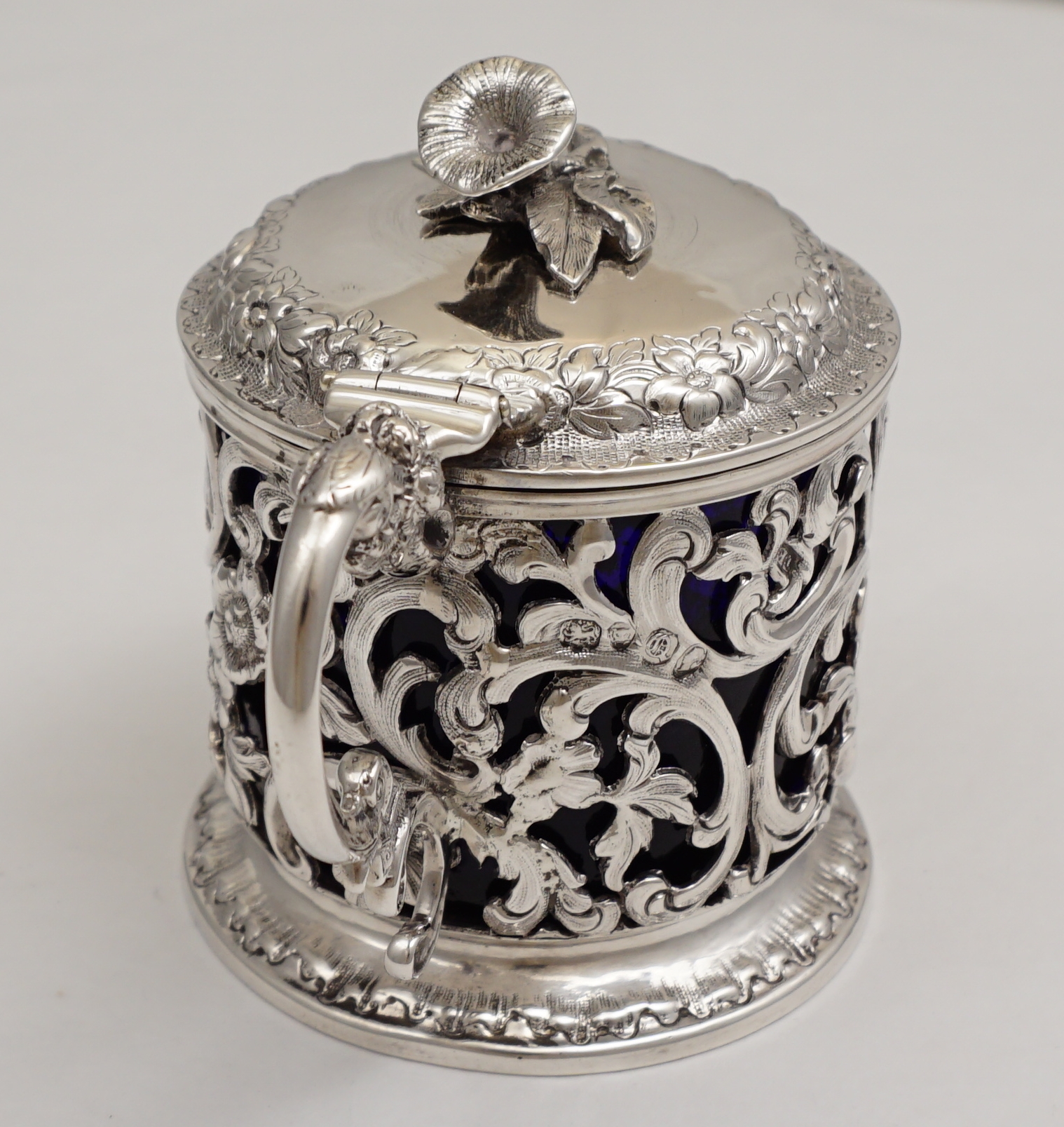 DESCRIPTION | Highest quality and decorative antique English Victorian pierced solid sterling silver mustard pot with beautifully cast silver flower finial, leaf and floral spray capped 'C' scroll and shell handle and handmade bespoke replacement blue glass liner. The pierced body with thistle, flower, foliate and 'C' scroll decoration and a blank rococo cartouche. |