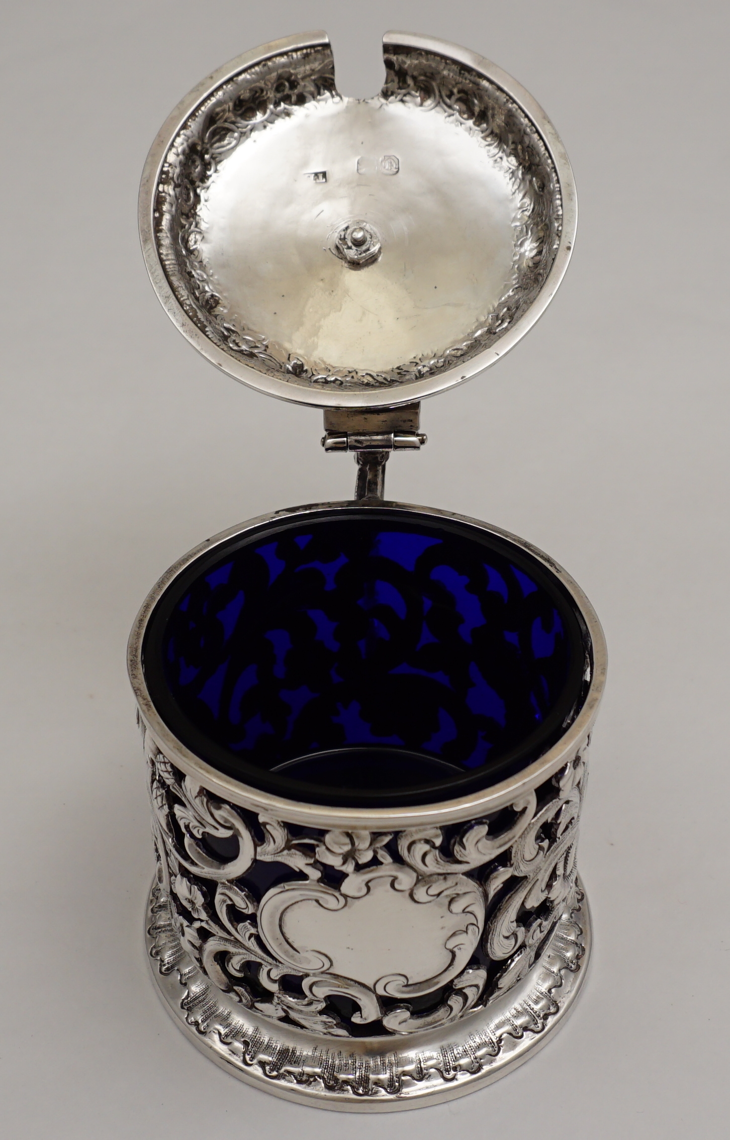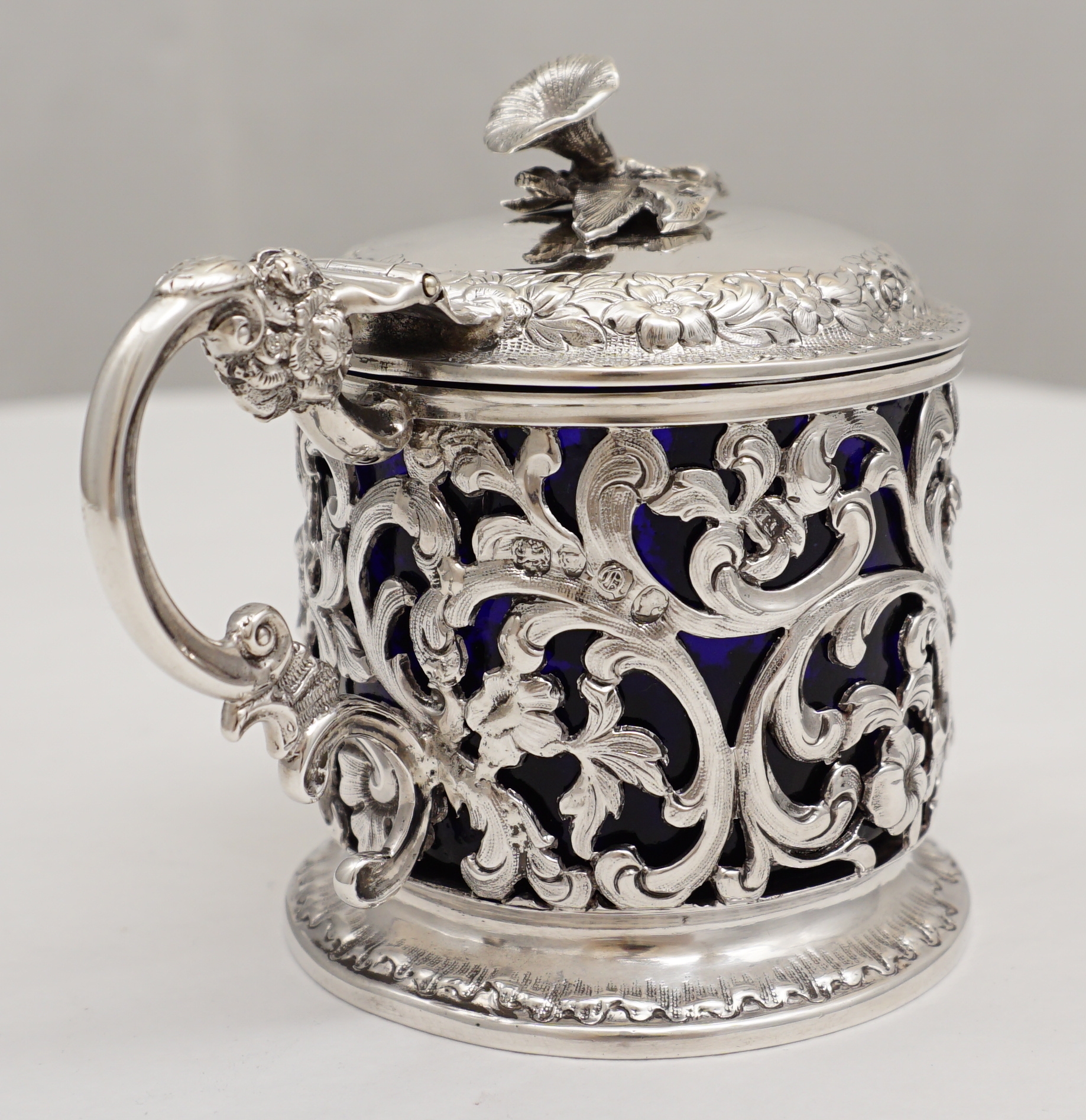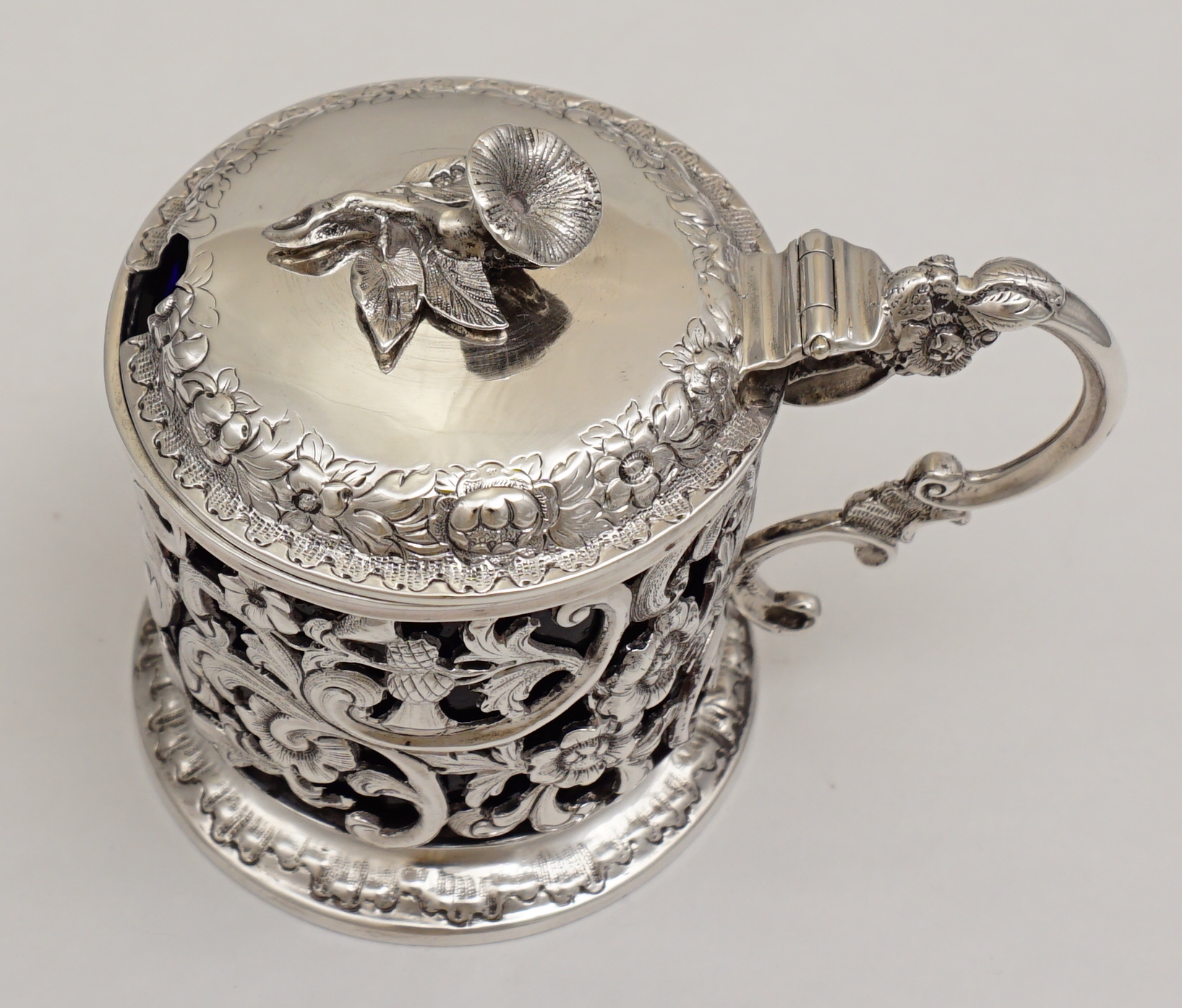 DESCRIPTION | Highest quality and decorative antique English Victorian pierced solid sterling silver mustard pot with beautifully cast silver flower finial, leaf and floral spray capped 'C' scroll and shell handle and handmade bespoke replacement blue glass liner. The pierced body with thistle, flower, foliate and 'C' scroll decoration and a blank rococo cartouche. |