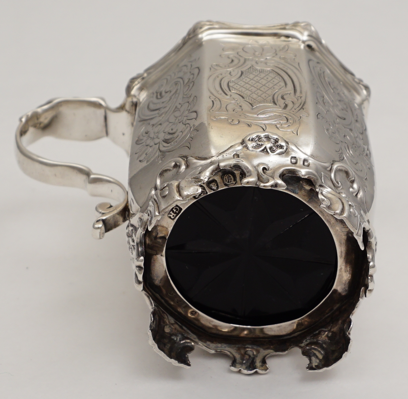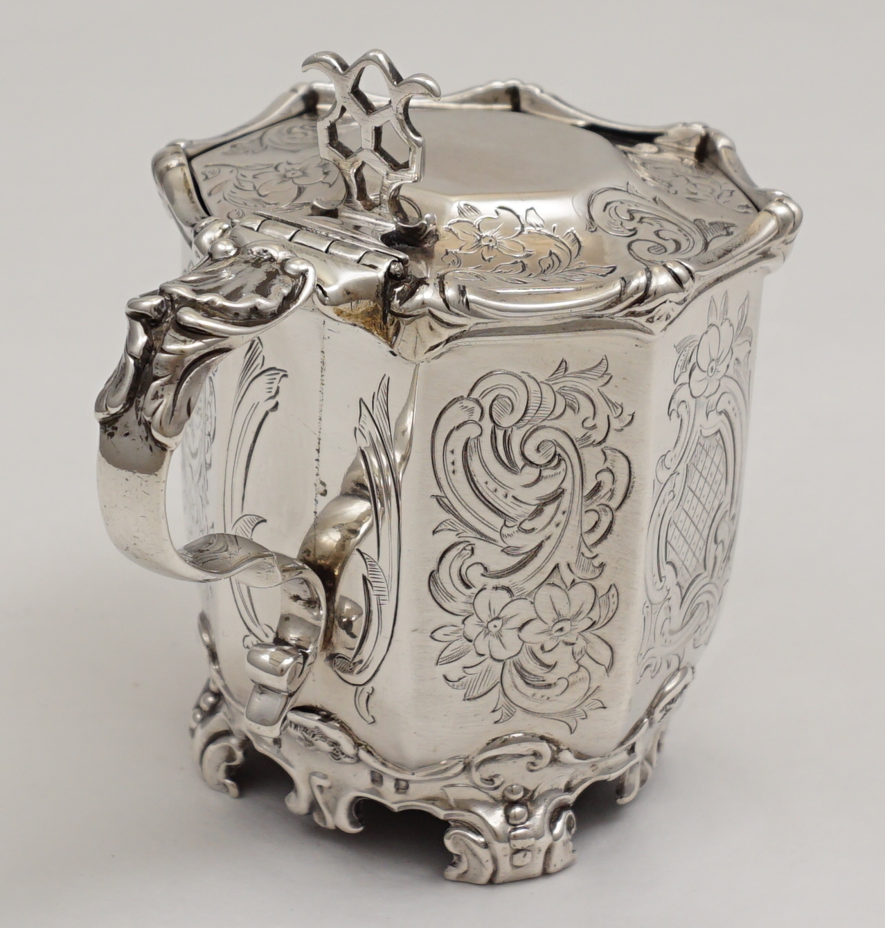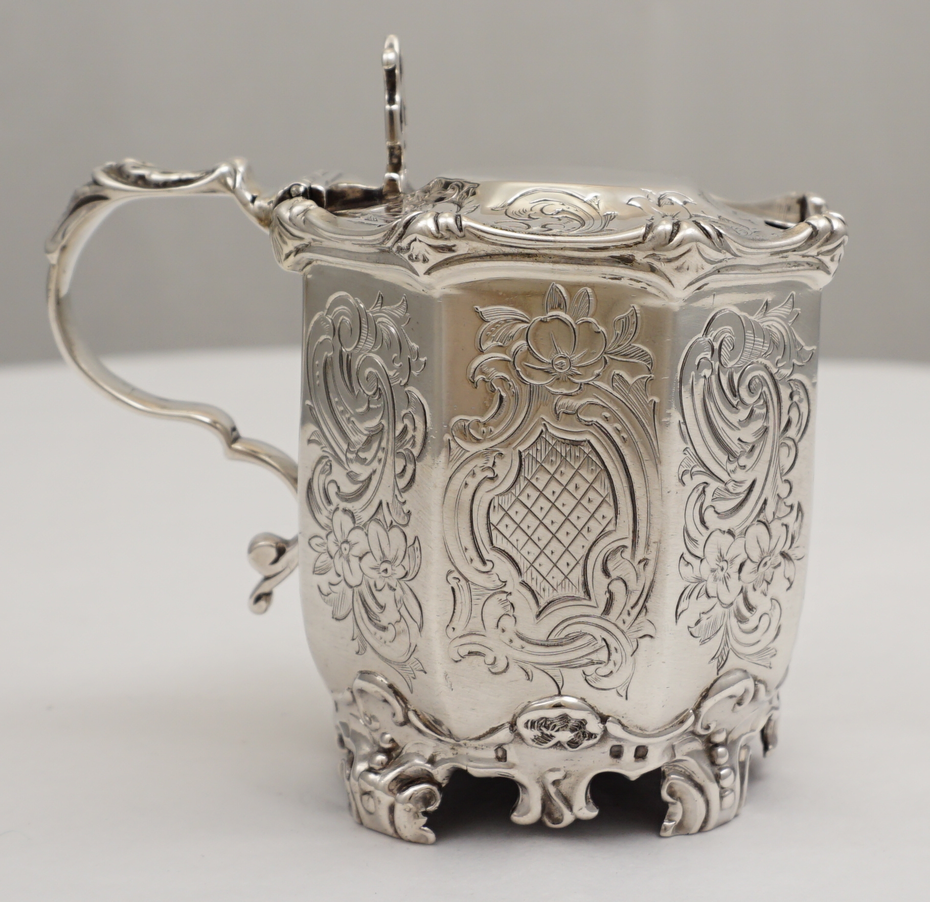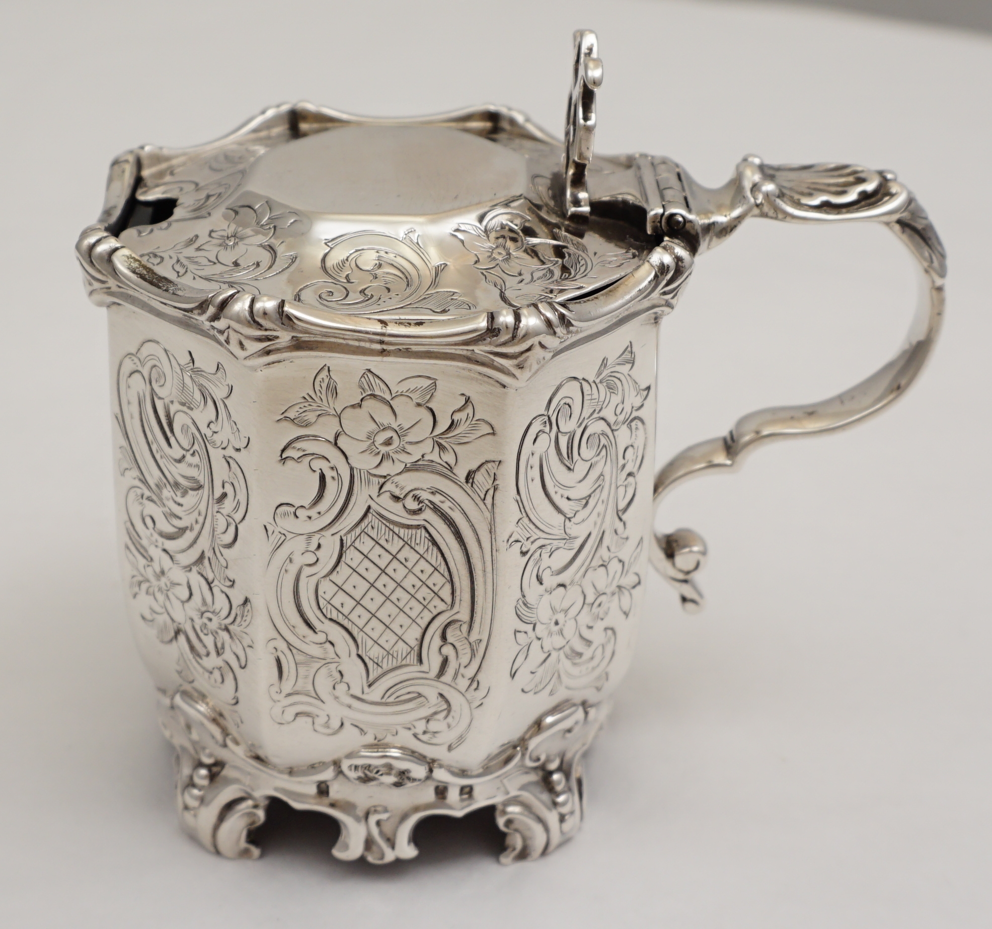 DESCRIPTION | Fine quality antique English Victorian solid sterling silver mustard pot with a shell and leaf capped handle, pierced thumb piece, 'C' scroll and floral engraved decoration, blank rococo cartouche, scrolling stylised acanthus bracket feet and the original blue glass liner with a star cut base. |