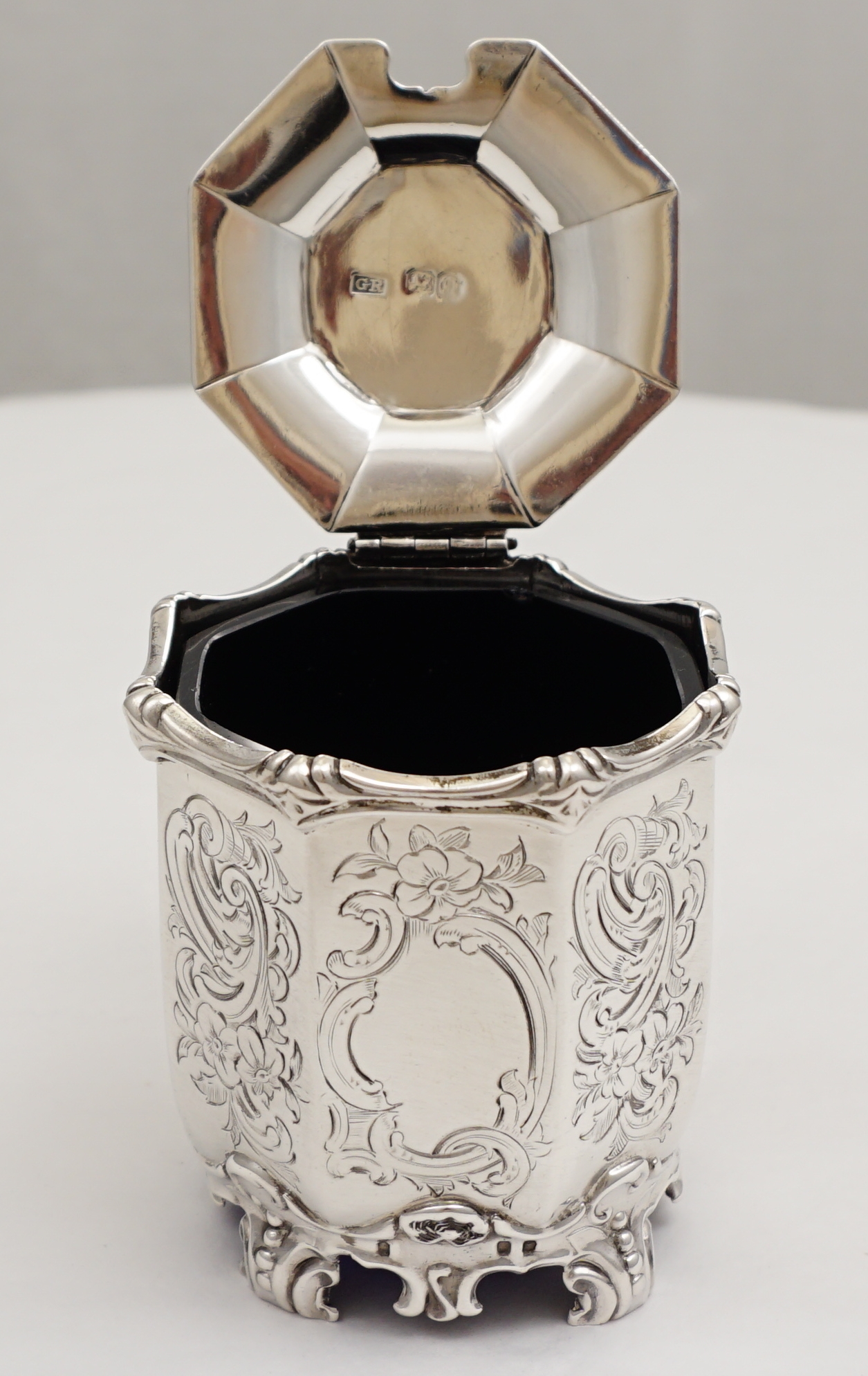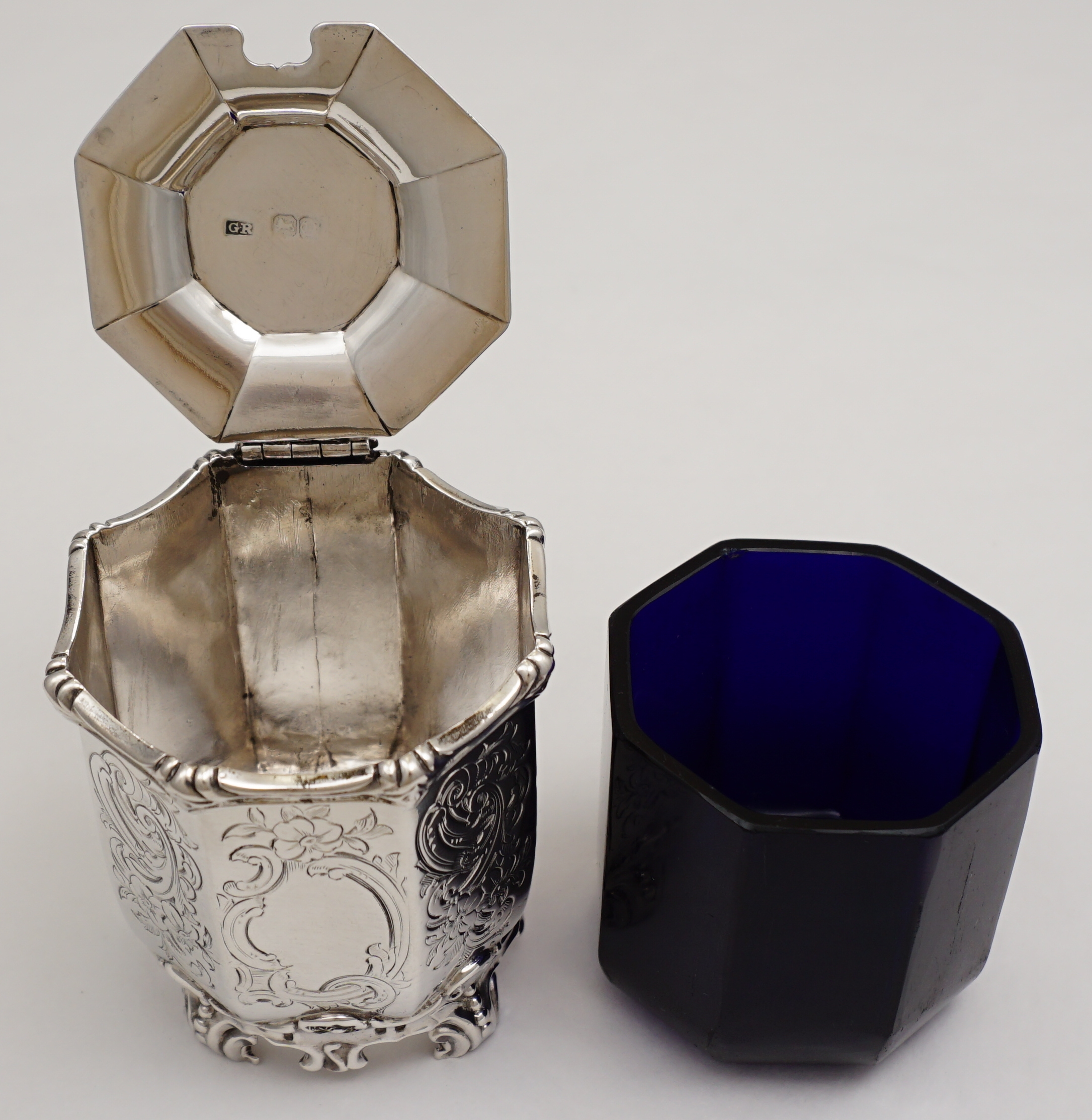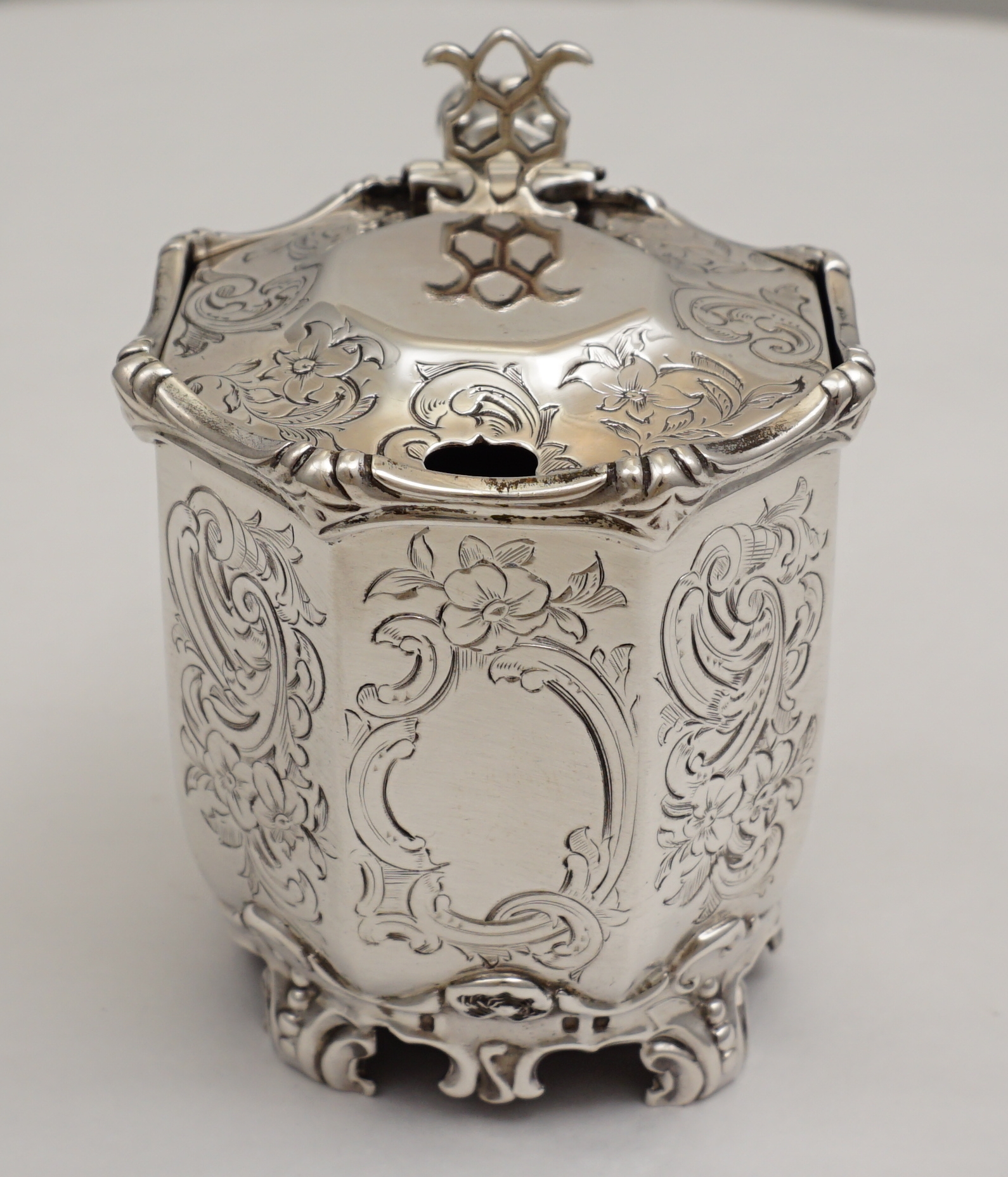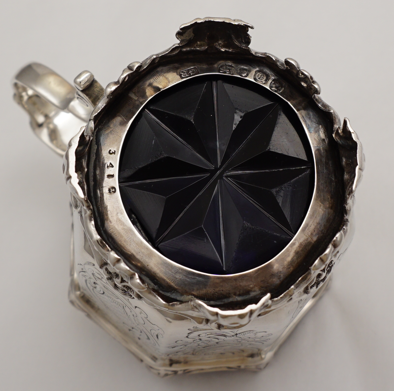 DESCRIPTION | Fine quality antique English Victorian solid sterling silver mustard pot with a shell and leaf capped handle, pierced thumb piece, 'C' scroll and floral engraved decoration, blank rococo cartouche, scrolling stylised acanthus bracket feet and the original blue glass liner with a star cut base. |
