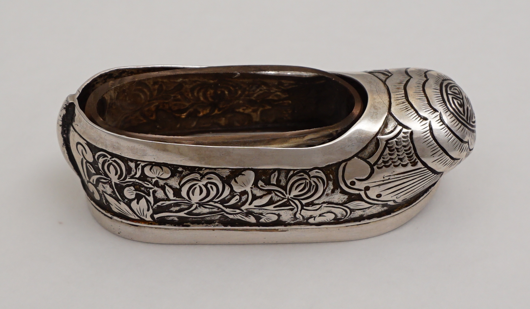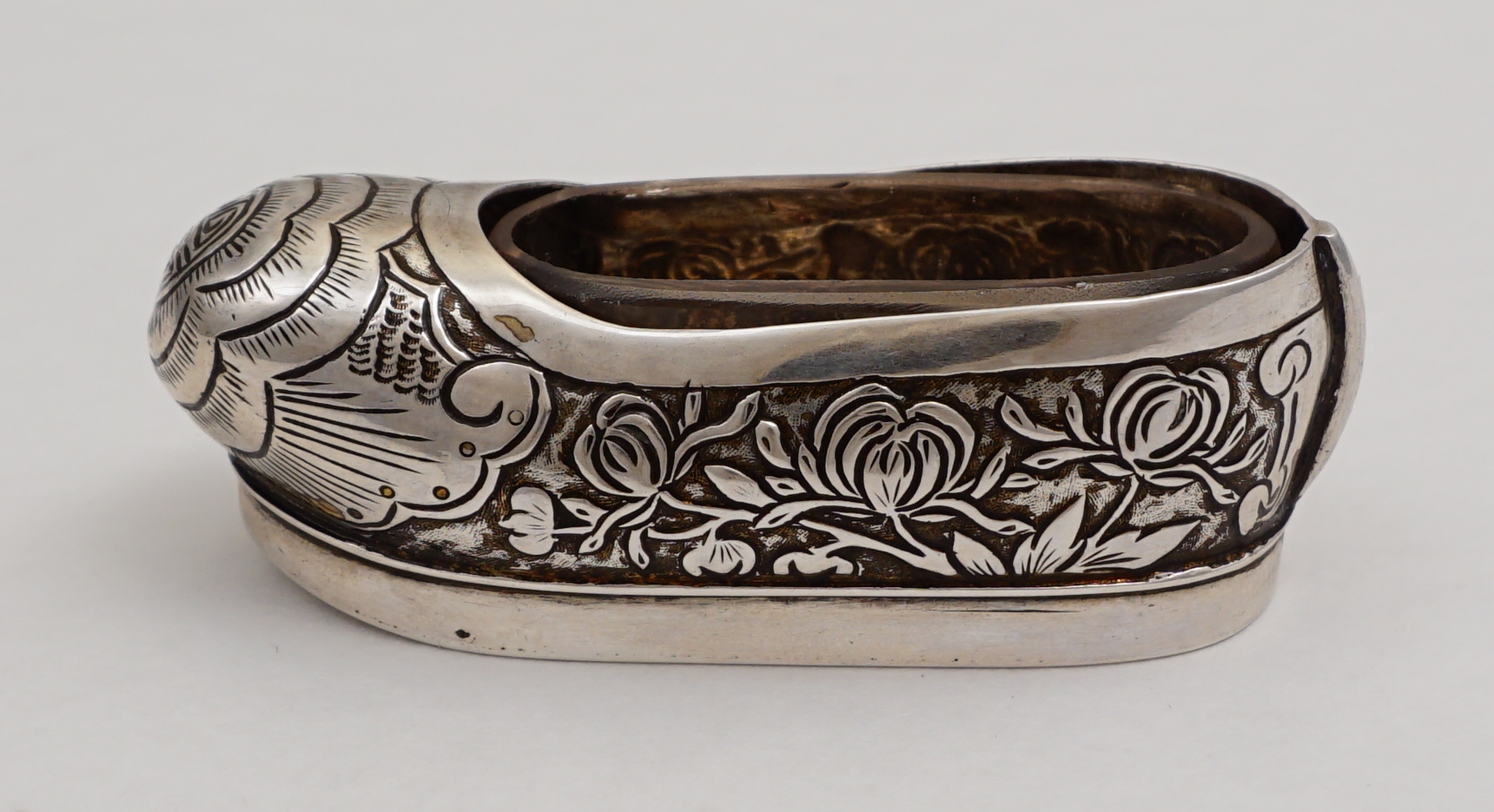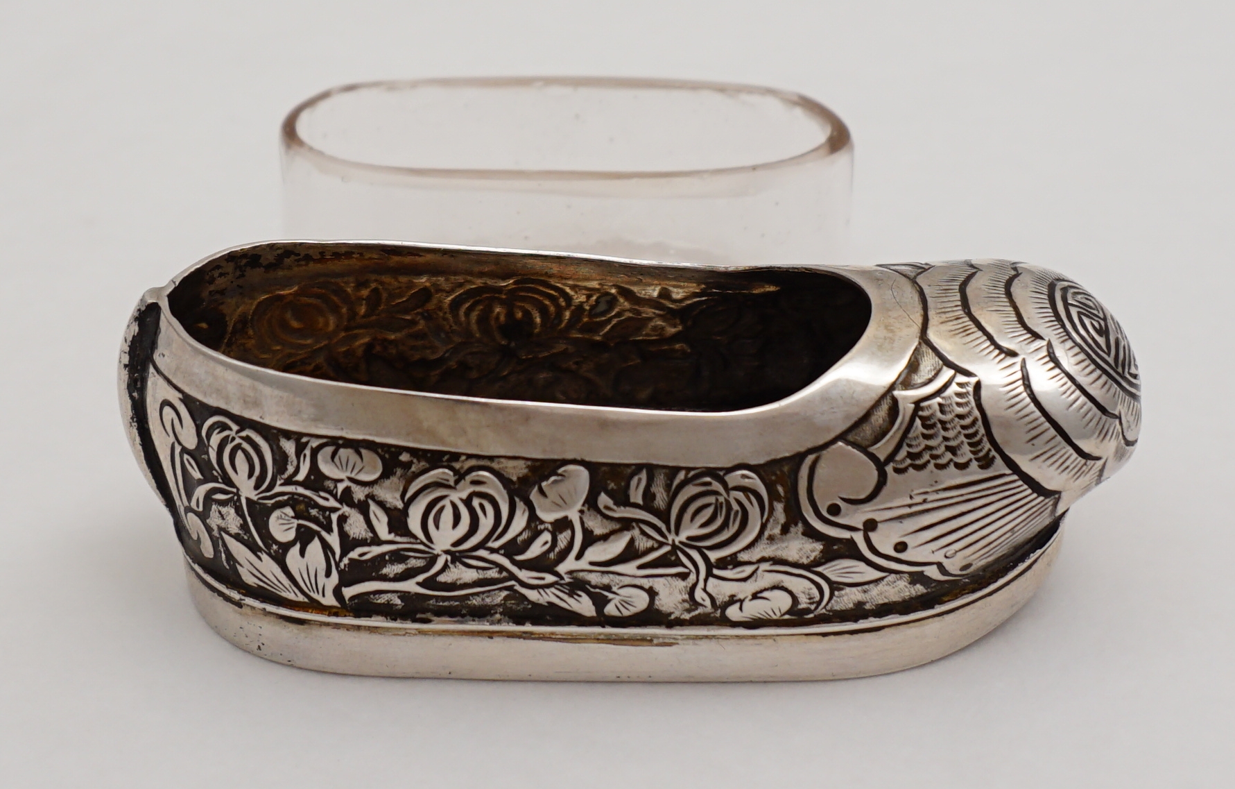 DESCRIPTION | Antique Chinese solid silver salt cellar modelled as a traditional women's shoe and complete with original clear glass liner. |