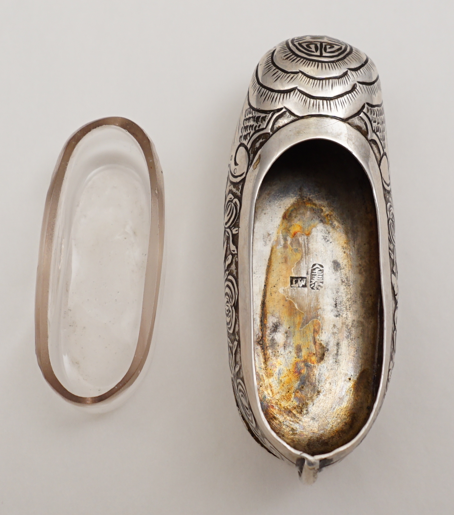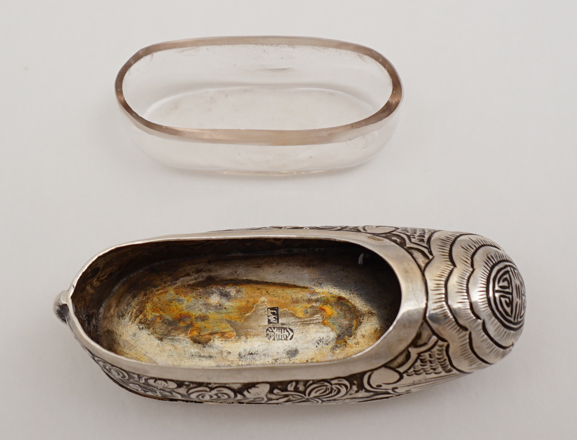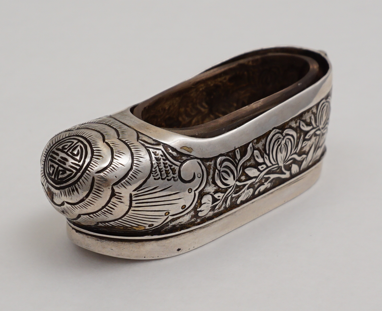 DESCRIPTION | Antique Chinese solid silver salt cellar modelled as a traditional women's shoe and complete with original clear glass liner. |