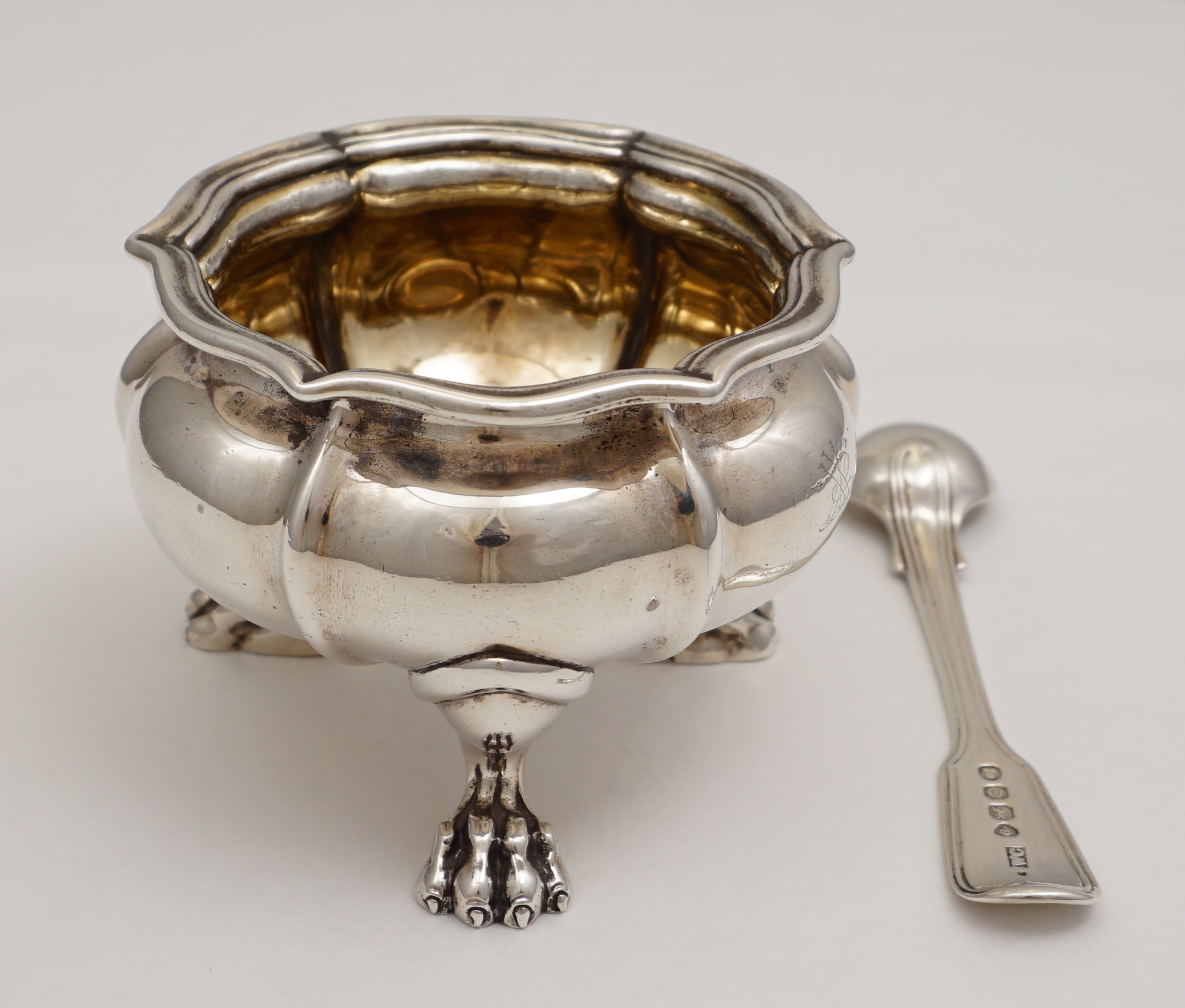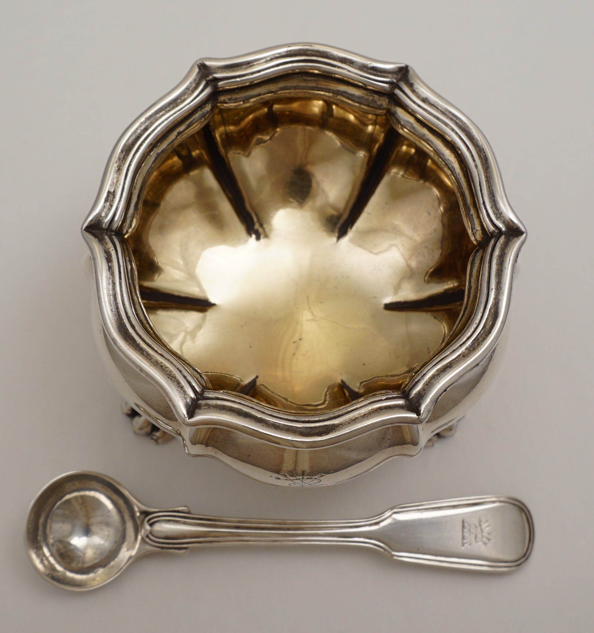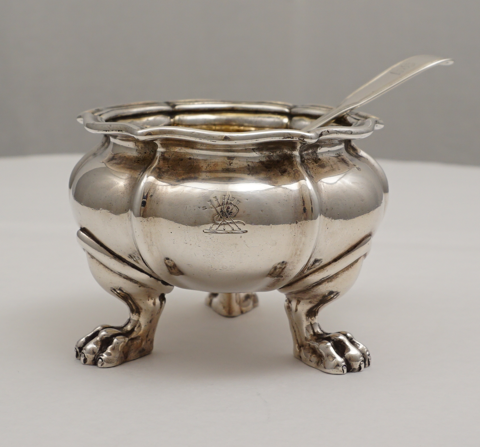 DESCRIPTION | Superb, highest quality, antique English Georgian cast solid sterling silver salt with a gilded interior and Fiddle & Thread pattern spoon. Matching crests and will have been together since 1829. The salt is almost unnecessarily heavy and the lion's paw feet beautifully formed. When you are making some of the finest silver the world has ever seen, about to receive a Royal Appointment and you have the one of the world's greatest spoonmakers next door it makes good sense to buy in your stock spoons. Some may think this salt a bit expensive but the moment you hold it in your hand you will understand. |