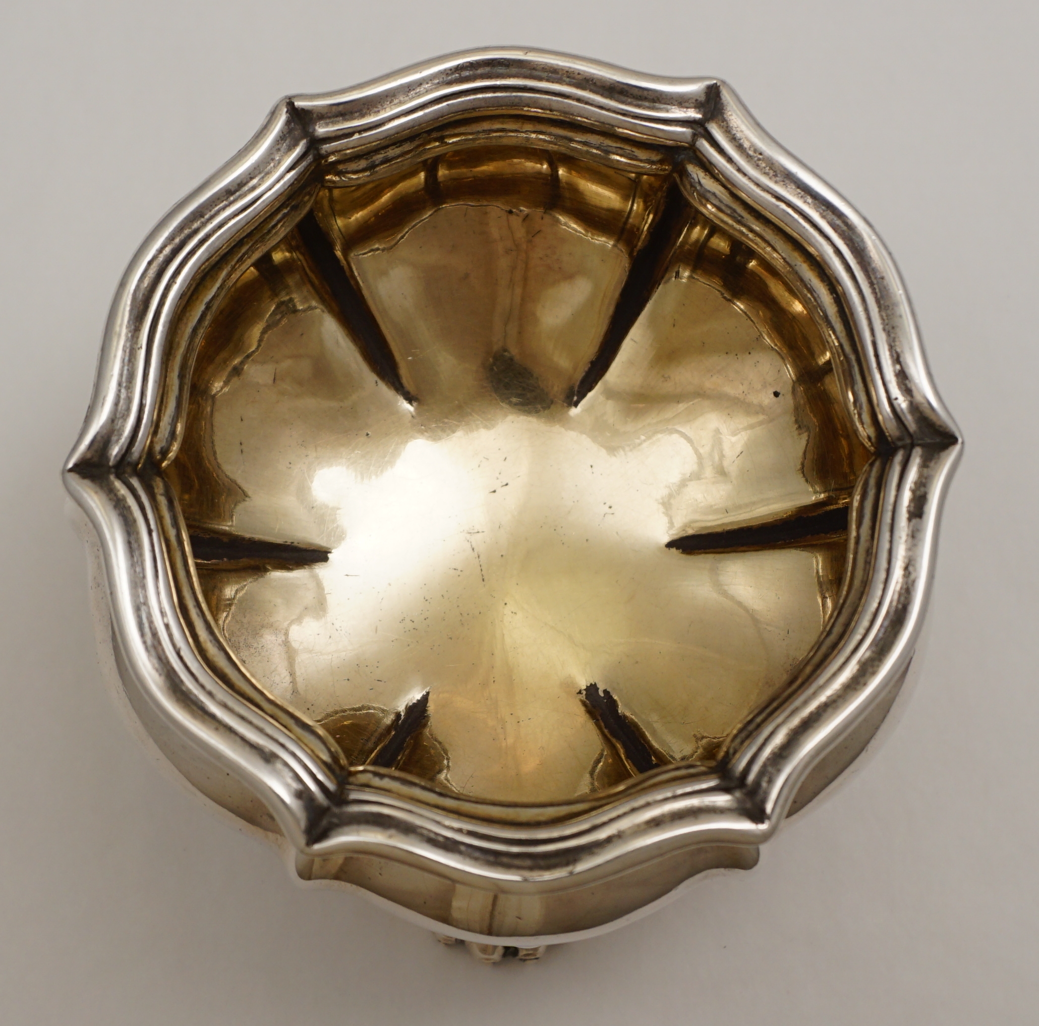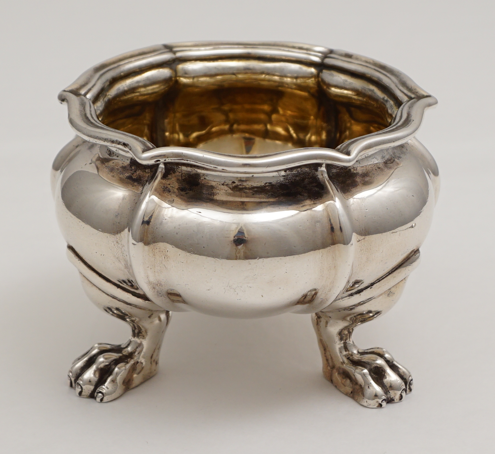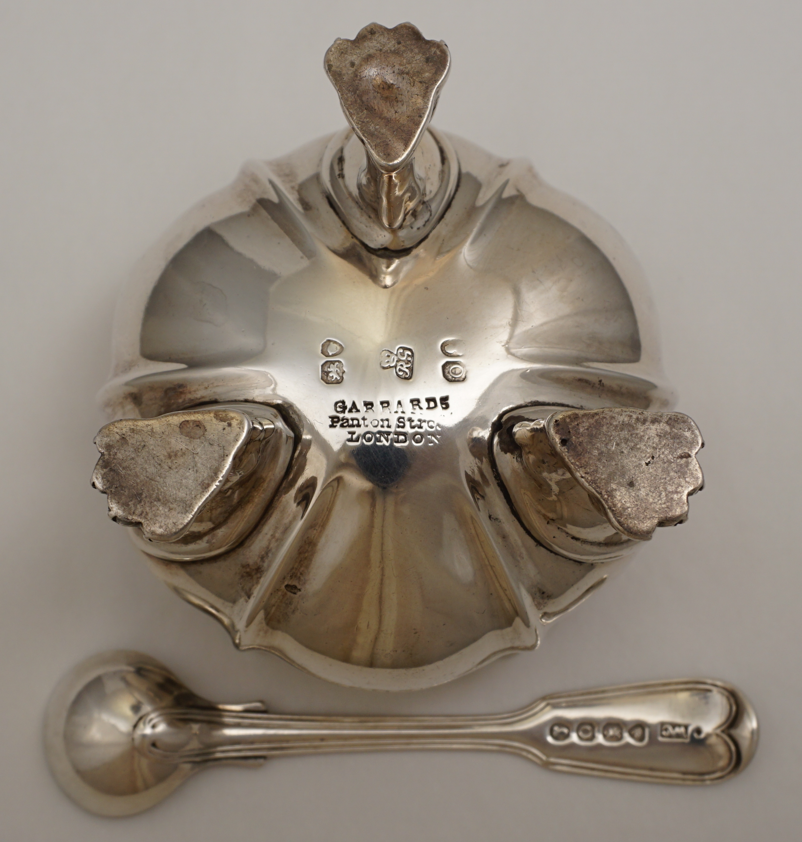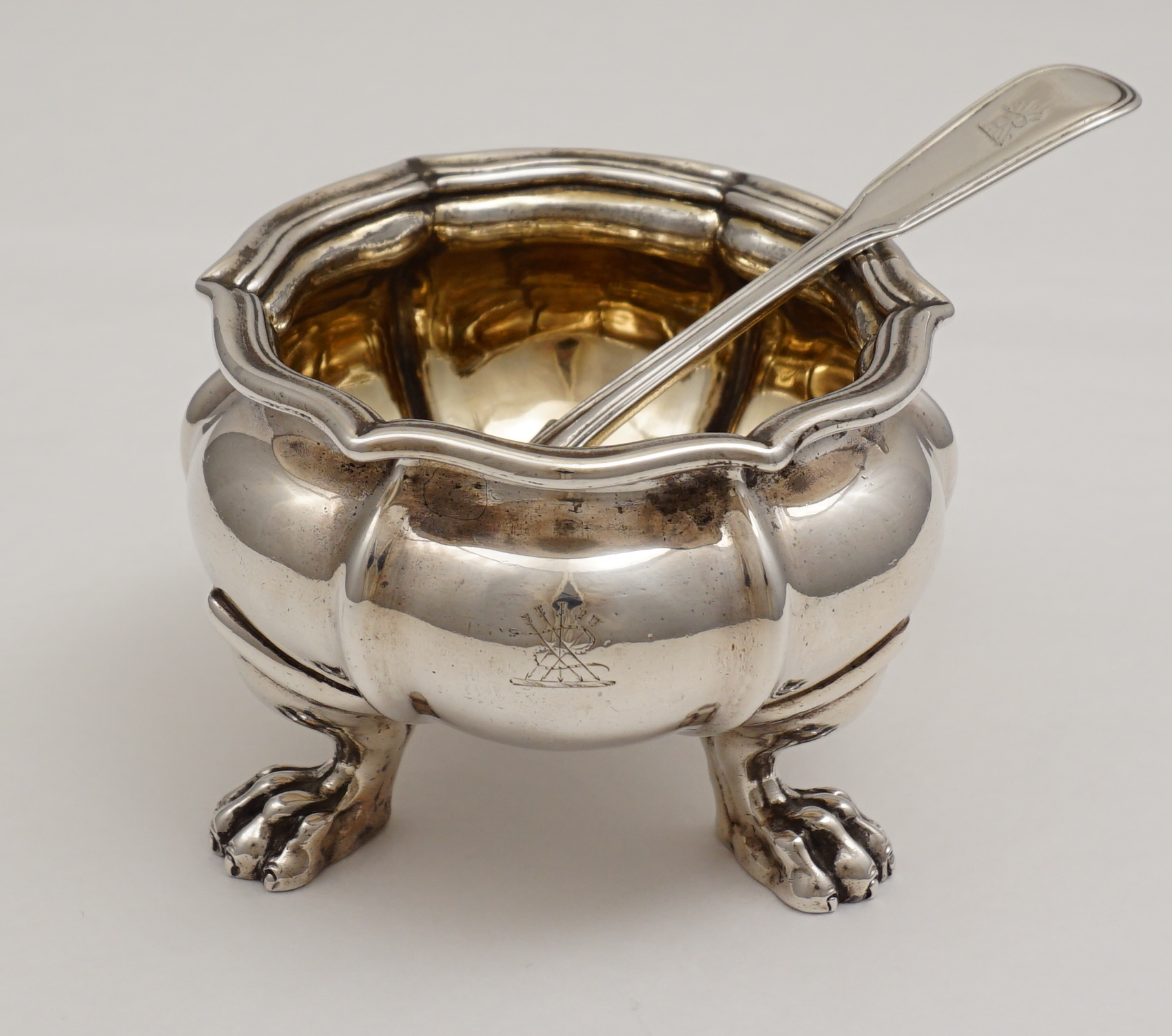 DESCRIPTION | Superb, highest quality, antique English Georgian cast solid sterling silver salt with a gilded interior and Fiddle & Thread pattern spoon. Matching crests and will have been together since 1829. The salt is almost unnecessarily heavy and the lion's paw feet beautifully formed. When you are making some of the finest silver the world has ever seen, about to receive a Royal Appointment and you have the one of the world's greatest spoonmakers next door it makes good sense to buy in your stock spoons. Some may think this salt a bit expensive but the moment you hold it in your hand you will understand. |