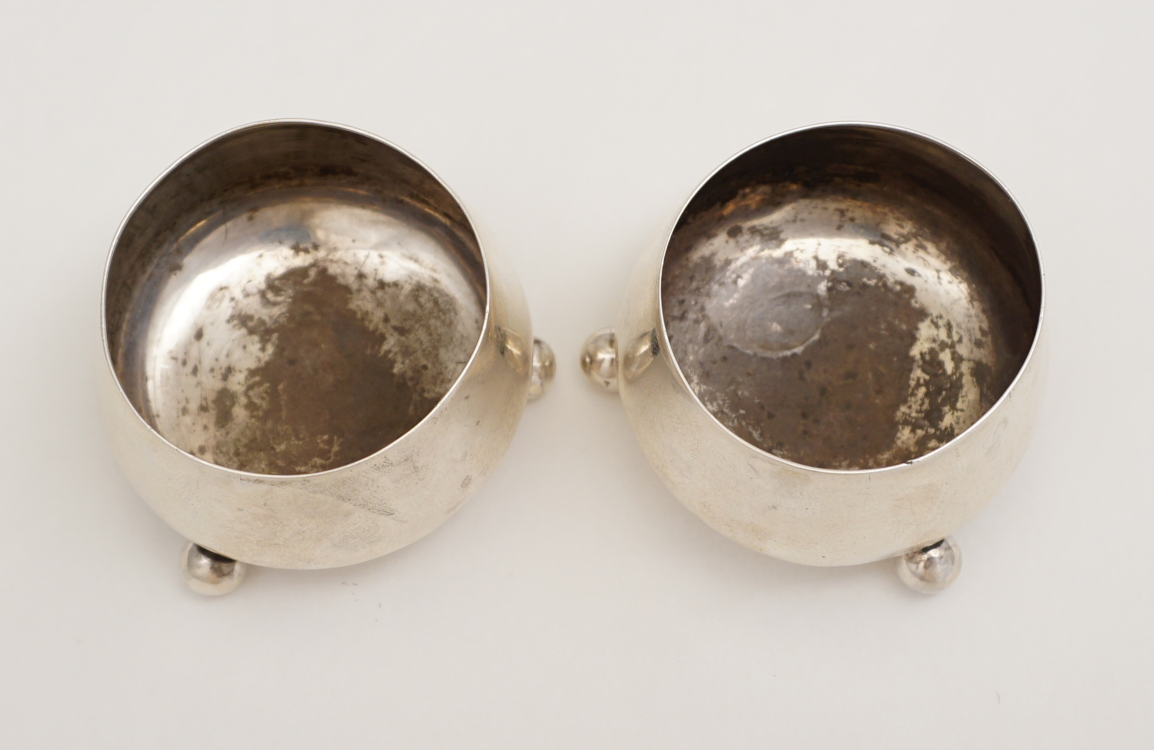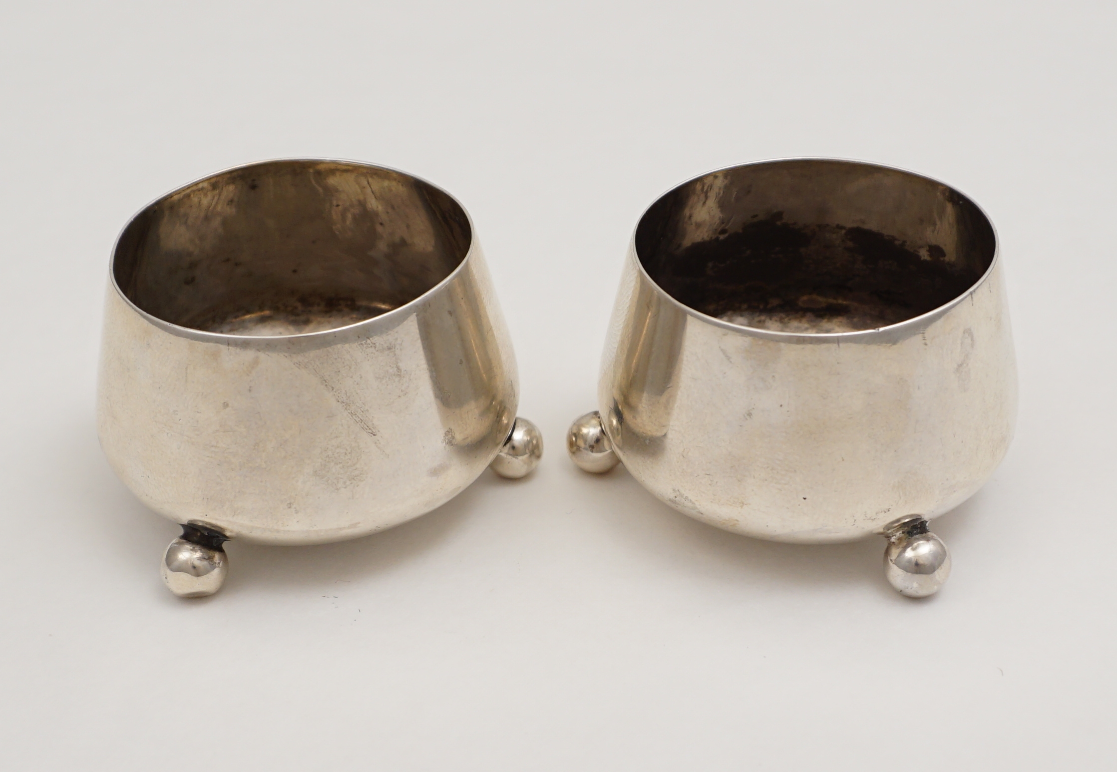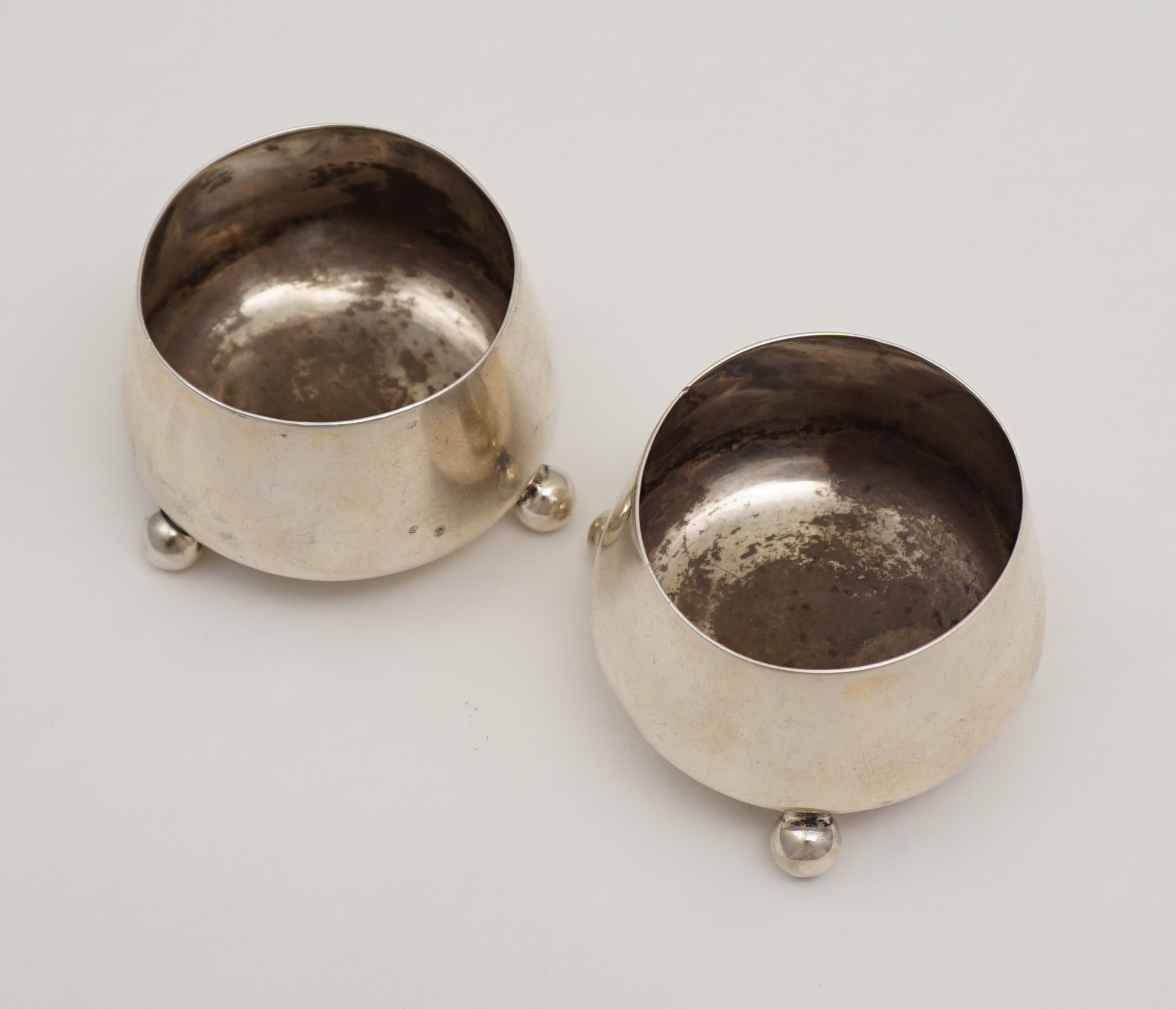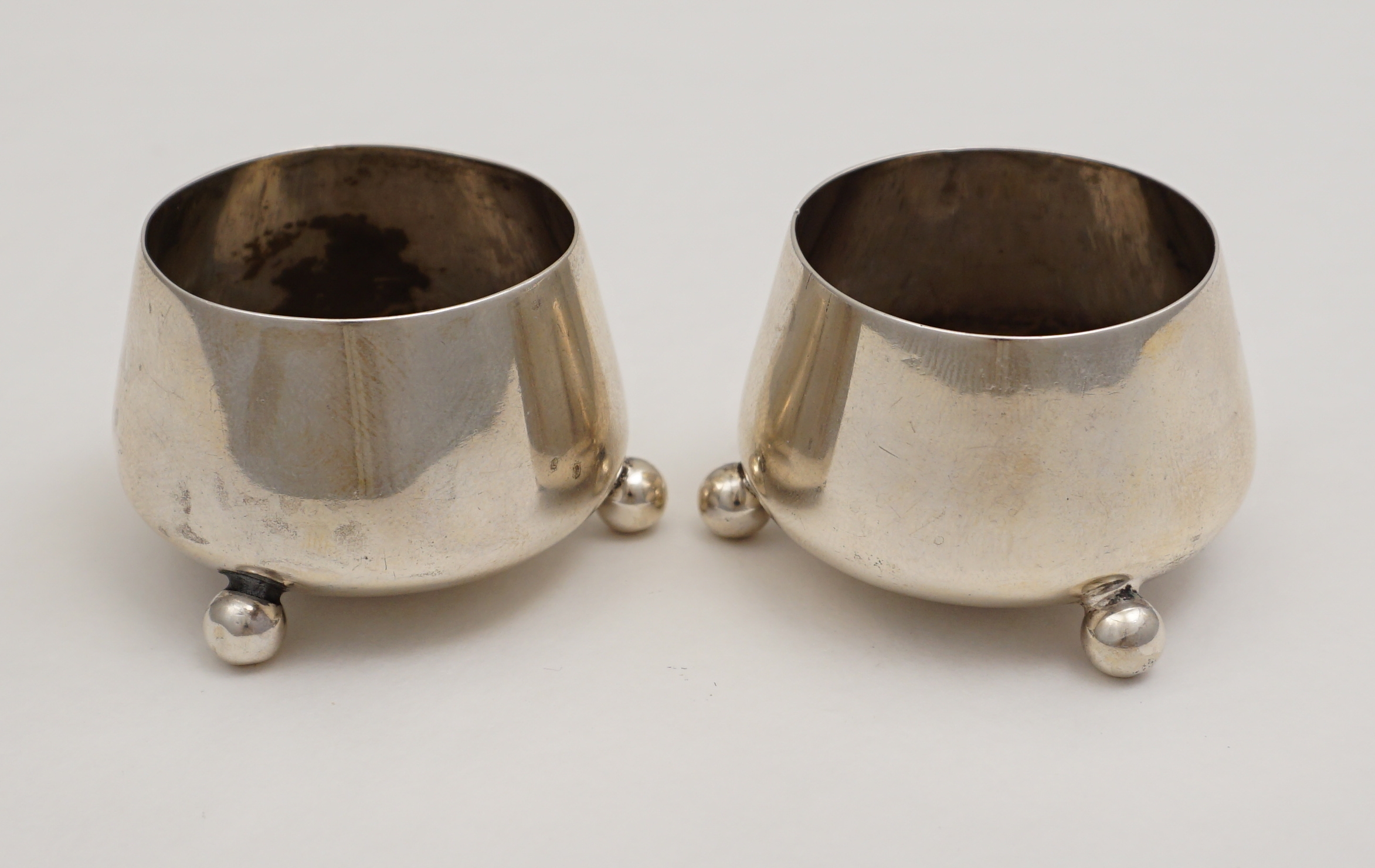 DESCRIPTION | Pair of antique English Victorian solid sterling silver round tub salts on ball feet. I would consider professional polish for +£16 the pair or internal gilding & professional polish for +£48 the pair. If required, stock glass liners in various colours can be found inexpensively online, they may not be a perfect fit but should be ok. |