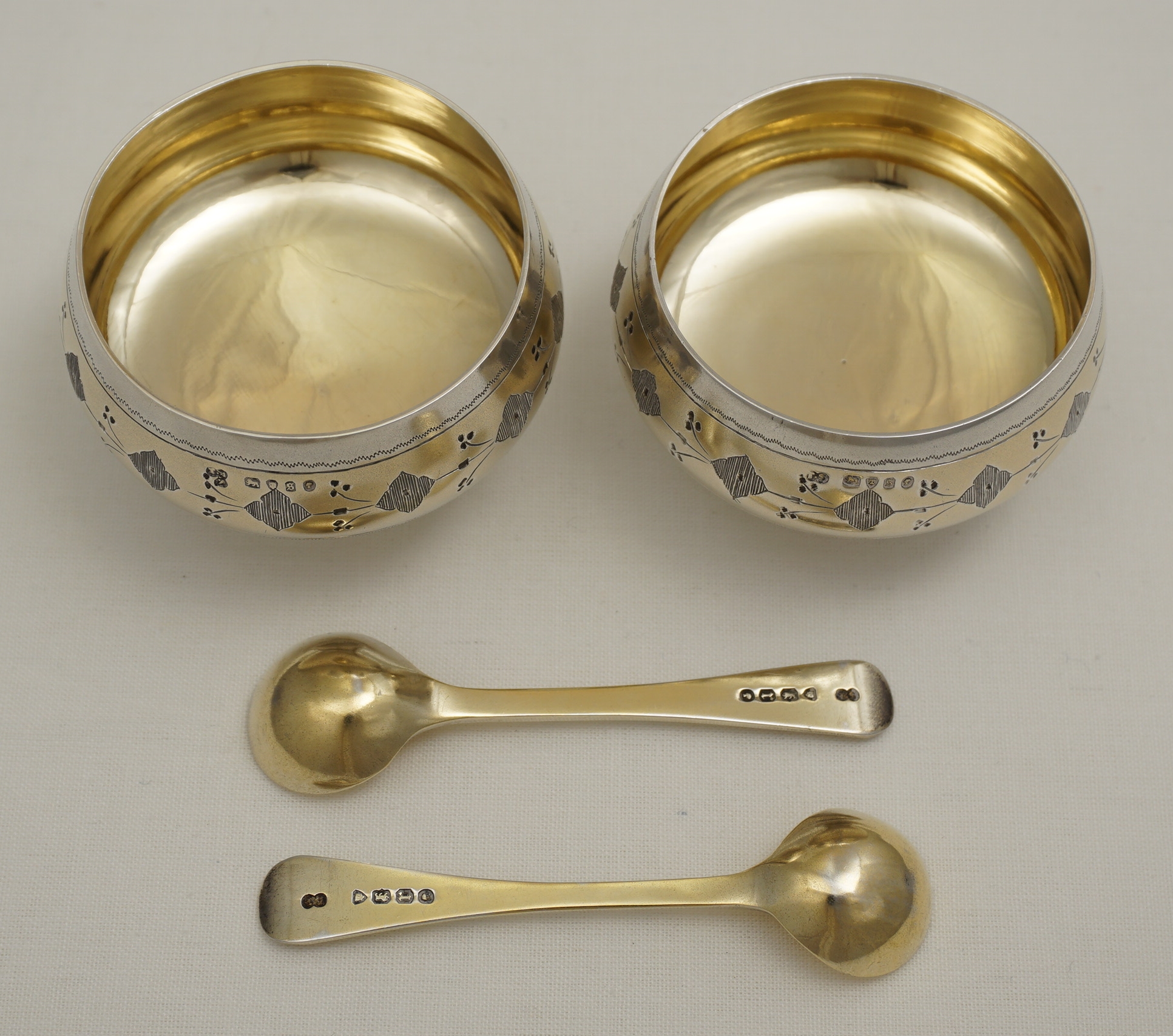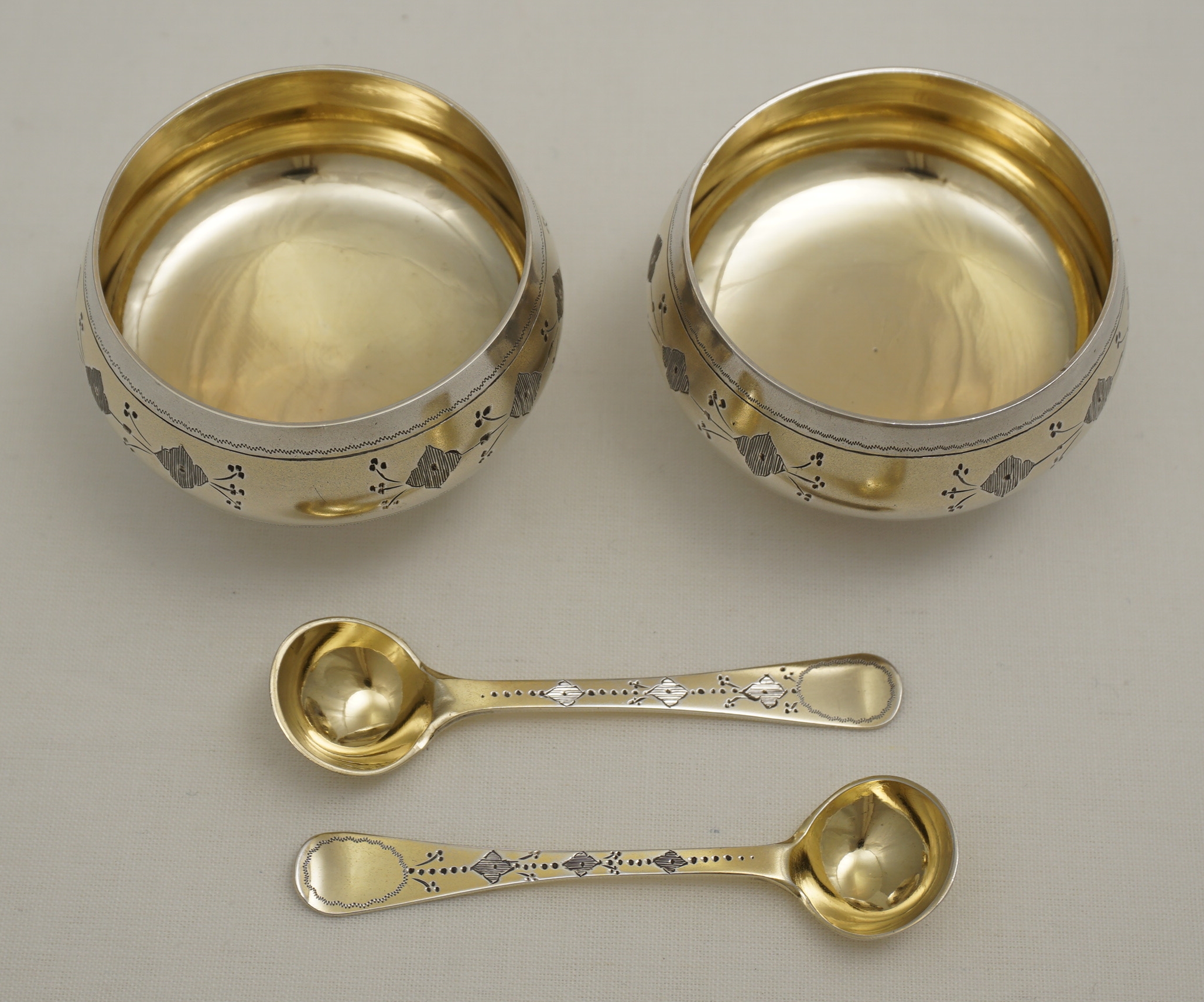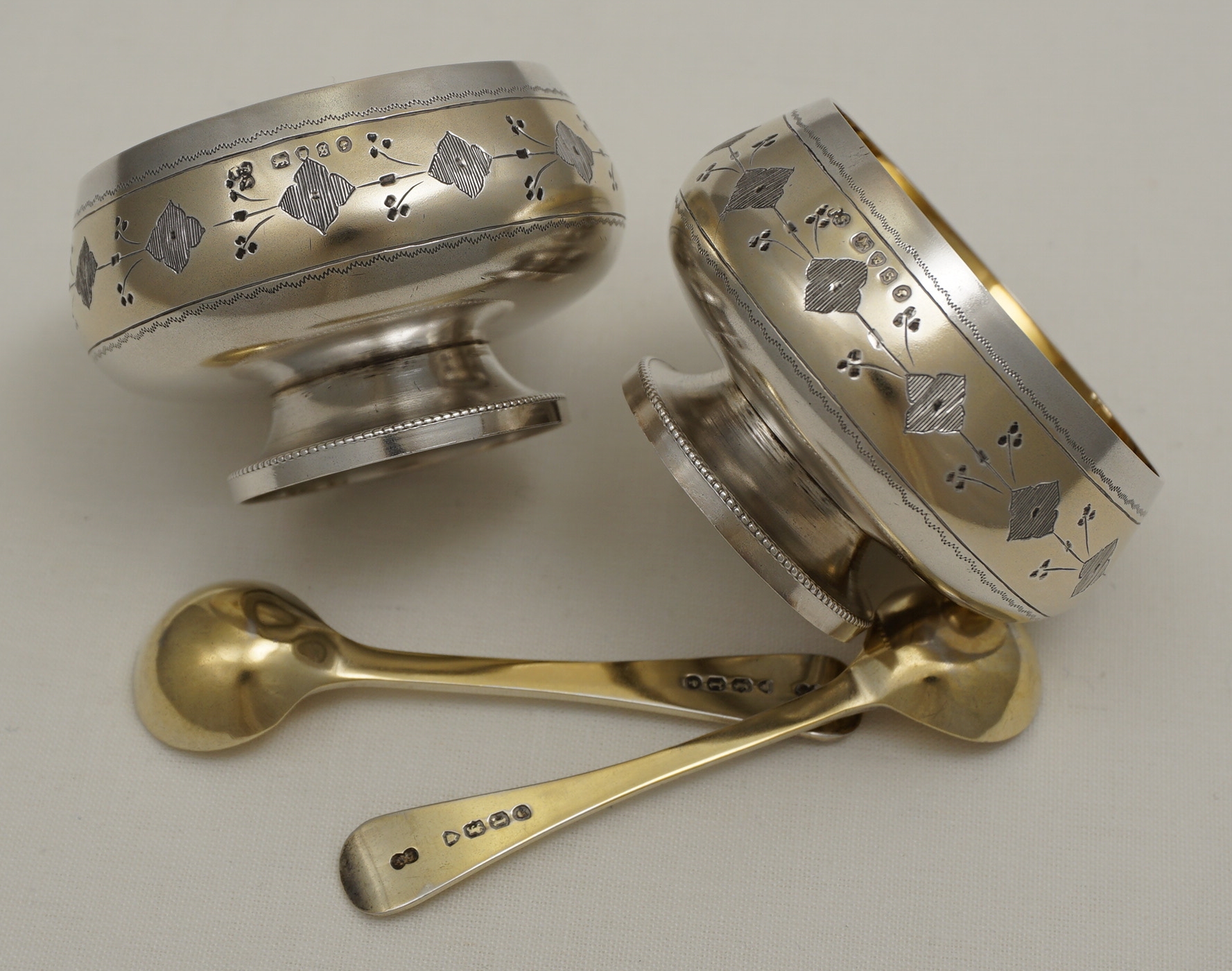 DESCRIPTION | Stunningly beautiful pair of antique English Victorian solid sterling silver gilt salts and spoons. I usually recommend that silver be used but these are just too pretty and are perhaps more suited to a lit display cabinet. |