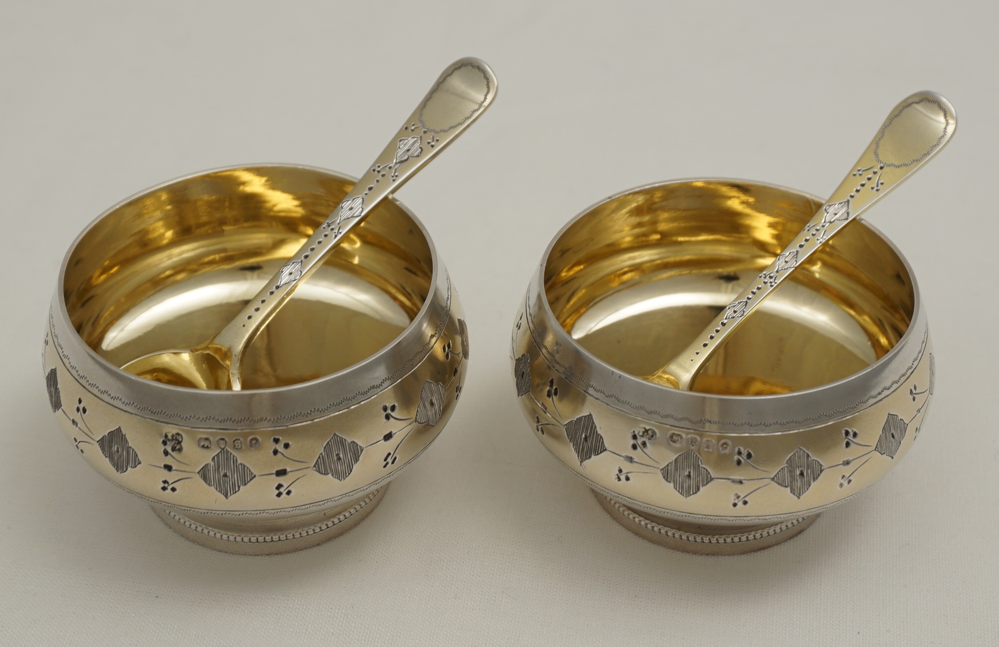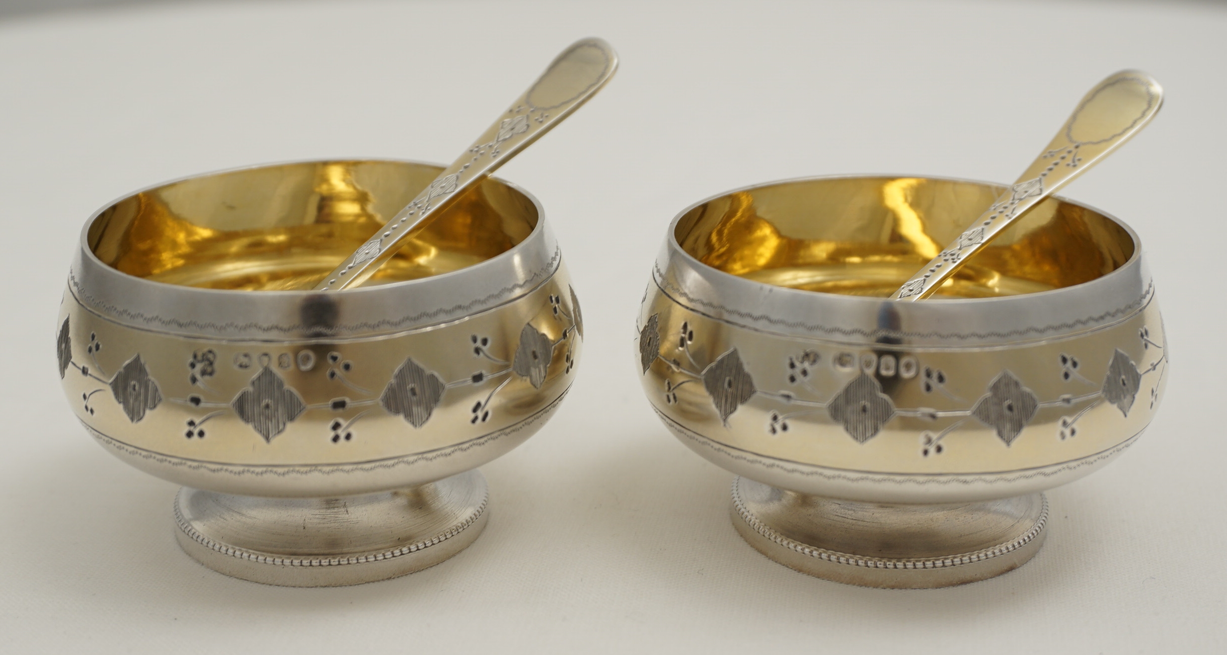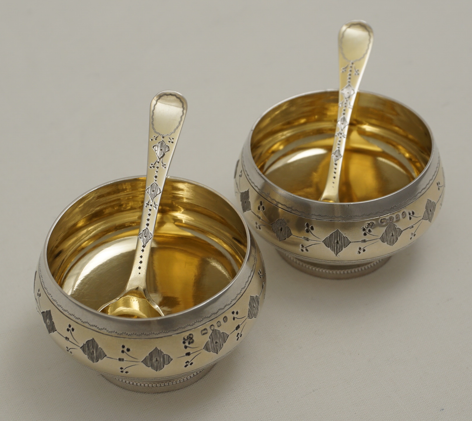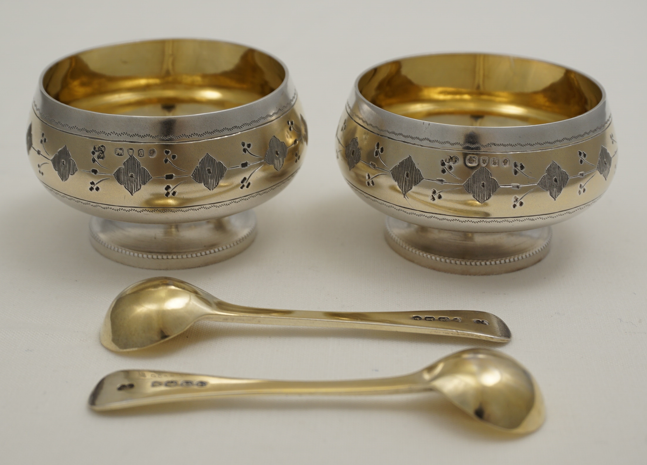 DESCRIPTION | Stunningly beautiful pair of antique English Victorian solid sterling silver gilt salts and spoons. I usually recommend that silver be used but these are just too pretty and are perhaps more suited to a lit display cabinet. |