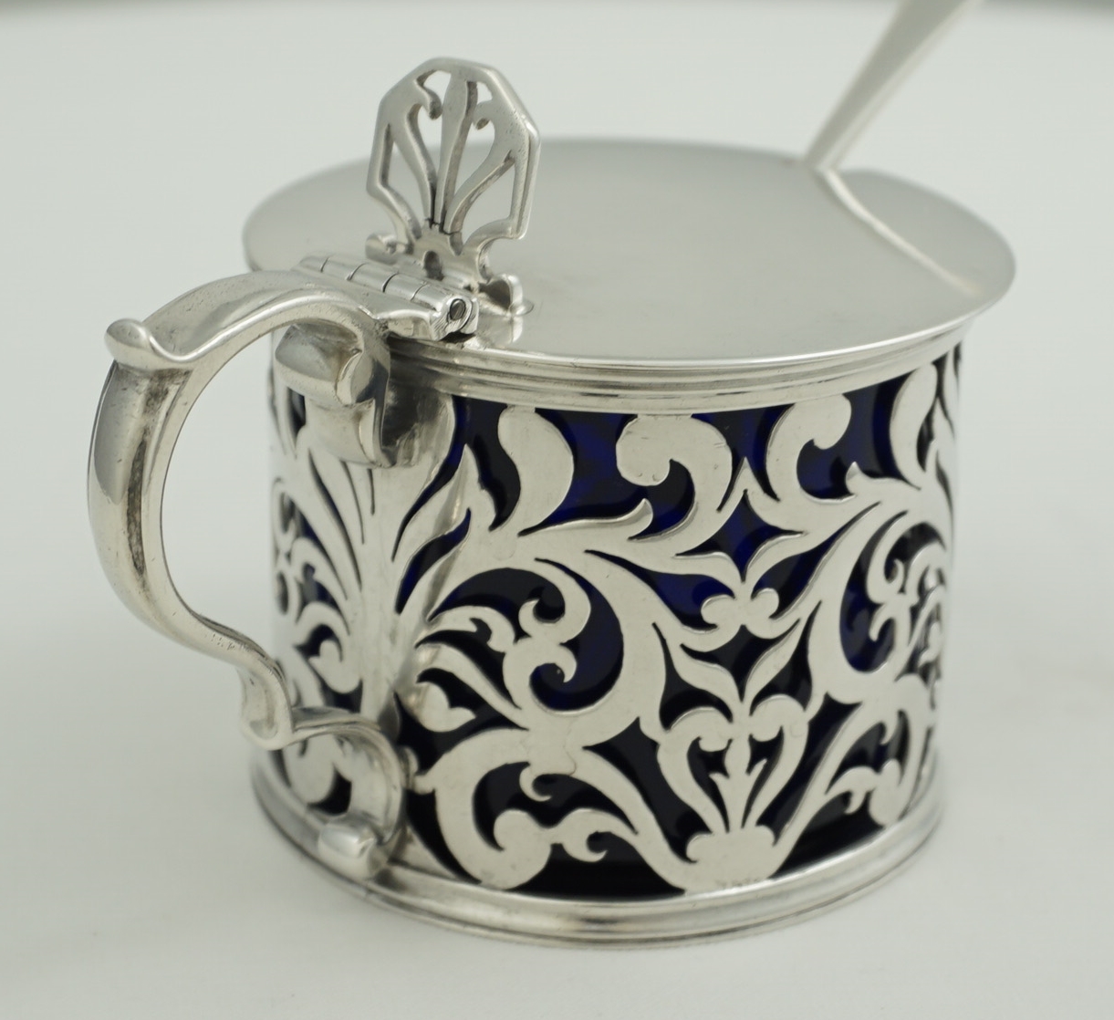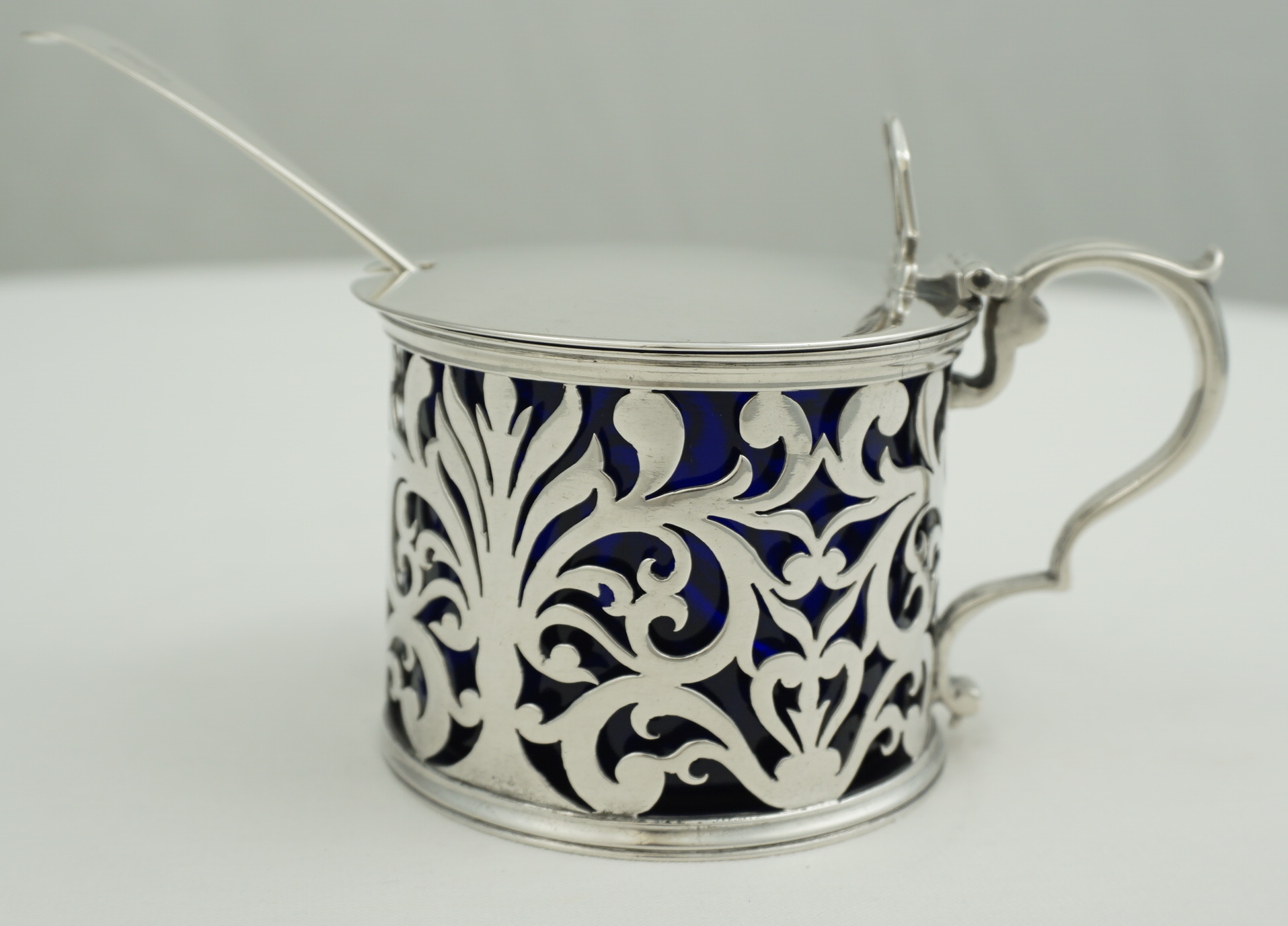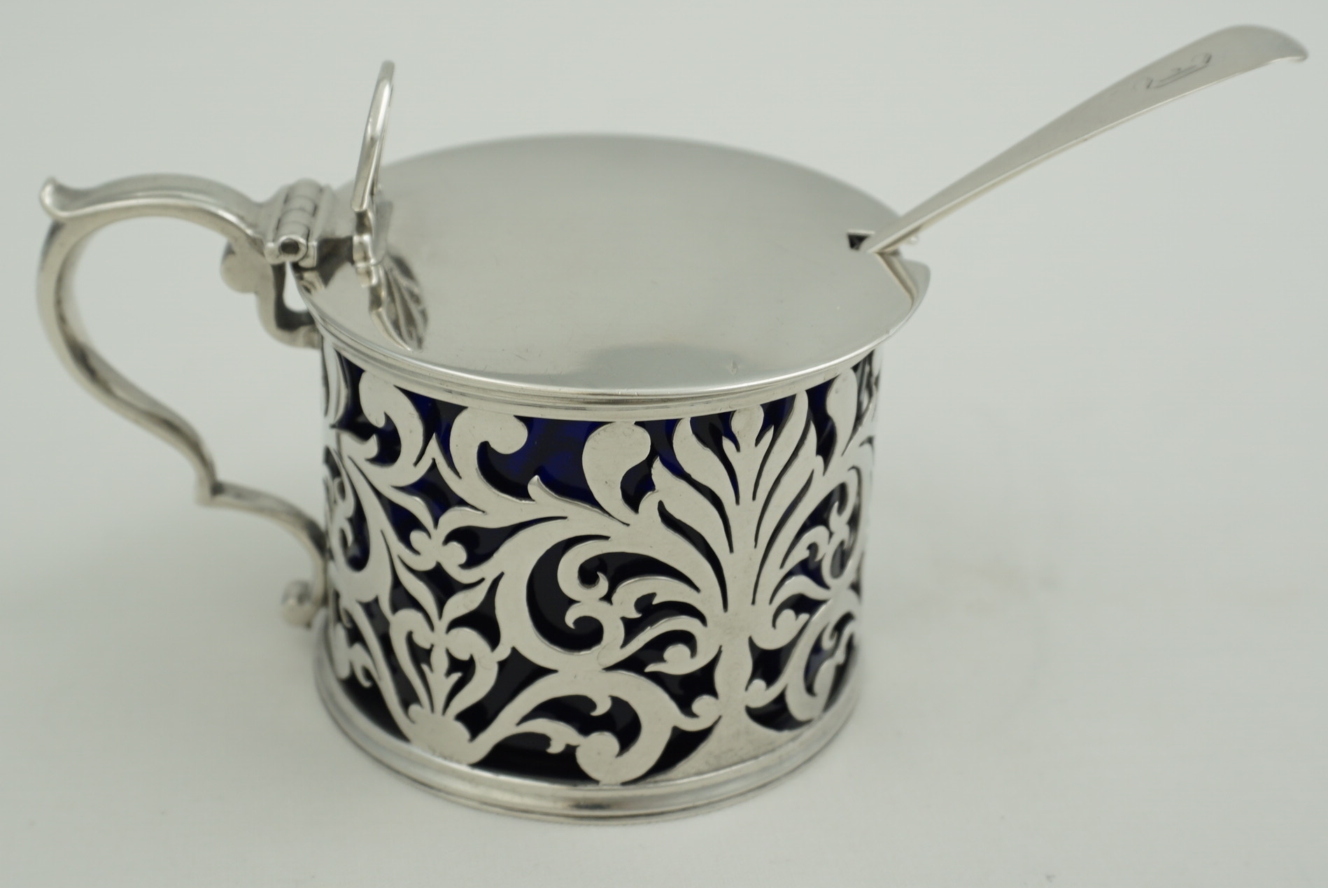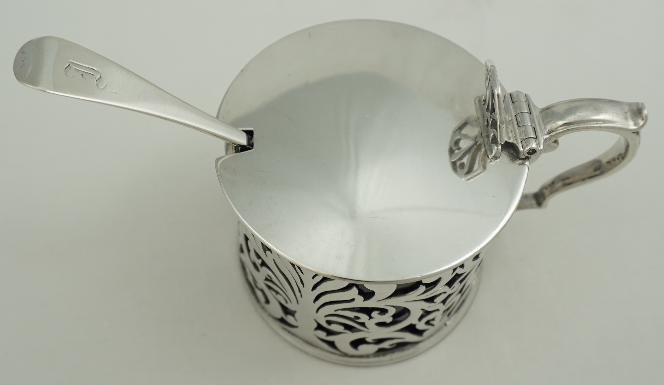 DESCRIPTION | Very good antique English early Victorian solid sterling silver mustard pot with pierced decoration. The ladle is associated, details below, but is a good fit and delivers a satisfying dollop. |