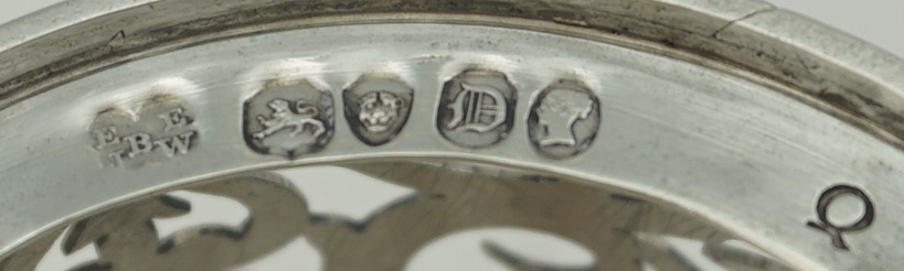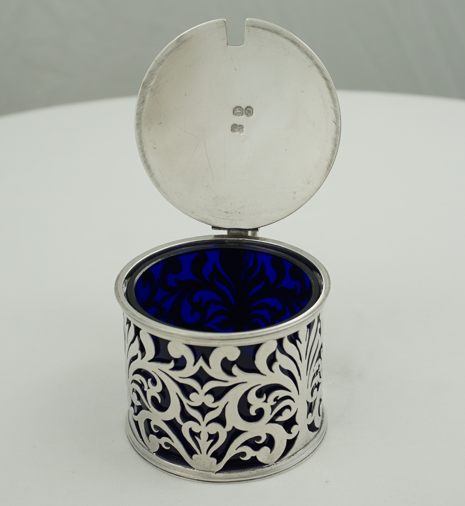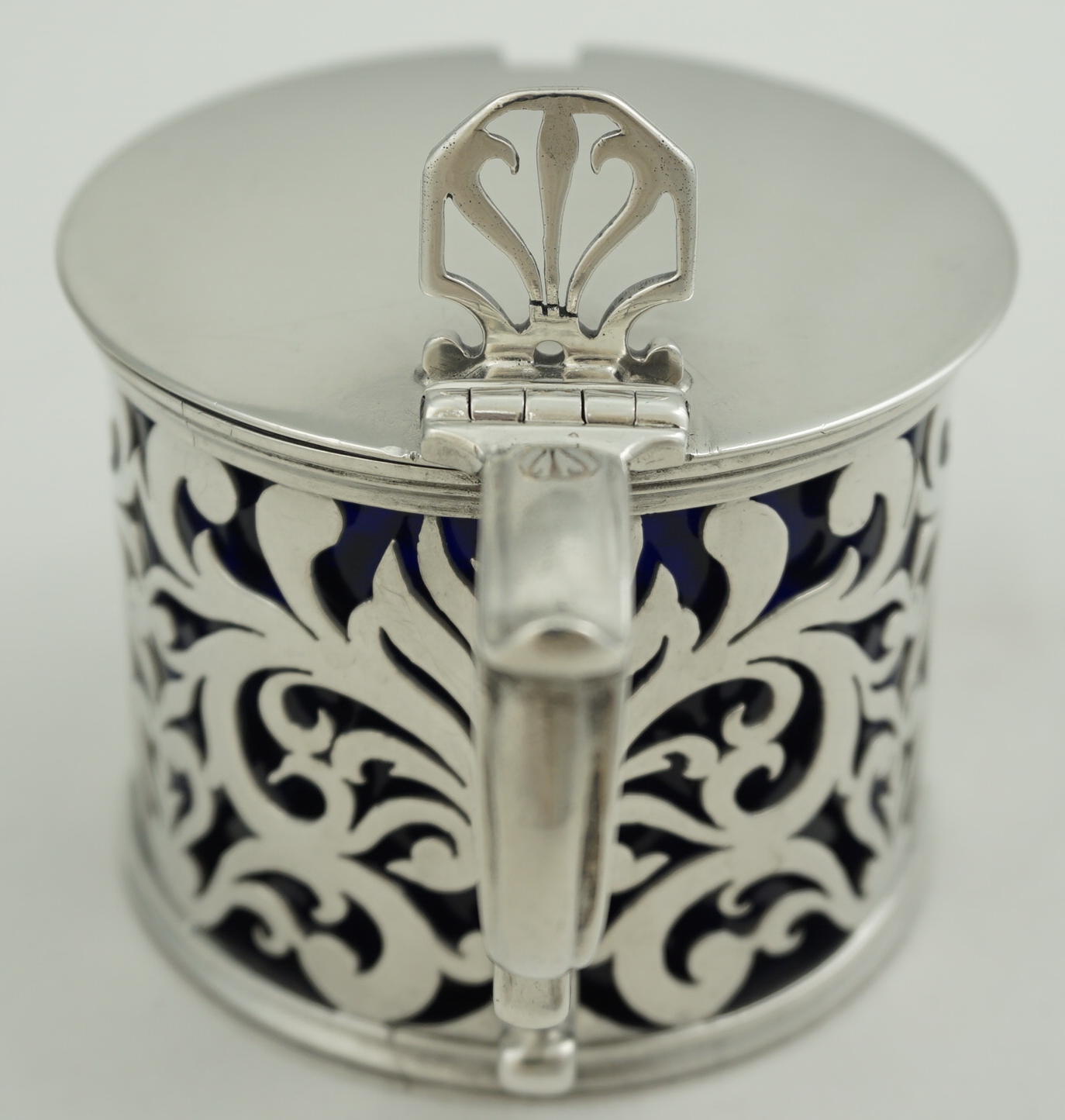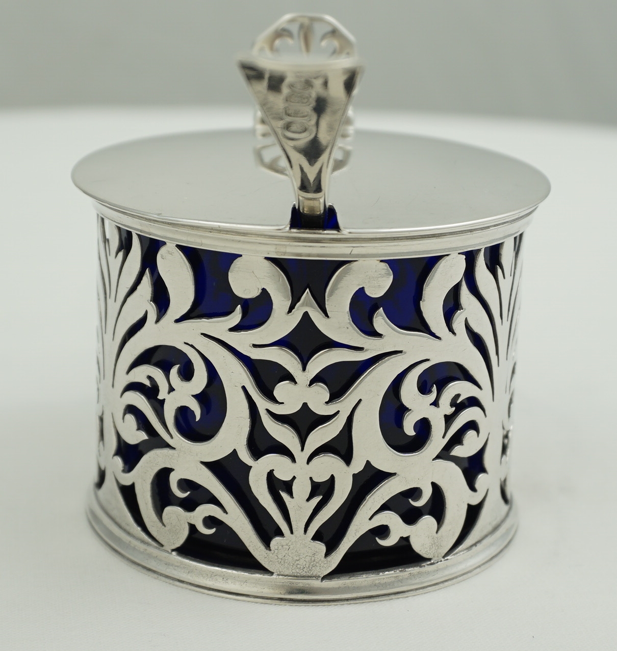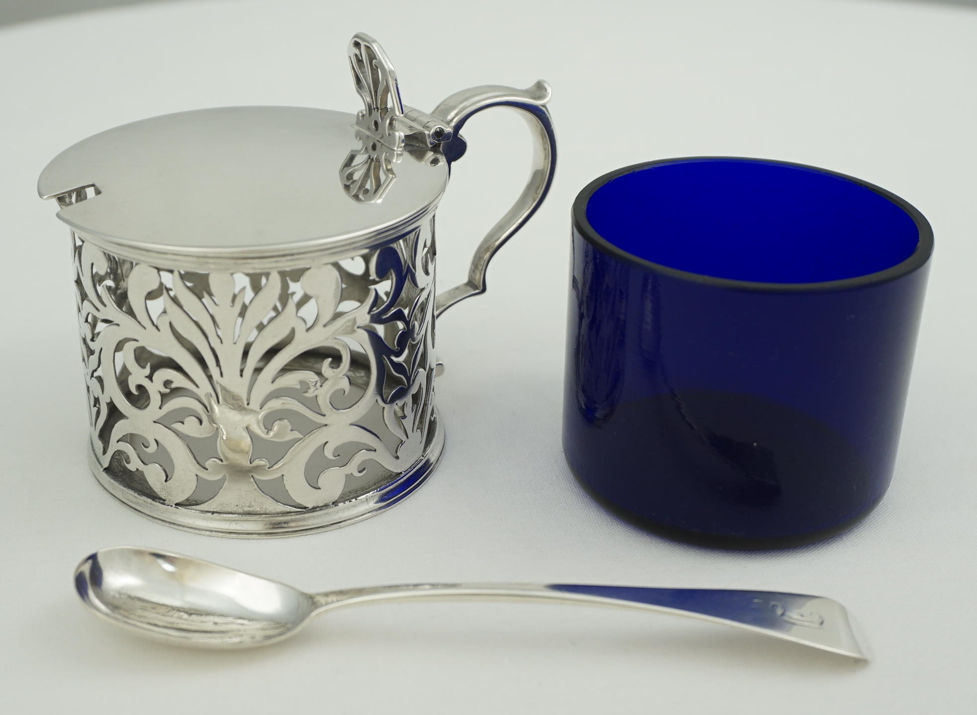 DESCRIPTION | Very good antique English early Victorian solid sterling silver mustard pot with pierced decoration. The ladle is associated, details below, but is a good fit and delivers a satisfying dollop. |