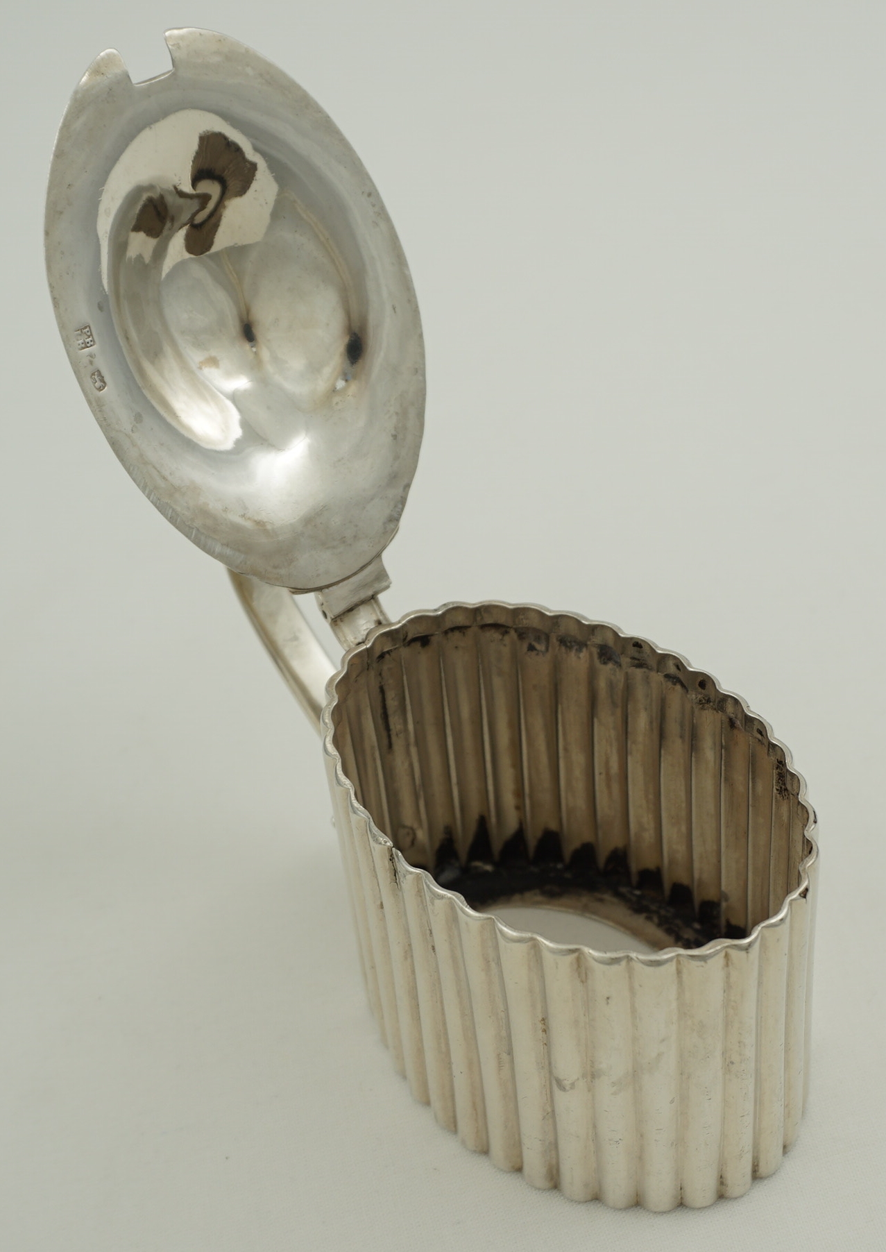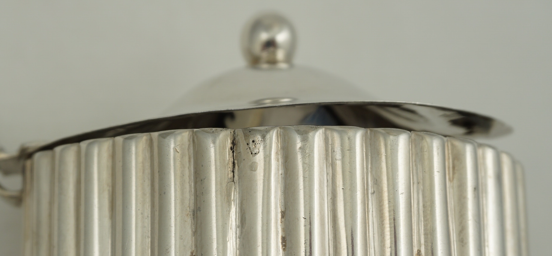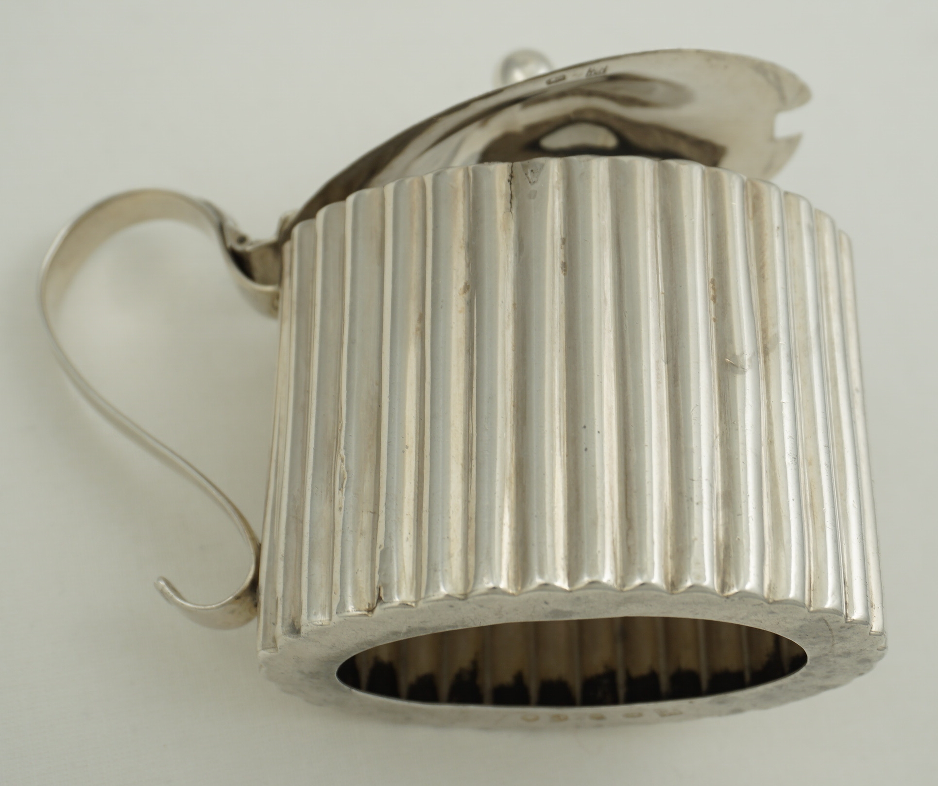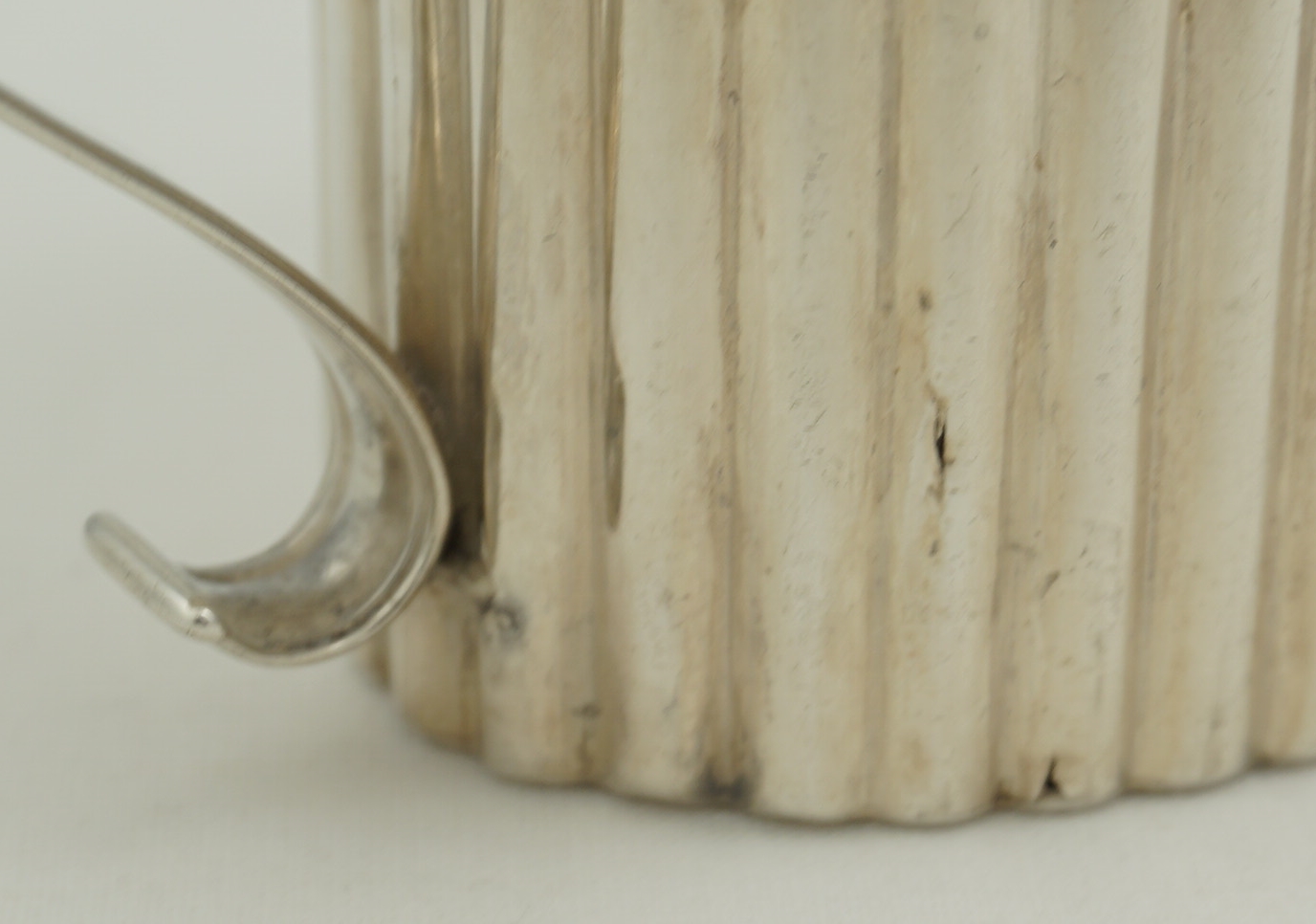 CONDITION | with some condition issues; hinge pin worn so lid action floppy, small impression of shell decoration of lid to corresponding decoration of handle, handle has been re-attached and bottom solder work a bit sloppy, pinhole just below top rim near handle and another two to top of top rim of side, small old solder repair to a couple of flute tops with small fracture between, odd little split/hole to one lower side, two little holes to base of fluting. |