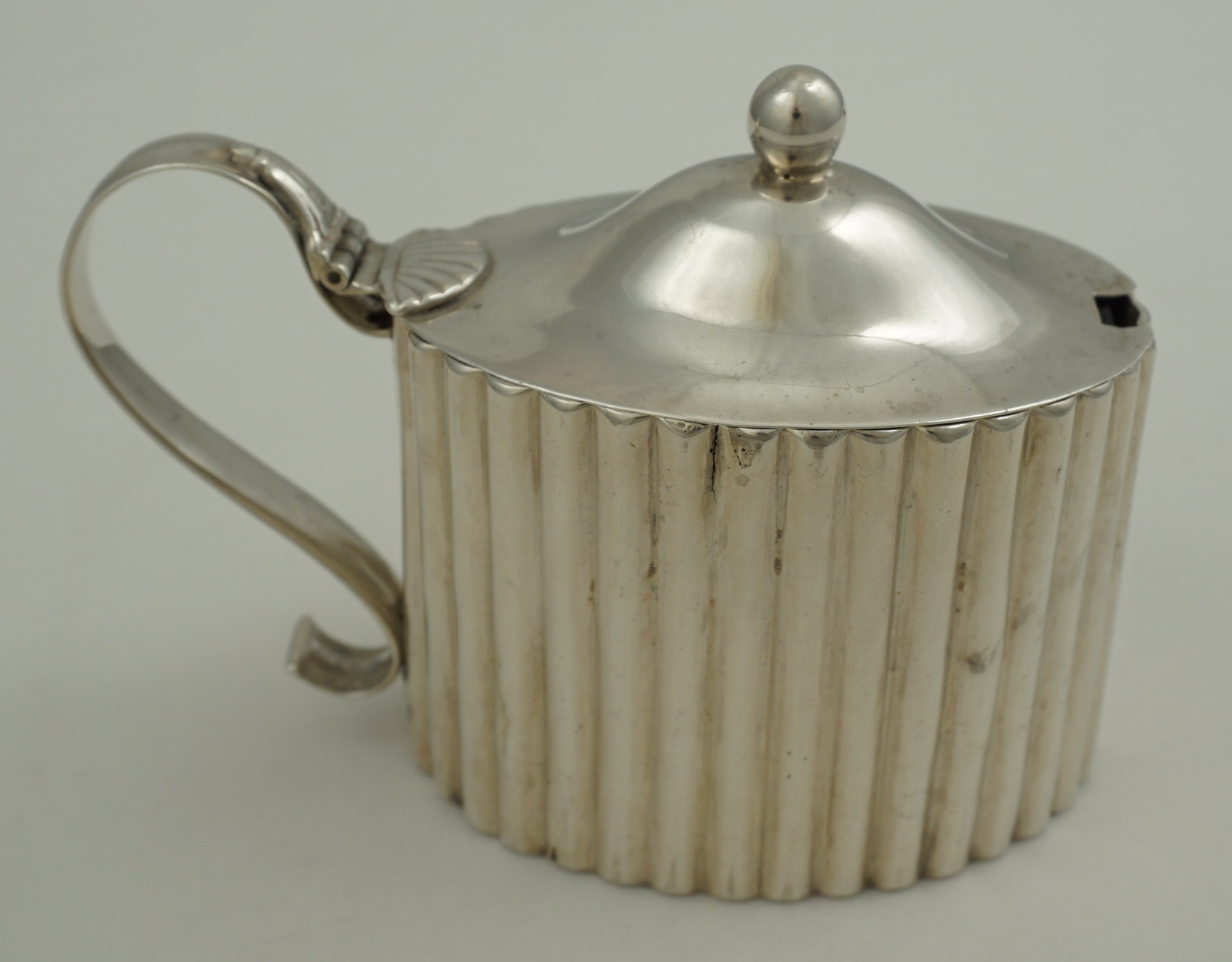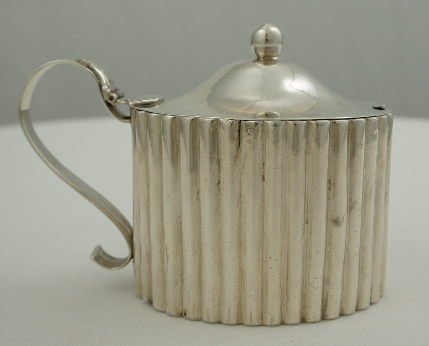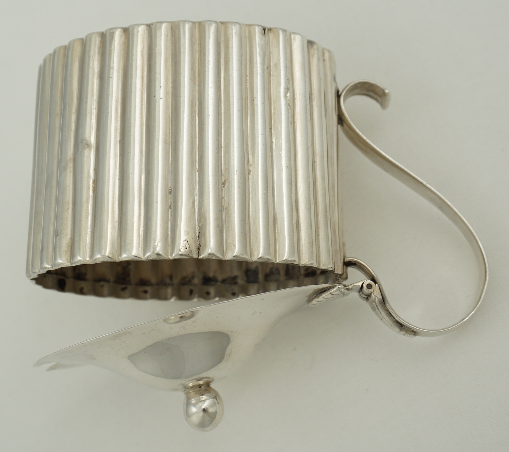 CONDITION | with some condition issues; hinge pin worn so lid action floppy, small impression of shell decoration of lid to corresponding decoration of handle, handle has been re-attached and bottom solder work a bit sloppy, pinhole just below top rim near handle and another two to top of top rim of side, small old solder repair to a couple of flute tops with small fracture between, odd little split/hole to one lower side, two little holes to base of fluting. |