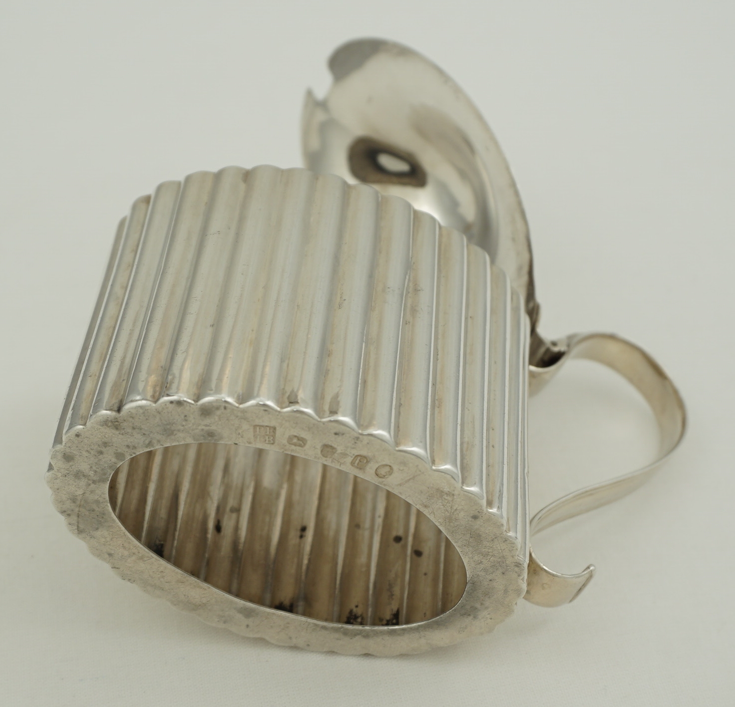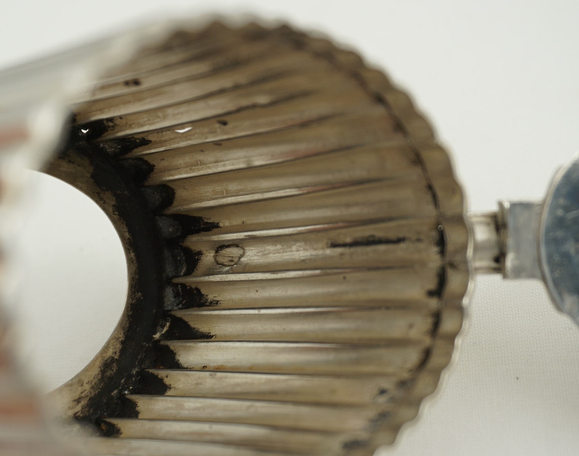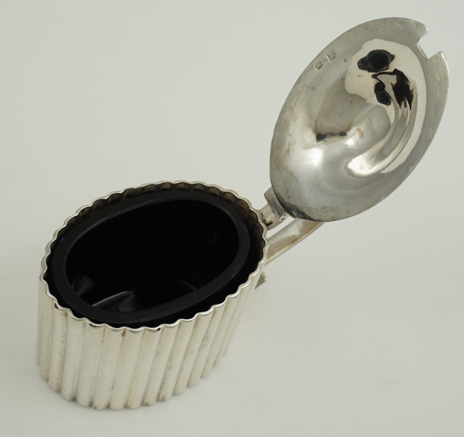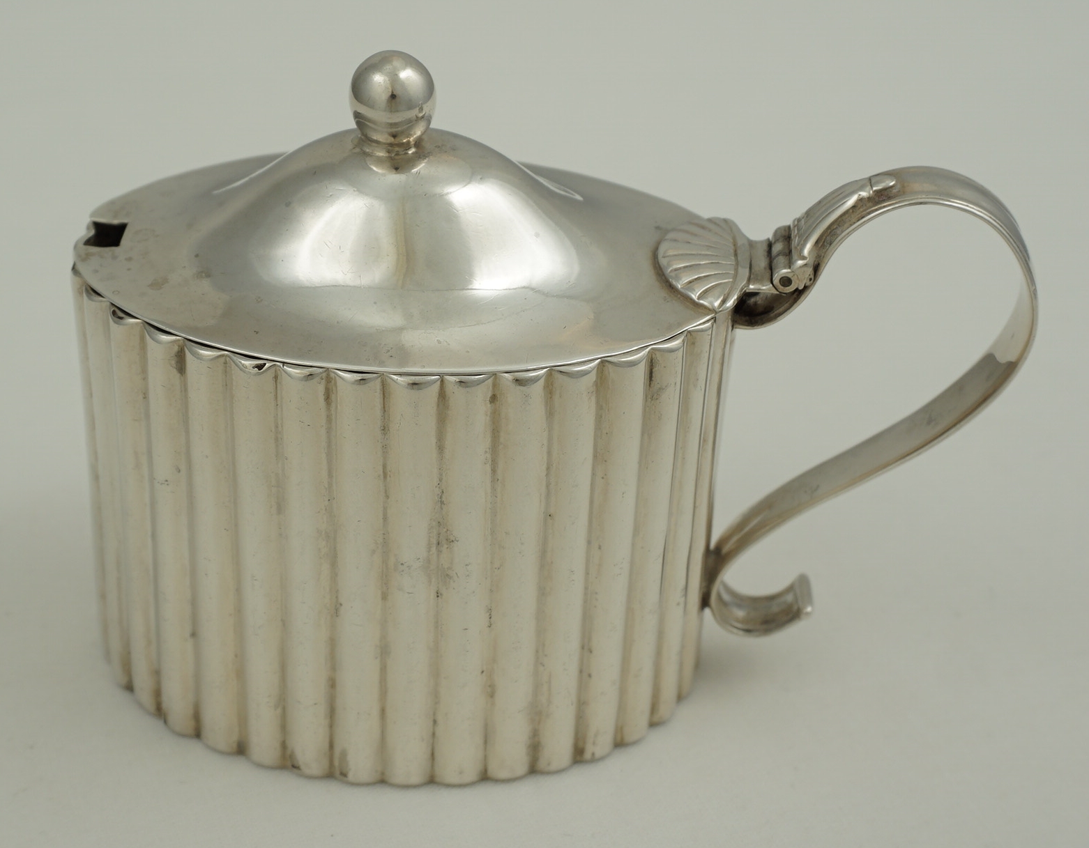 CONDITION | with some condition issues; hinge pin worn so lid action floppy, small impression of shell decoration of lid to corresponding decoration of handle, handle has been re-attached and bottom solder work a bit sloppy, pinhole just below top rim near handle and another two to top of top rim of side, small old solder repair to a couple of flute tops with small fracture between, odd little split/hole to one lower side, two little holes to base of fluting. |