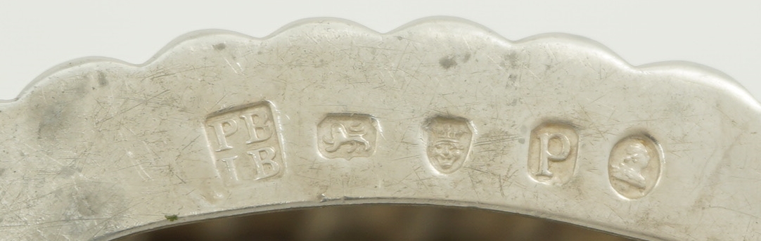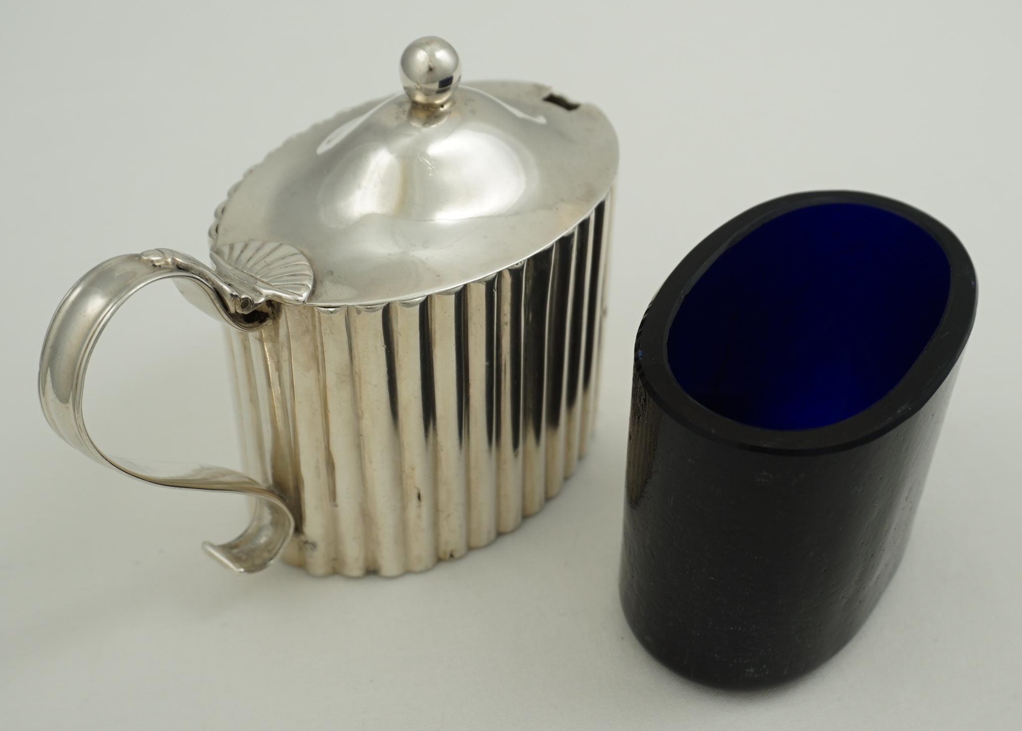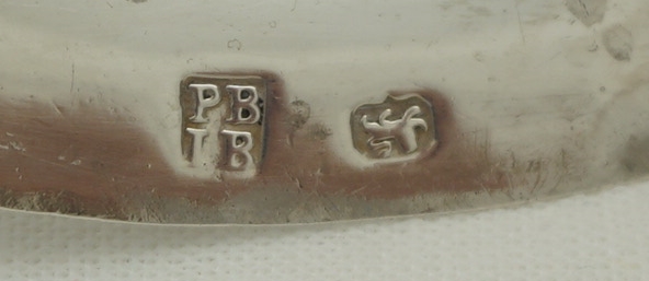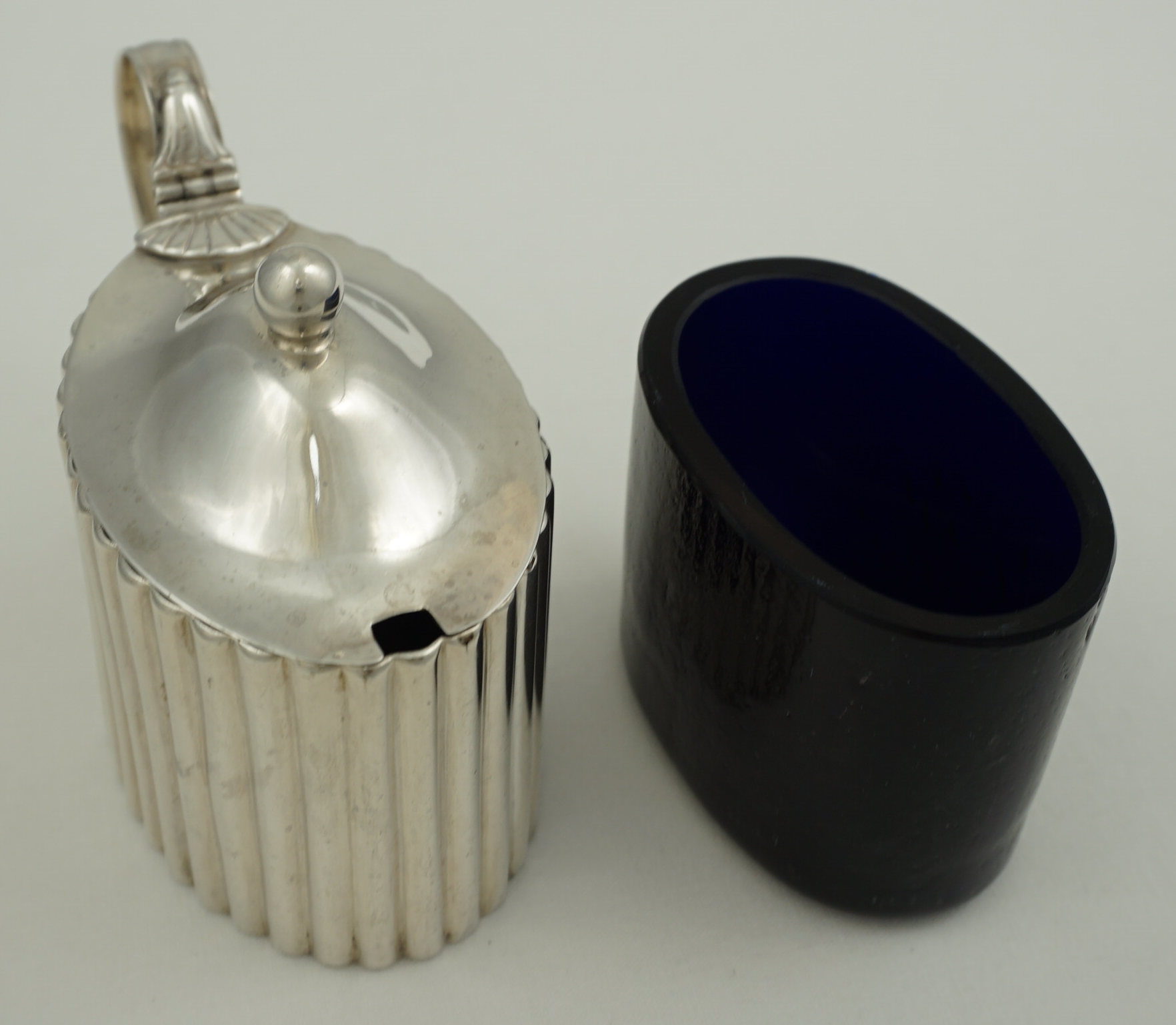 DESCRIPTION | Important antique English Georgian solid sterling silver mustard pot with a heavy blue glass liner (old but may not be the original) and correctly hallmarked to lid and base. Both PB.IB marks are well struck and very well preserved. I have cleaned the piece just enough for a thorough inspection but have not polished and traces of old mustard remain to the inside. Although still perfectly functional as a mustard pot I think that, considering the rarity and importance of this piece, some professional conservation repairs should be undertaken. |