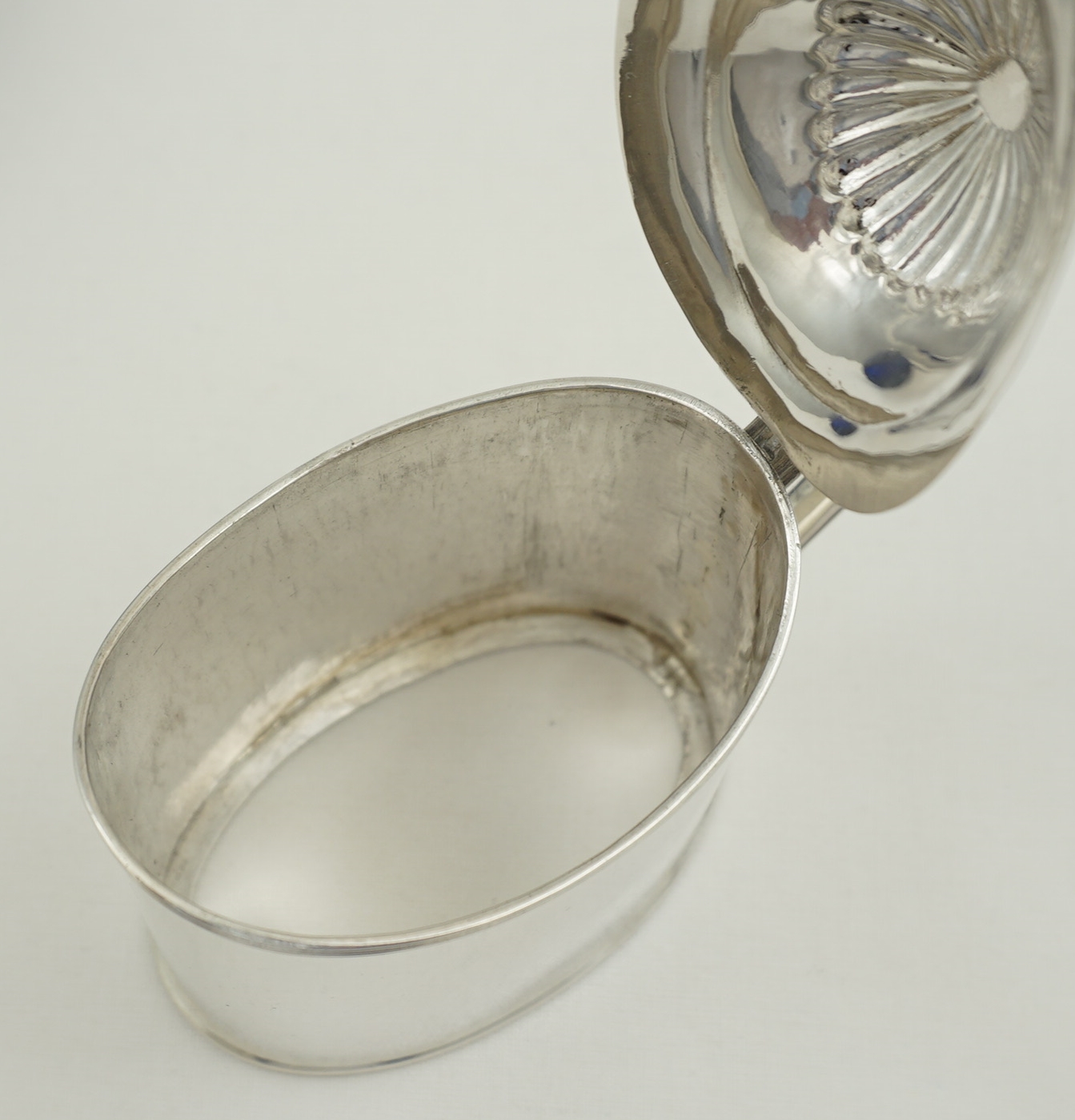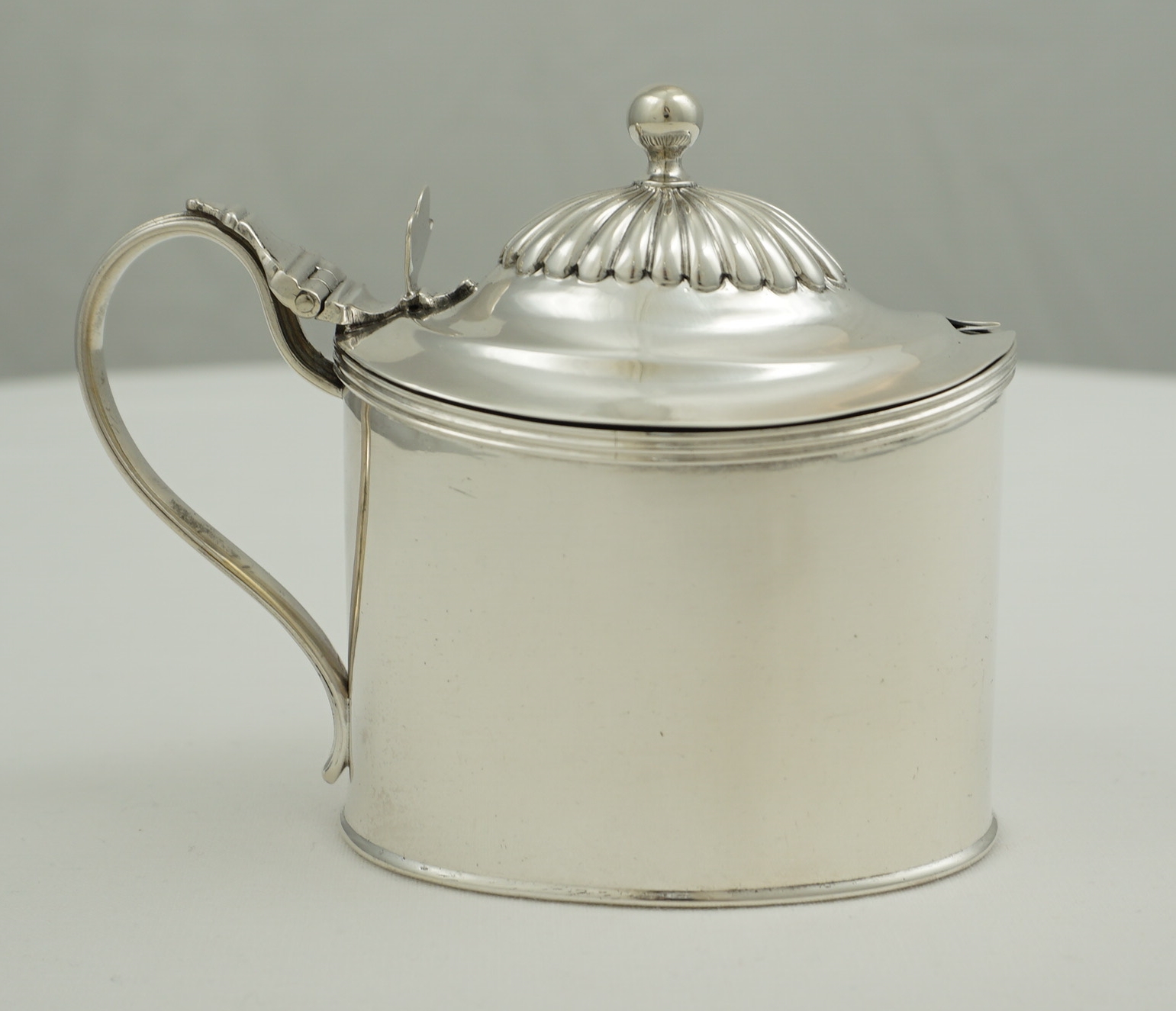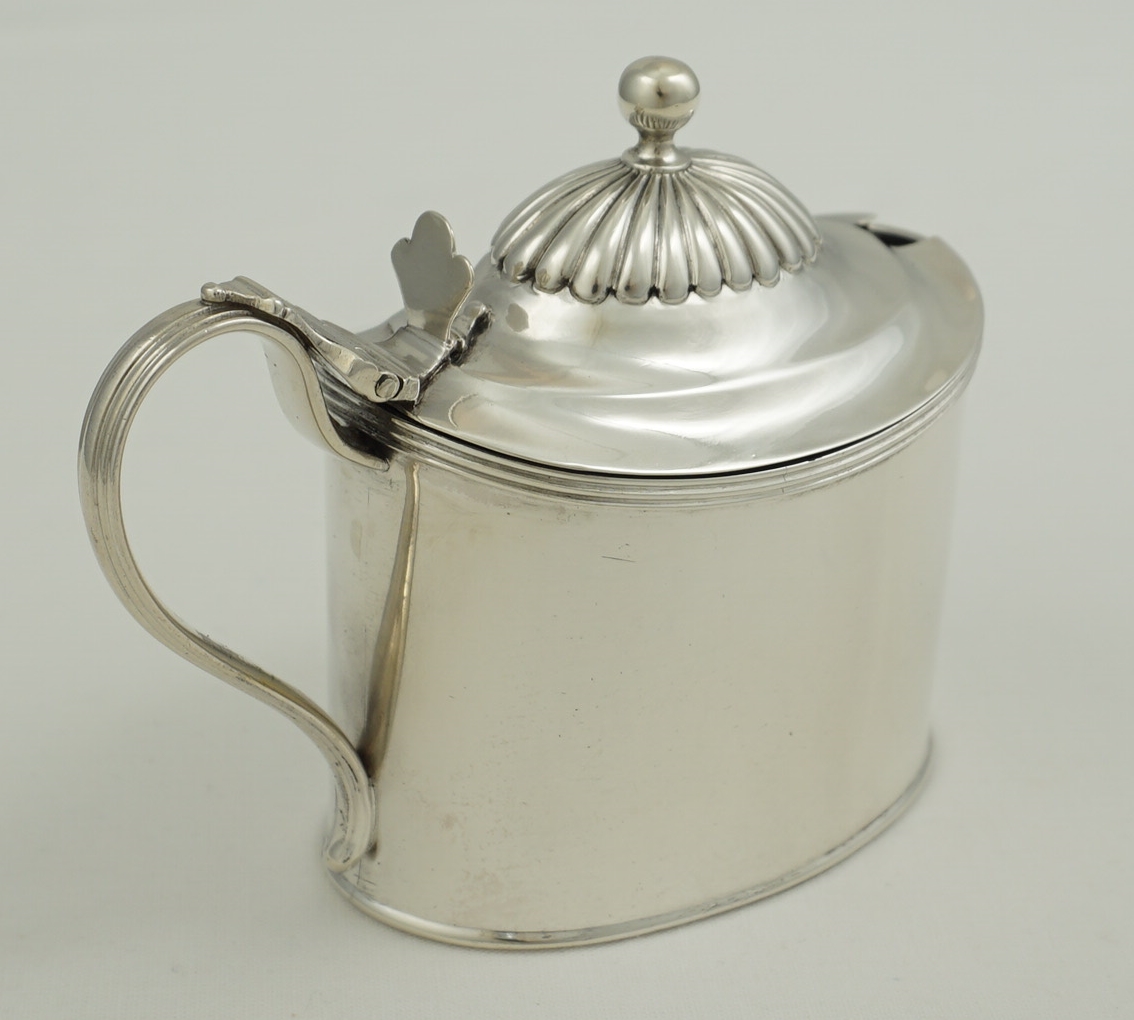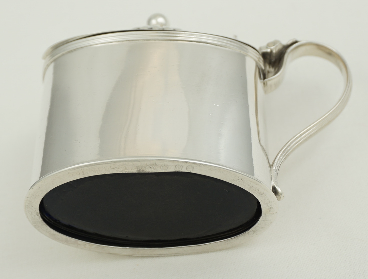 DESCRIPTION | Useful antique English Georgian solid sterling silver mustard pot with a demi-fluted and hinged lid, spherical finial, trefoil thumbpiece and thick blue glass liner. |