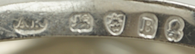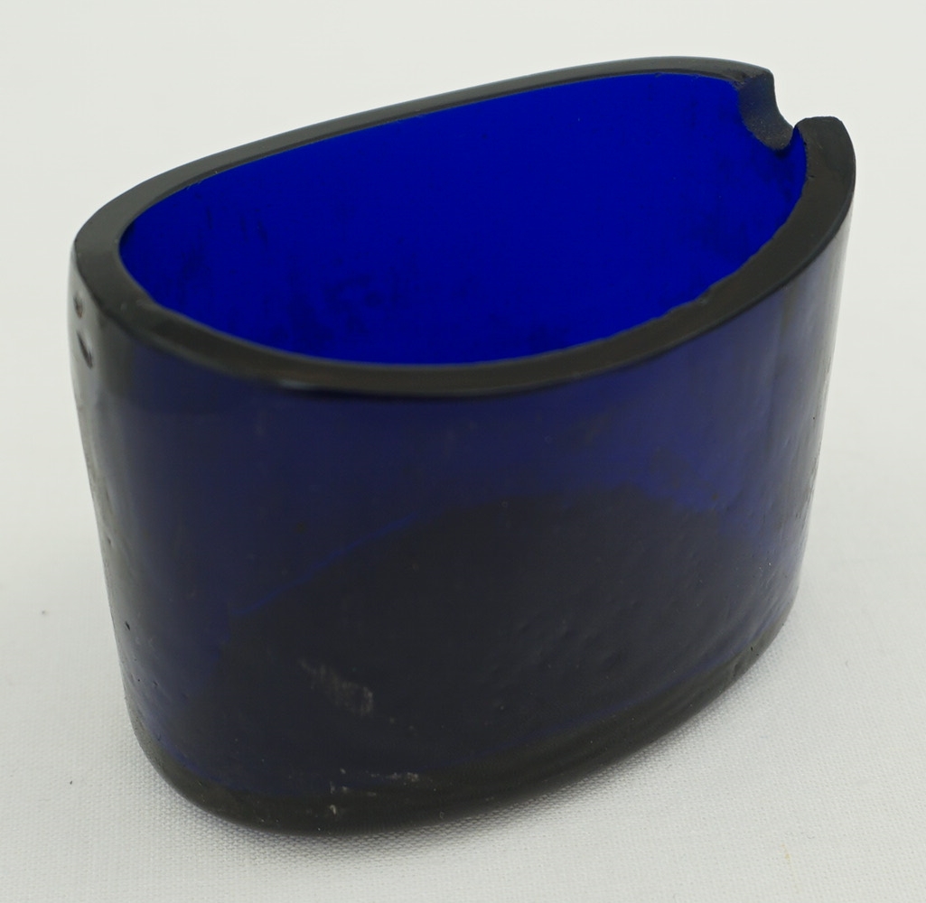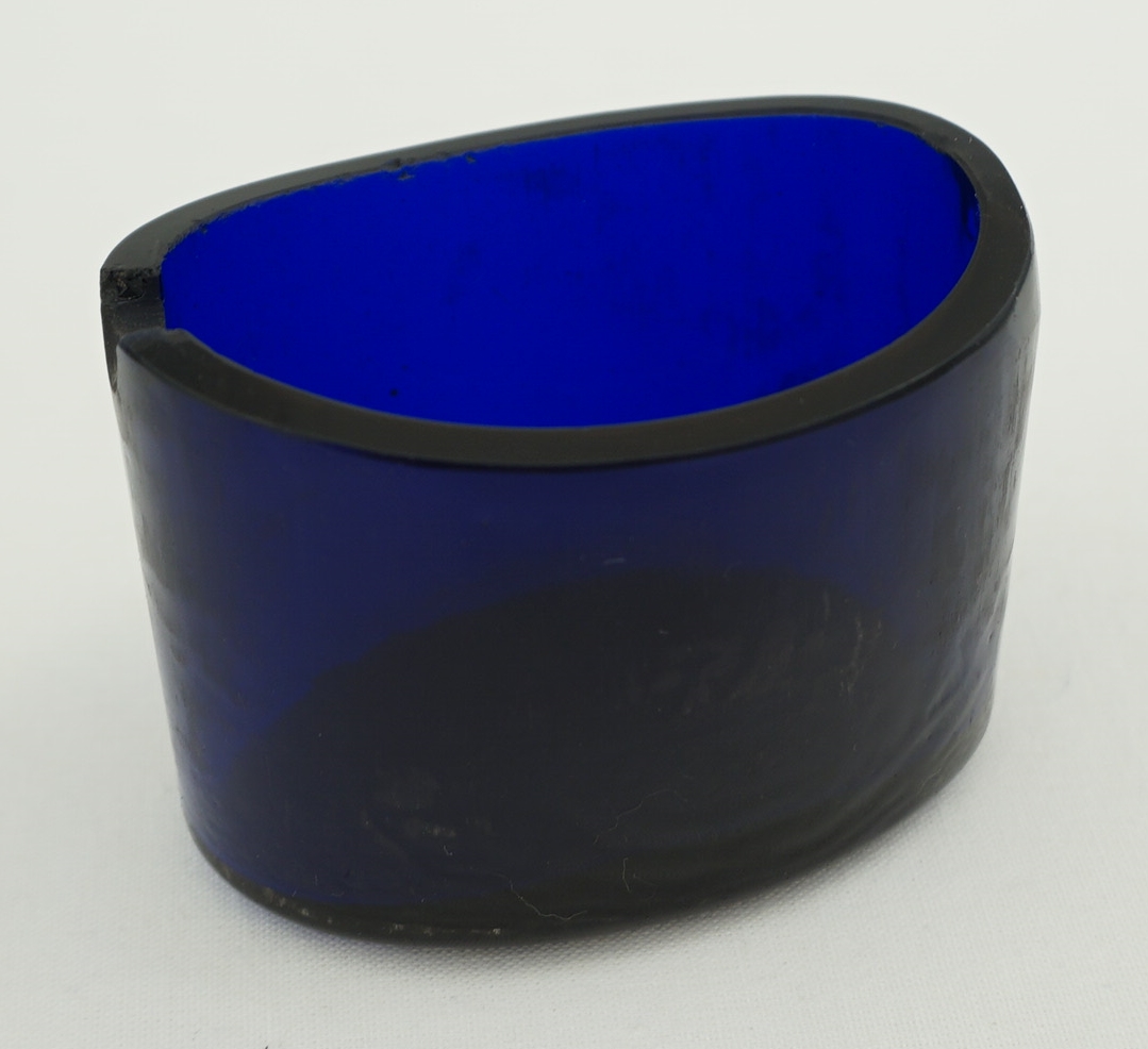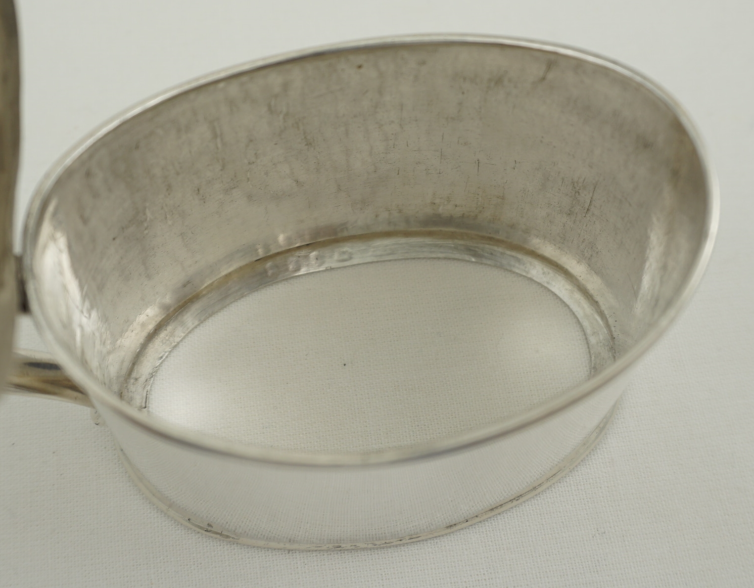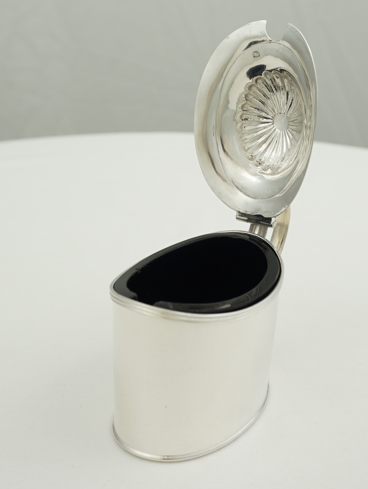 DESCRIPTION | Useful antique English Georgian solid sterling silver mustard pot with a demi-fluted and hinged lid, spherical finial, trefoil thumbpiece and thick blue glass liner. |