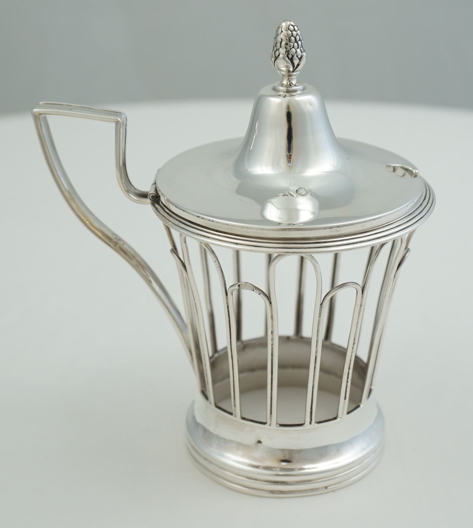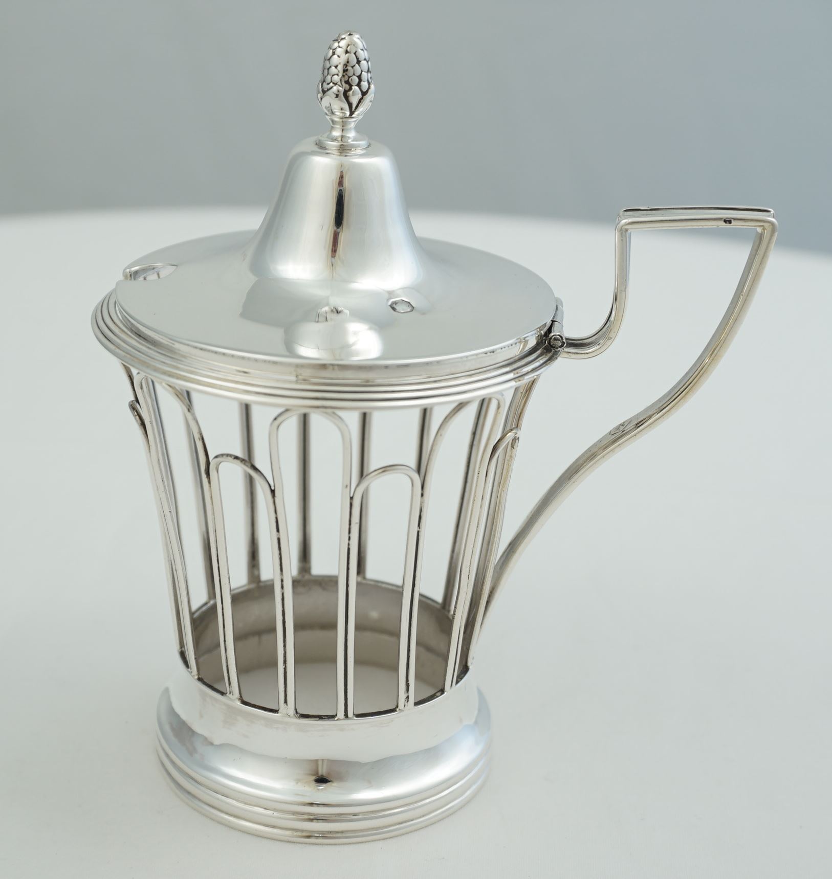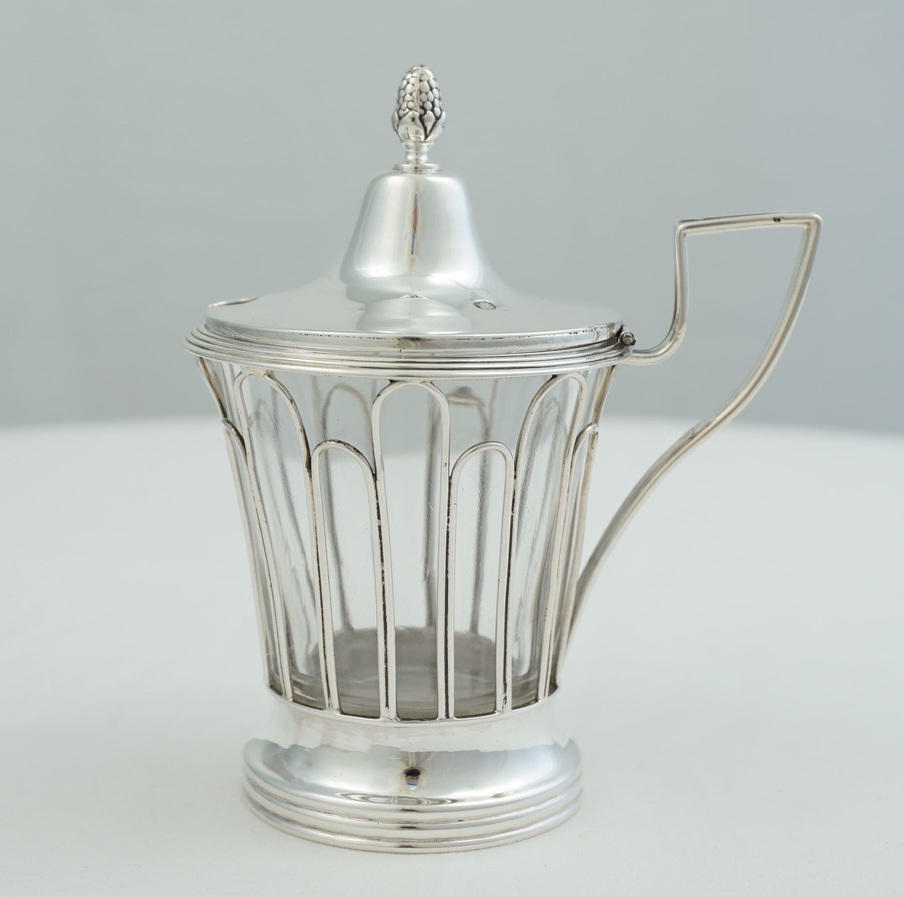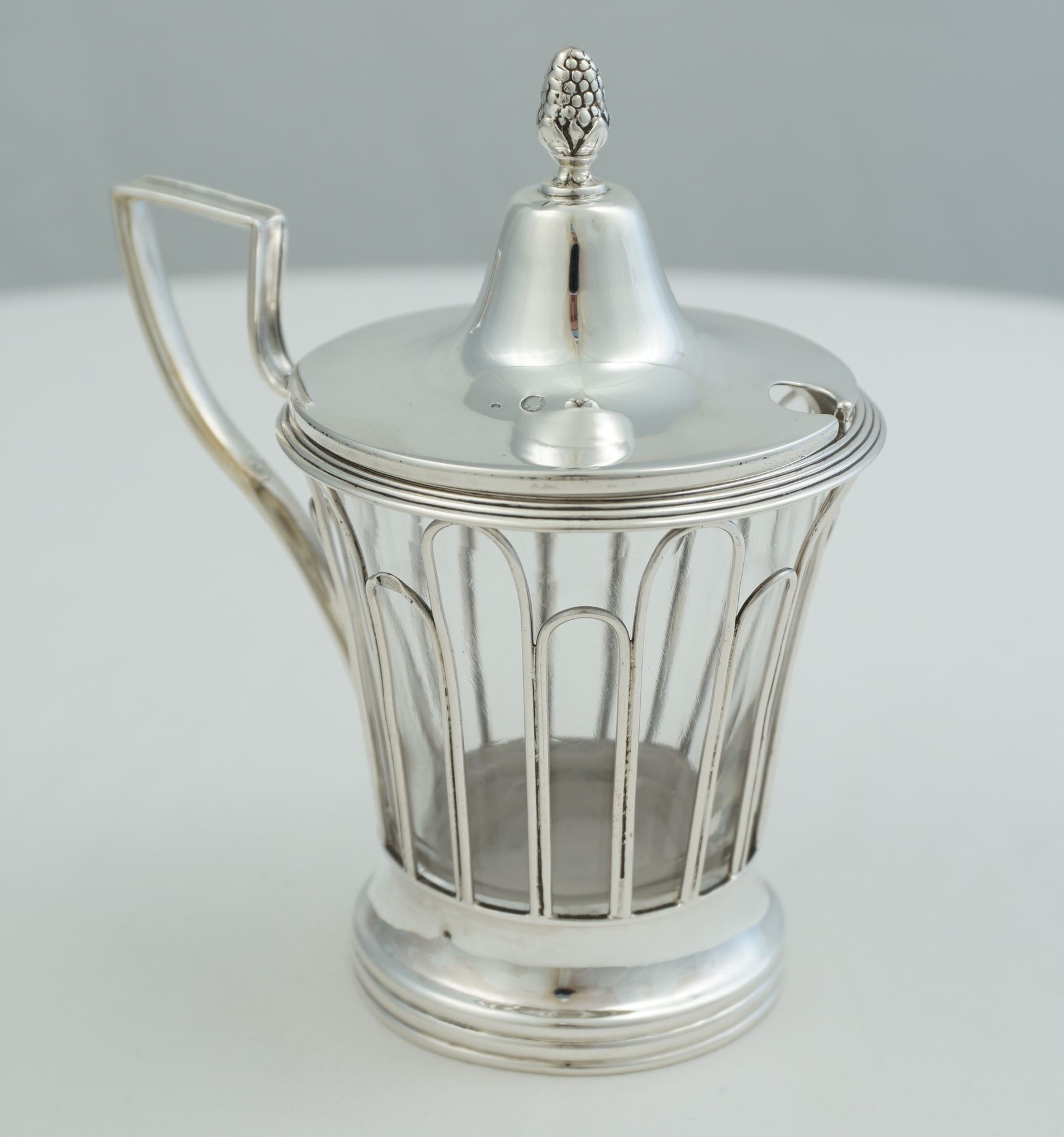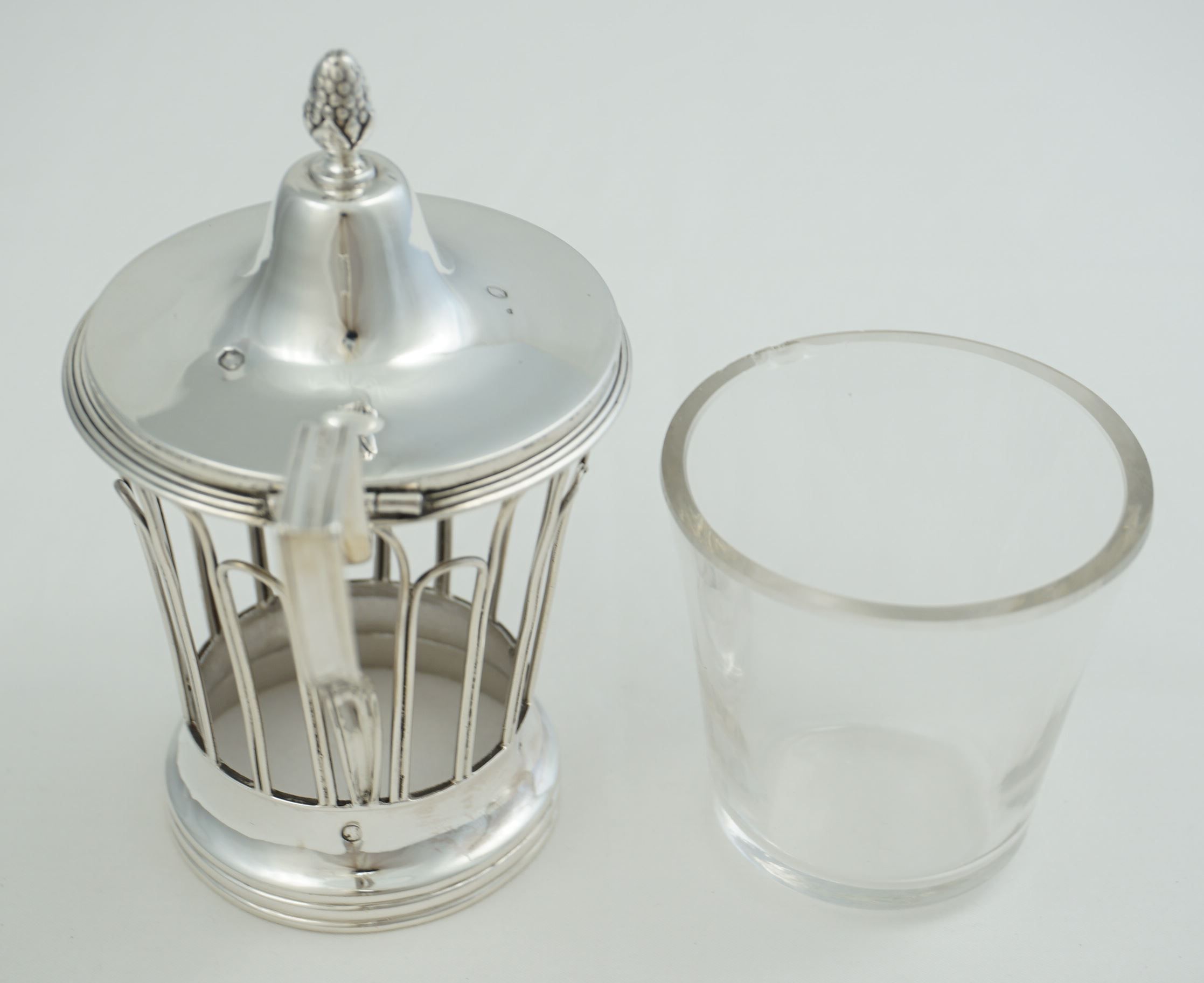 DESCRIPTION | Interesting antique French silver mustard pot with pineapple finial and clear glass liner. |