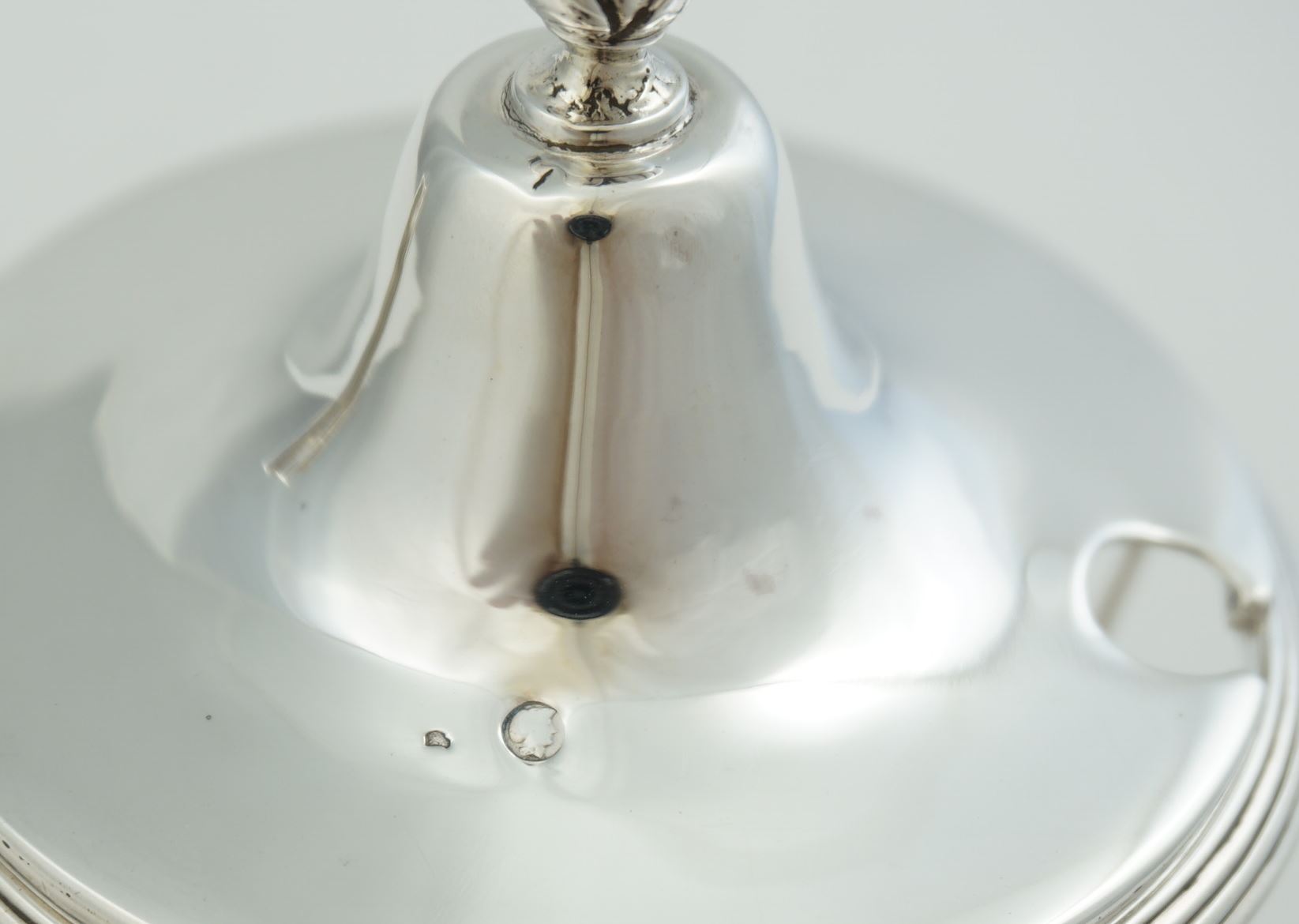 CONDITION | generally very good, minor hinge play, little dig to lid near finial, chip to liner at spoon hole that was probably a crude way to allow for a thicker spoon |