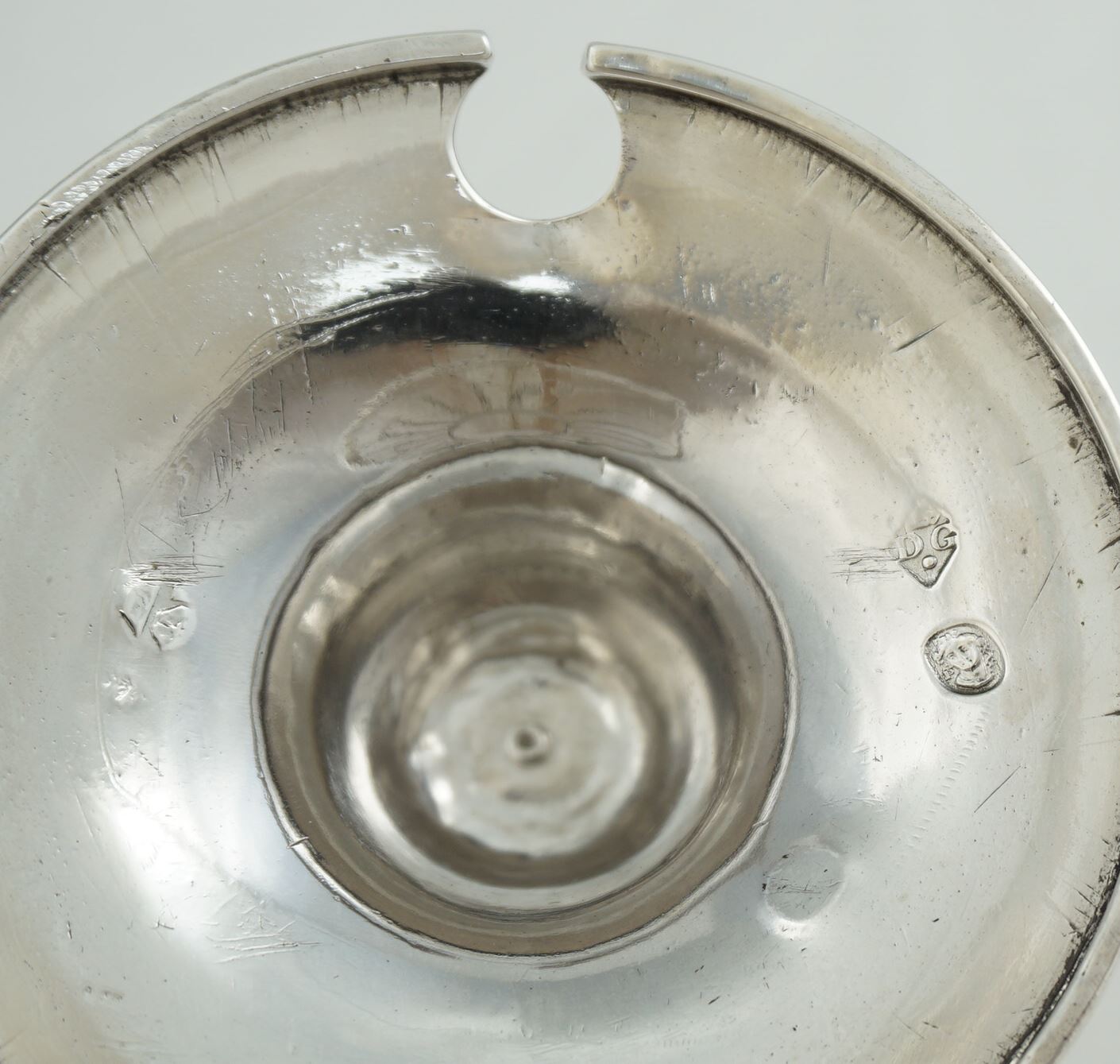 DATE or HALLMARK | Every part is hallmarked with, to me, almost unfathomable French early 19th century marks. There is also the Association of Gold and Silversmiths mark for Paris 1793 but this mark was possibly also used again a bit later. My best guess is 1809-19, probably October 1819. After taking the images I have found more hallmarks including the maker's D.G struck again this time to the the handle and the 57 below the greyhound's? head mark used 16th August 1819 to 16th November 1819. |