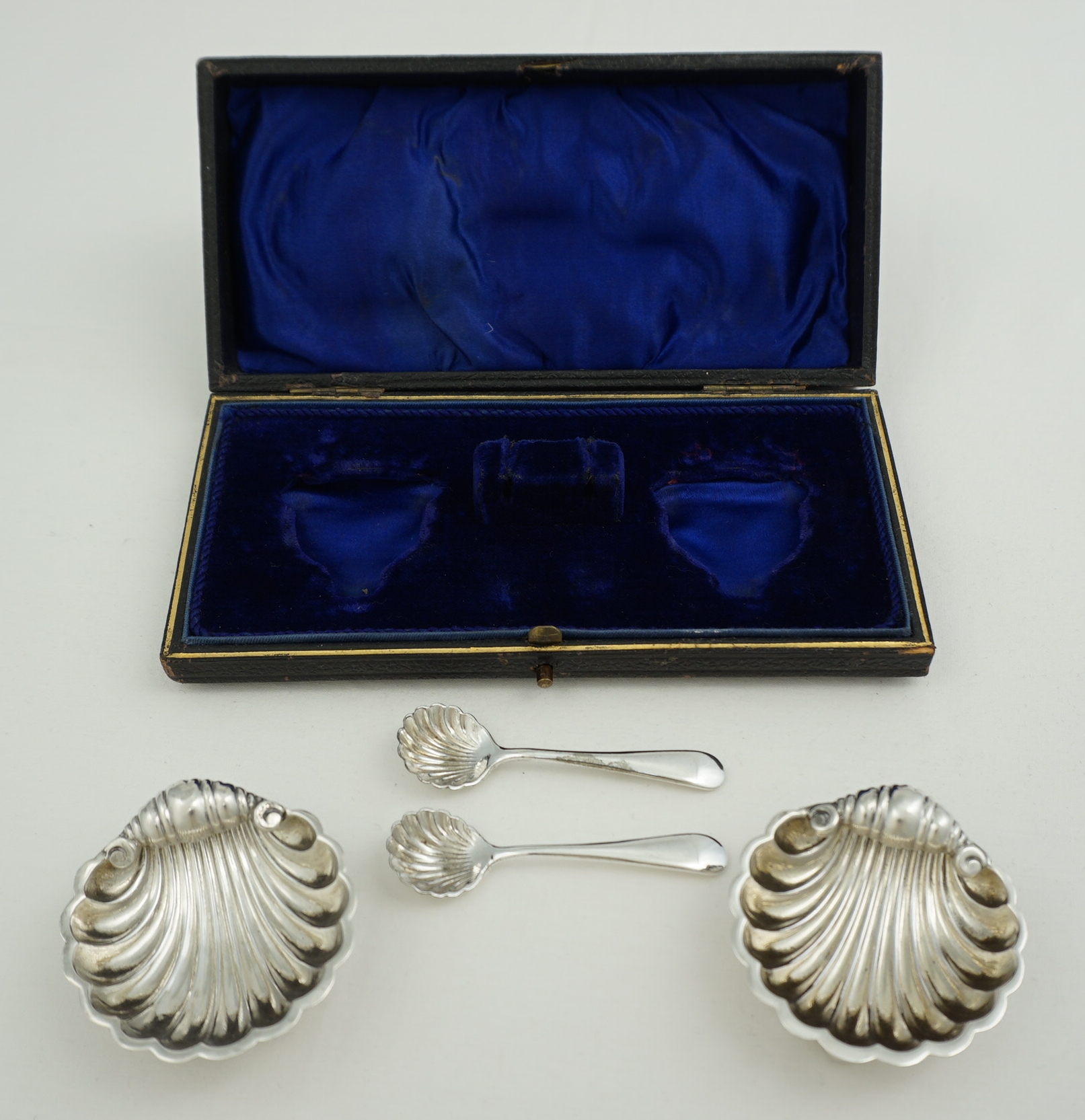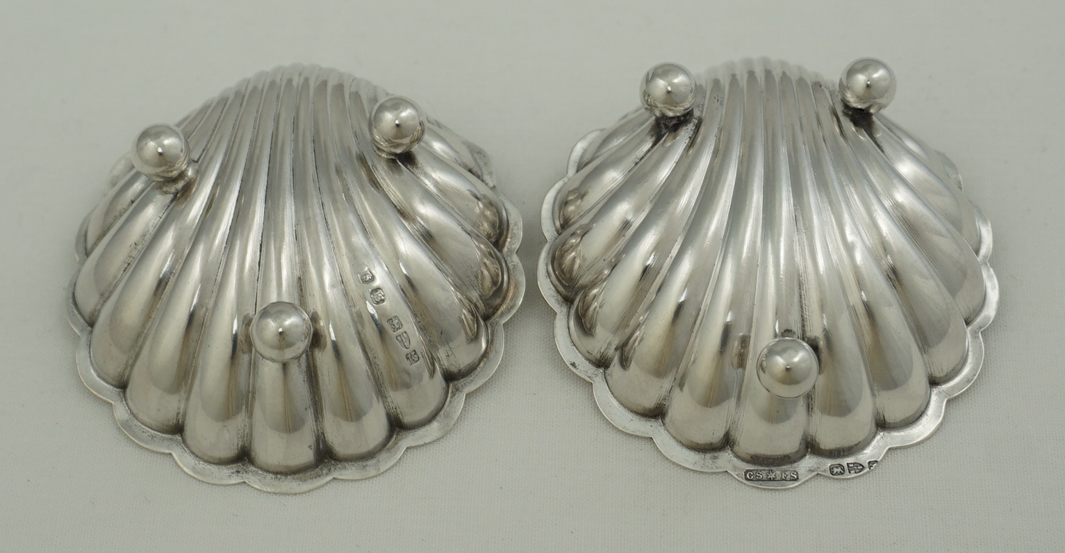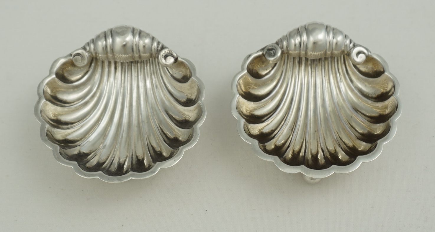 DESCRIPTION | Pretty and cased near pair (two) Victorian English solid sterling silver shell salts. The spoons are plated and included free of charge. |