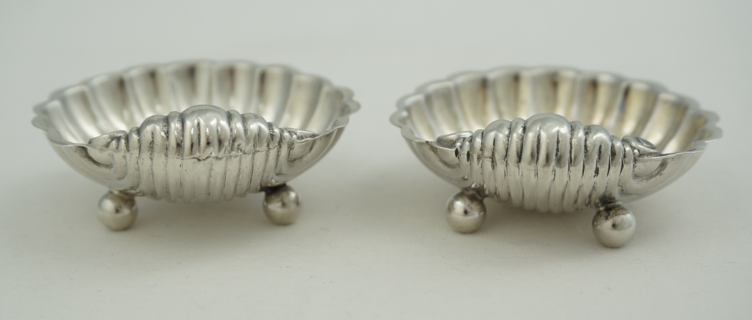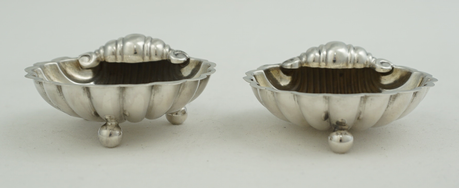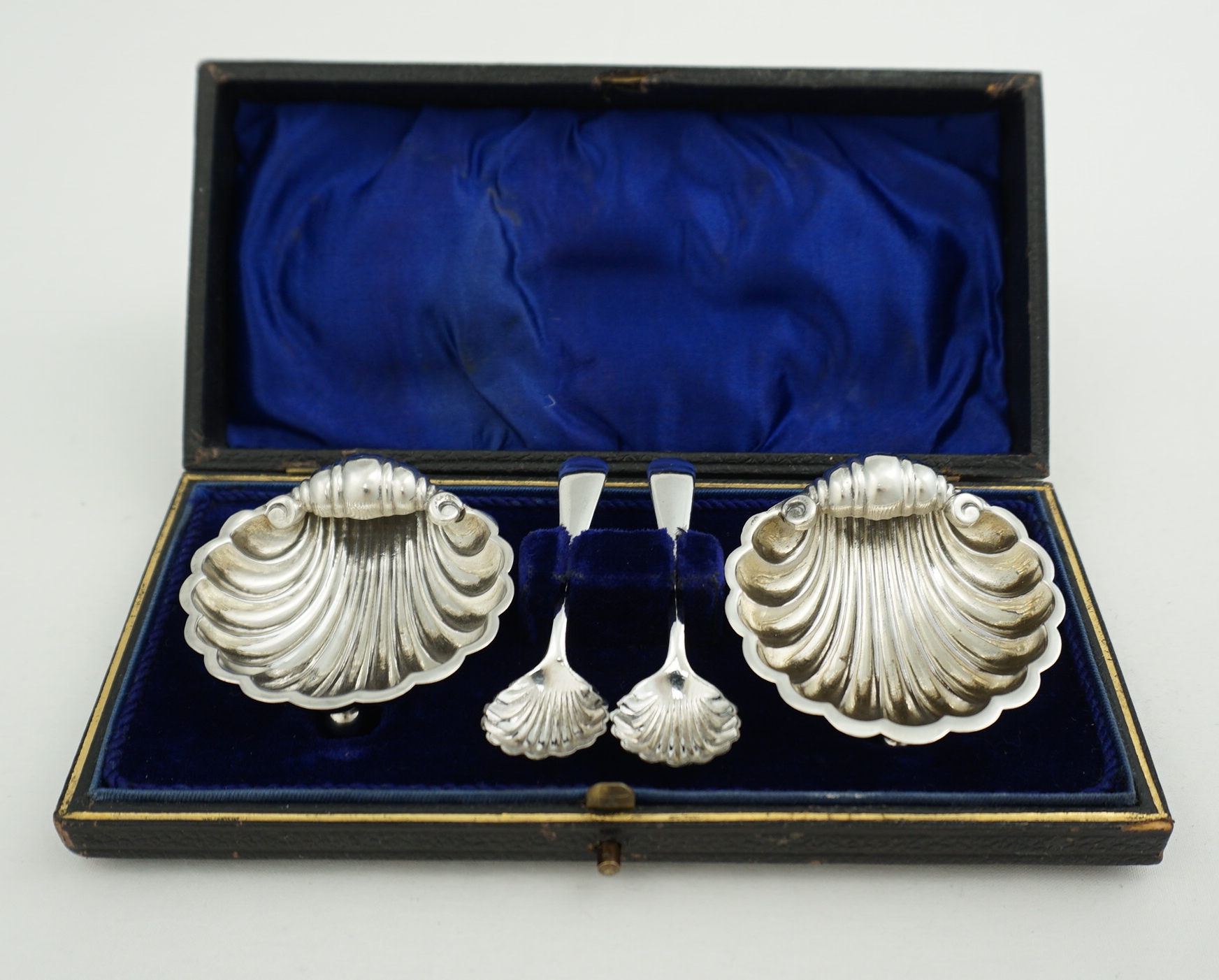 DESCRIPTION | Pretty and cased near pair (two) Victorian English solid sterling silver shell salts. The spoons are plated and included free of charge. |