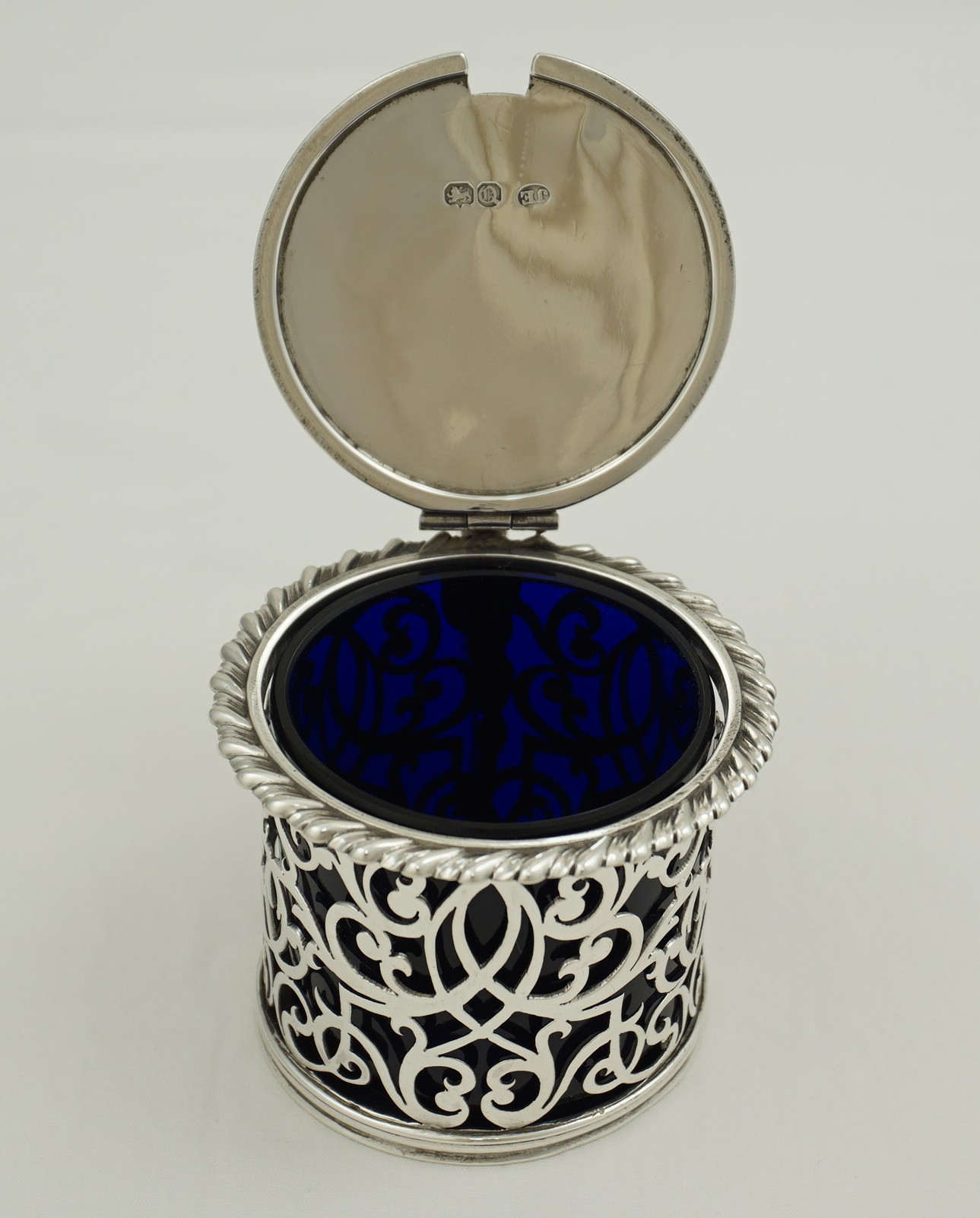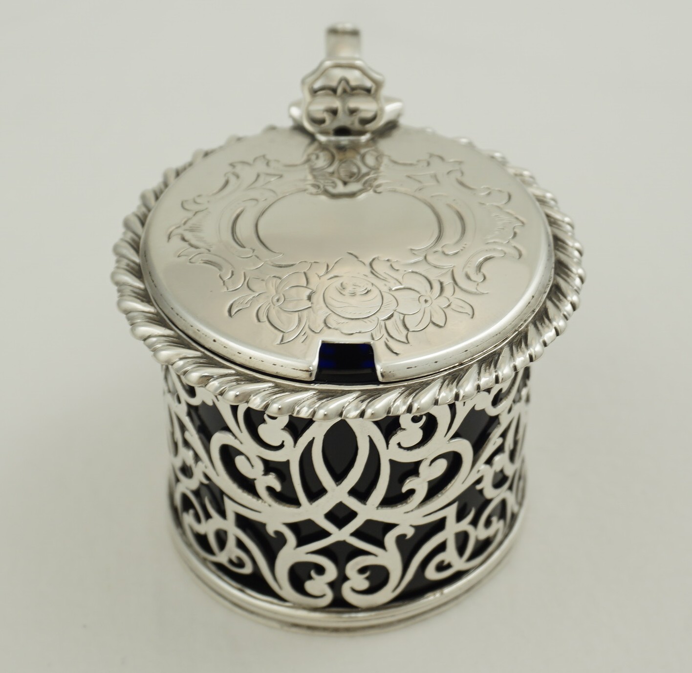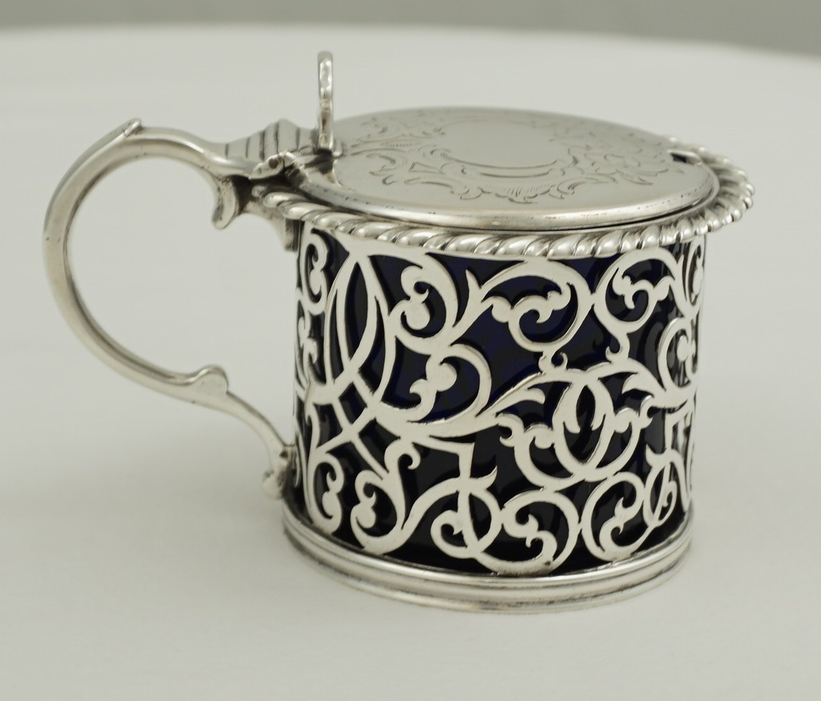 | DESCRIPTION | Attractive antique English Victorian solid sterling silver mustard pot with pierced and engraved decoration and a blue glass liner. The blank cartouche to the lid has never been engraved. |