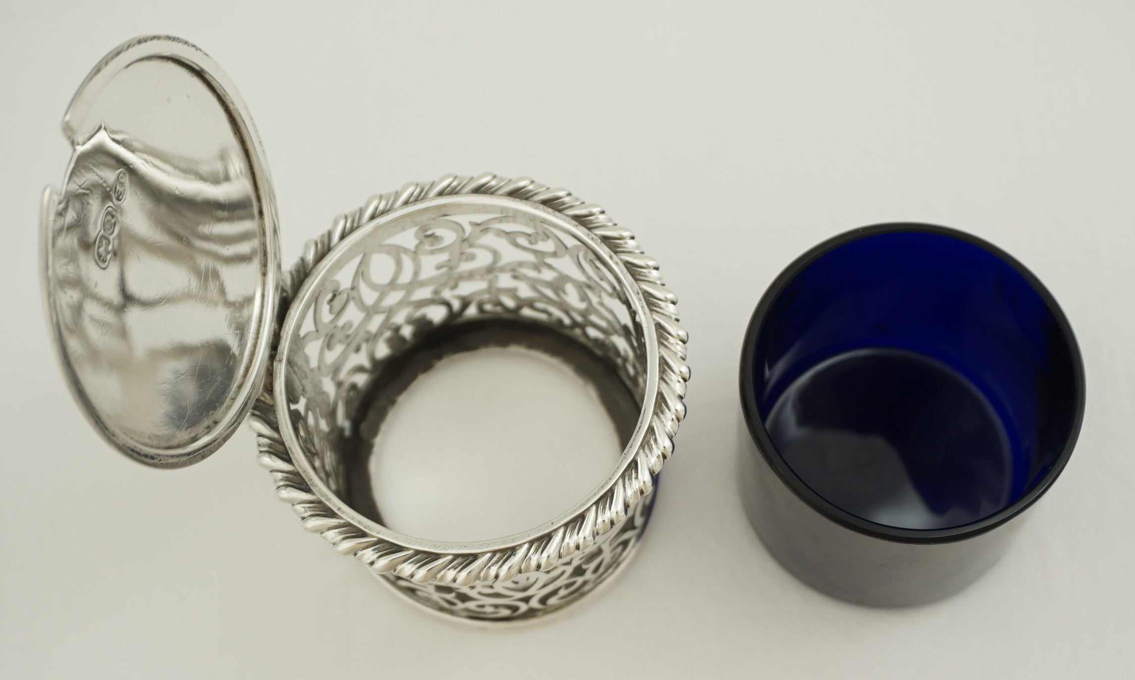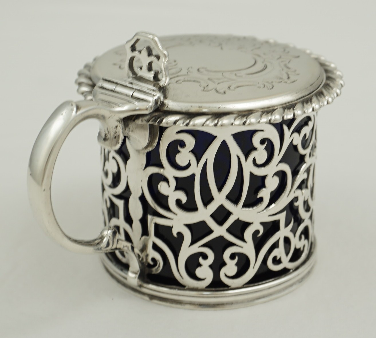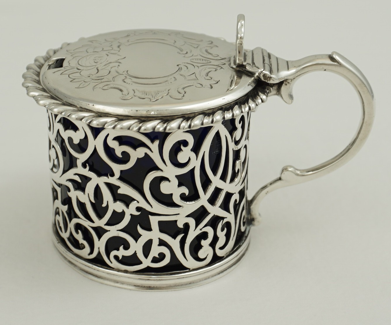 | DESCRIPTION | Attractive antique English Victorian solid sterling silver mustard pot with pierced and engraved decoration and a blue glass liner. The blank cartouche to the lid has never been engraved. |