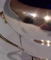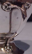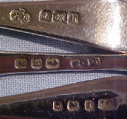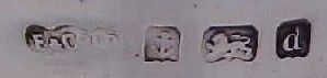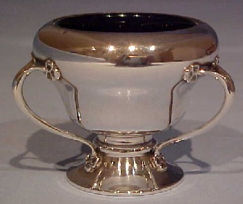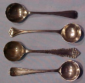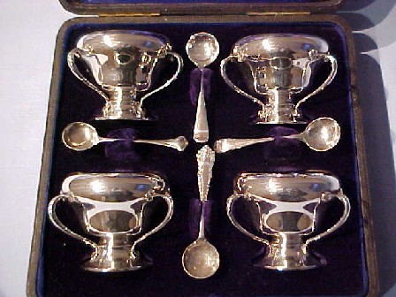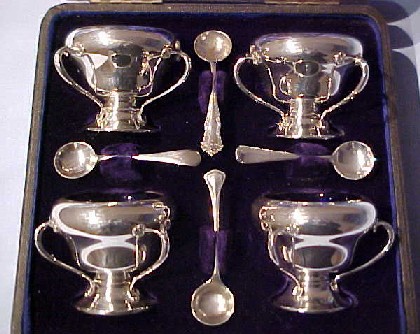Case set of four art nouveau salts with four non-matching silver spoons. | |
