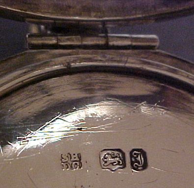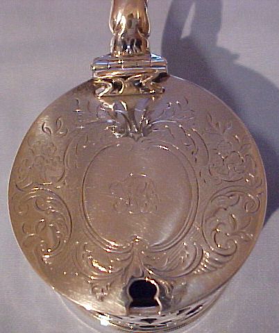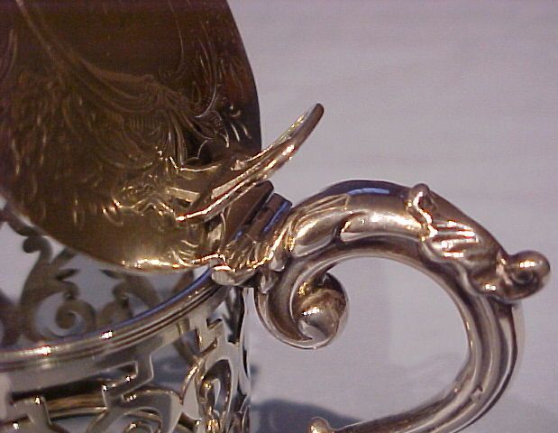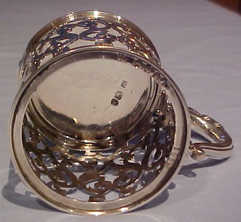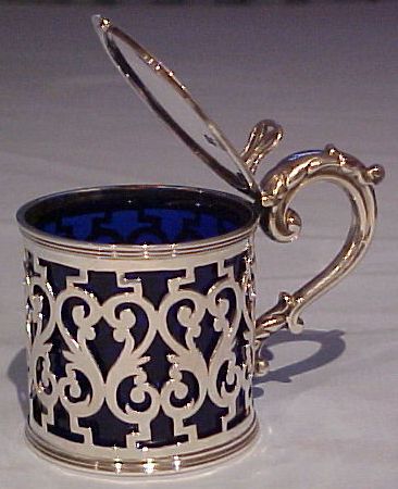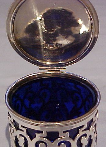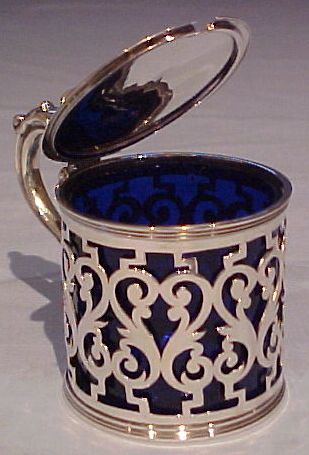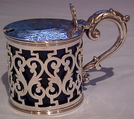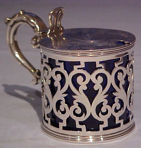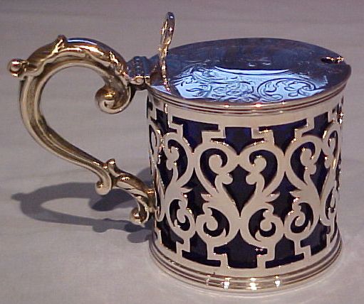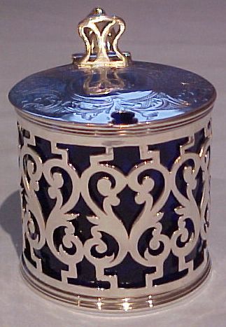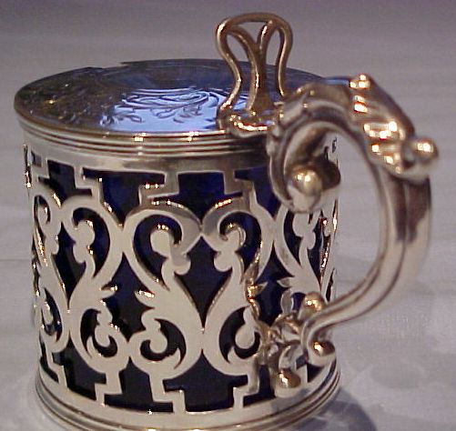 Victorian silver large mustard pot with pierced and engraved decoration and a blue glass liner. There is a light monogram engraved to the lid. | ||