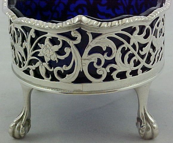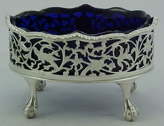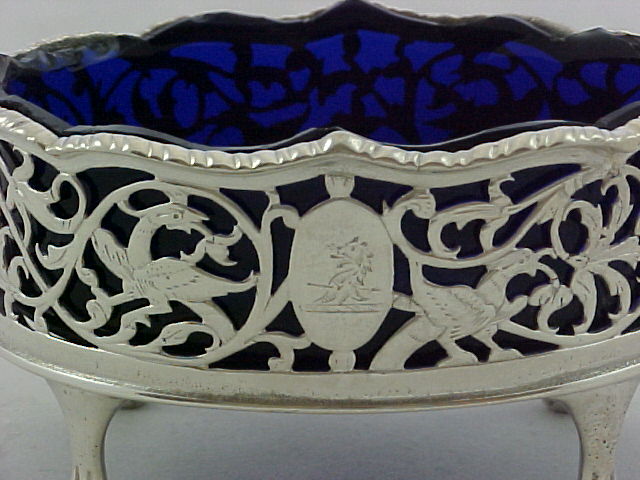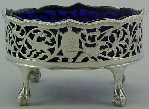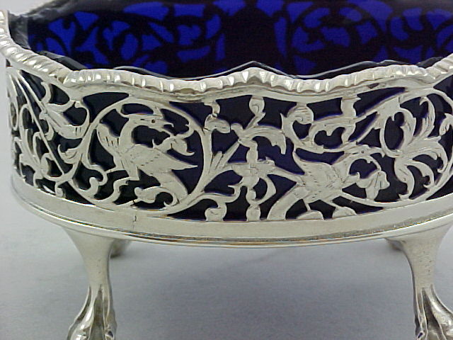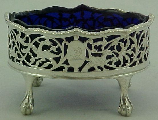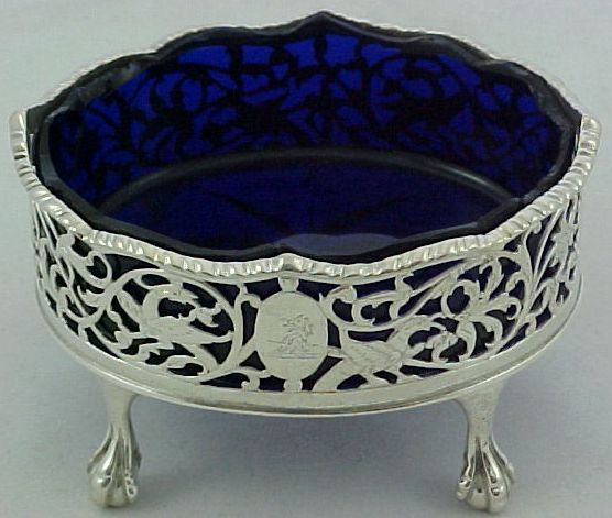 Very stylish Georgian silver salt and blue glass liner. The sides are beautifully pierced with Hoho birds amongst foliage and a crest engraved cartouche. The liner has rim shaped to match the salt and a star cut base. | ||