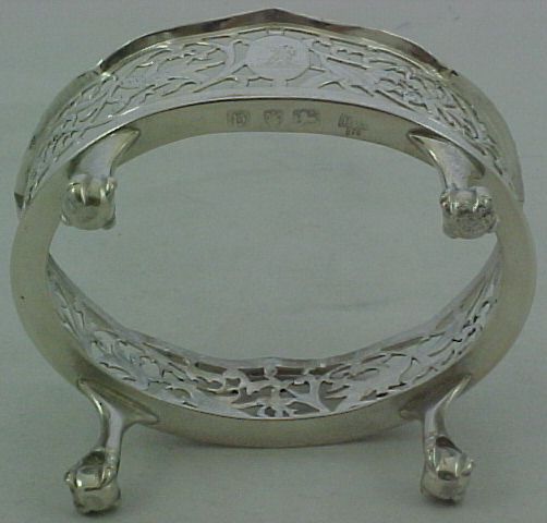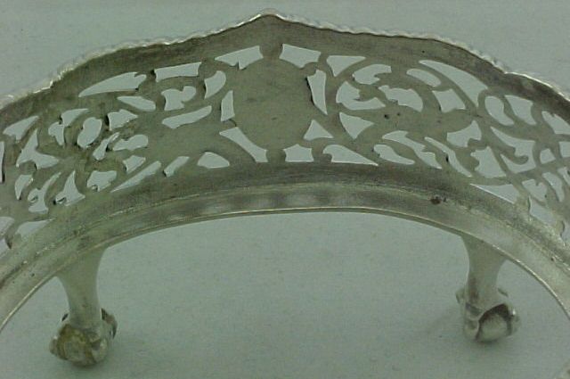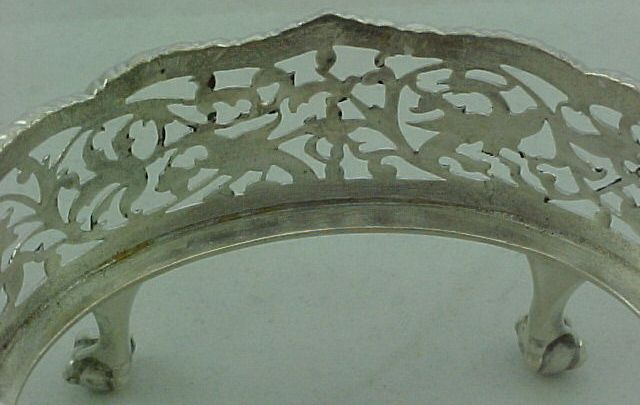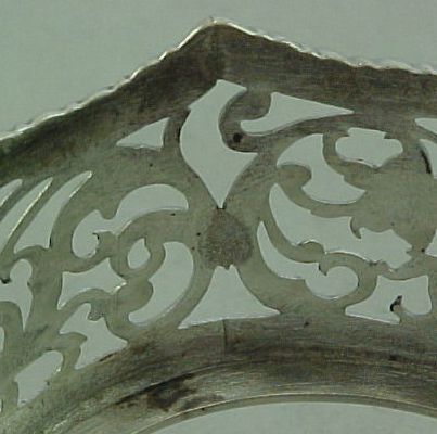 My silversmith has restored this item. The work done was to repair some small splits to the delicate piercing and the top rim. Extra silver has also been added to the inside at critical points to prevent future splits. This type of item often fails at the joint between the leg tops and the base rim. Unusually, this example was perfect in this area and no work was required. | ||