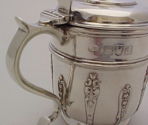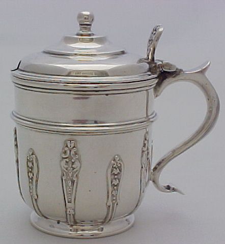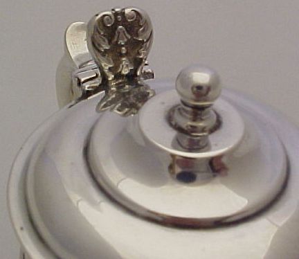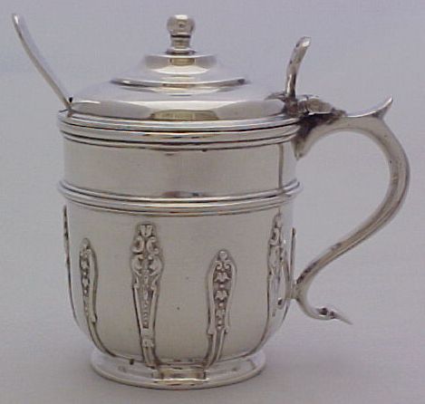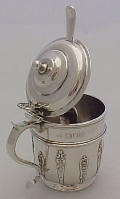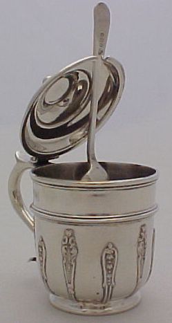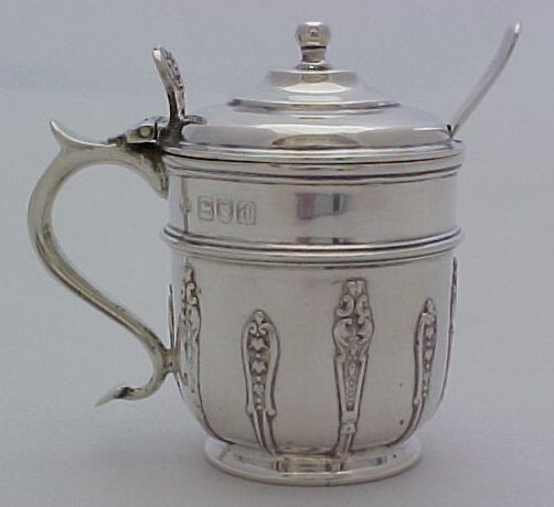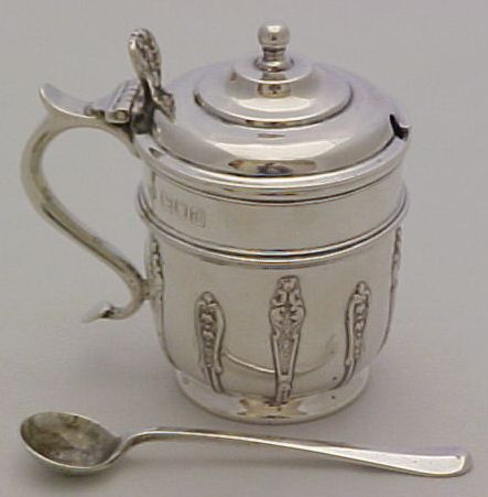 Fine Victorian silver mustard pot with strapwork decoration and a perfect hinge. The modern silver Hanoverian pattern condiment spoon is included simply because it is such a good fit and is supplied free of charge. |