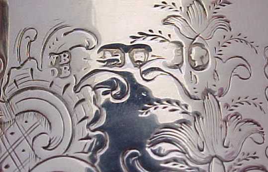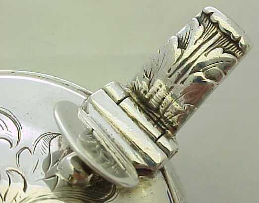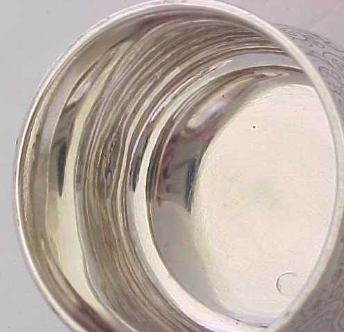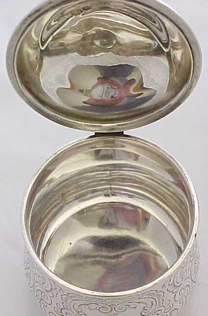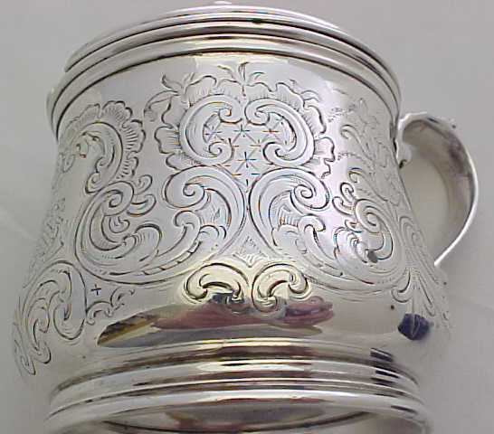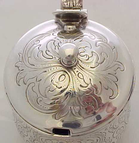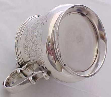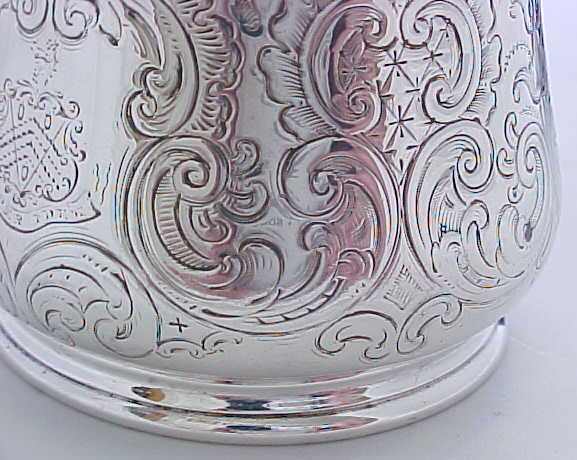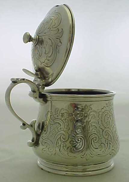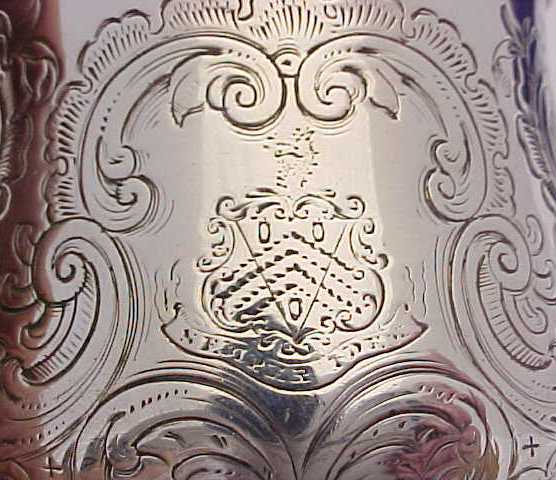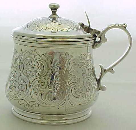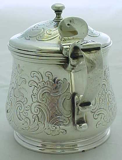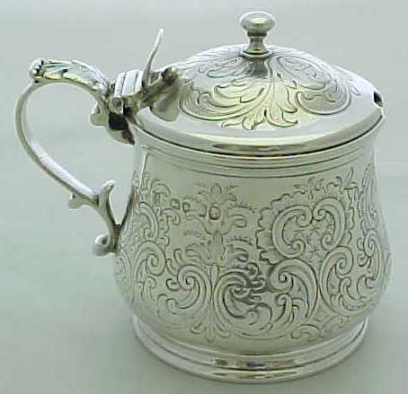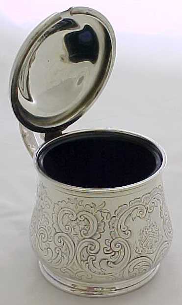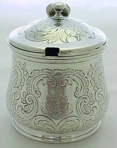 Finest Victorian silver mustard pot with a perfect and perfectly fitting blue glass liner. The bulbous body has all over chased decoration encompassing an engraved full armorial within the cartouche. The double C scroll handle is acanthus leaf capped opposite a plain bilet. |