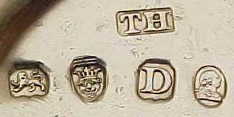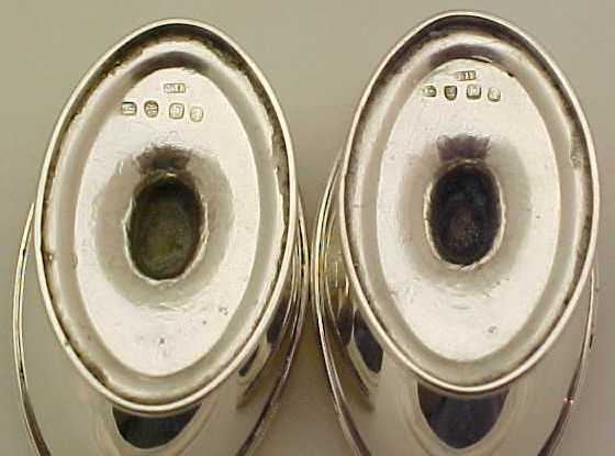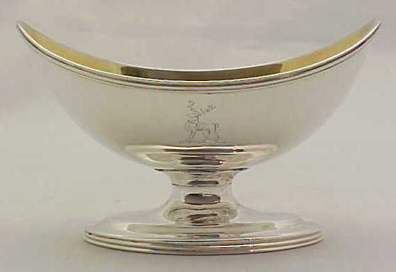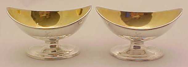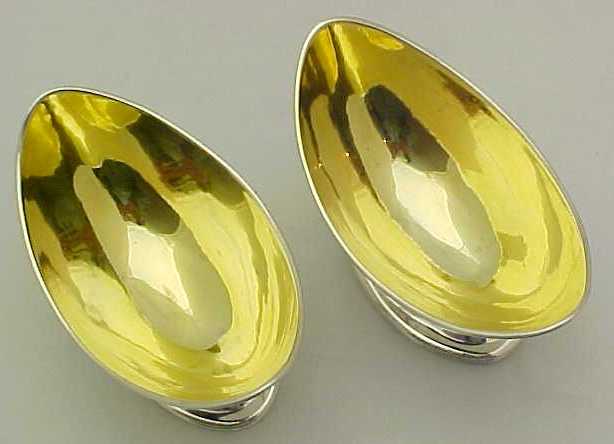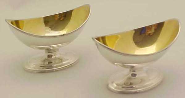 Beautiful pair of Georgian silver navette pedestal salts with gilded interiors, thread borders and a crest engraving. |