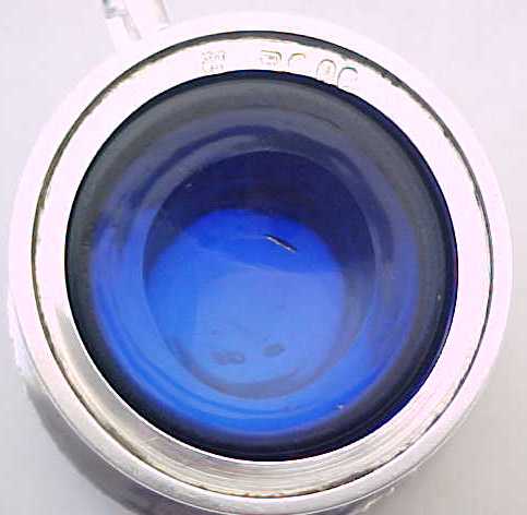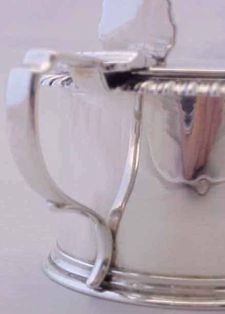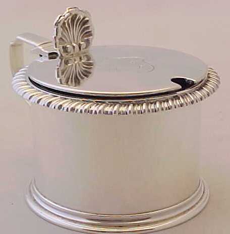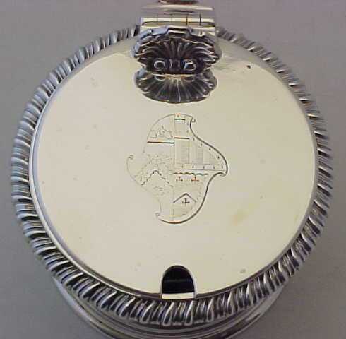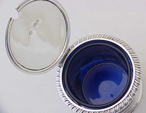 Very good Victorian silver mustard pot with a gadrooned rim, shell thumb piece, engraved armorial and a replacement blue glass liner. |